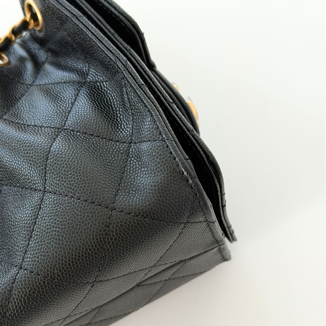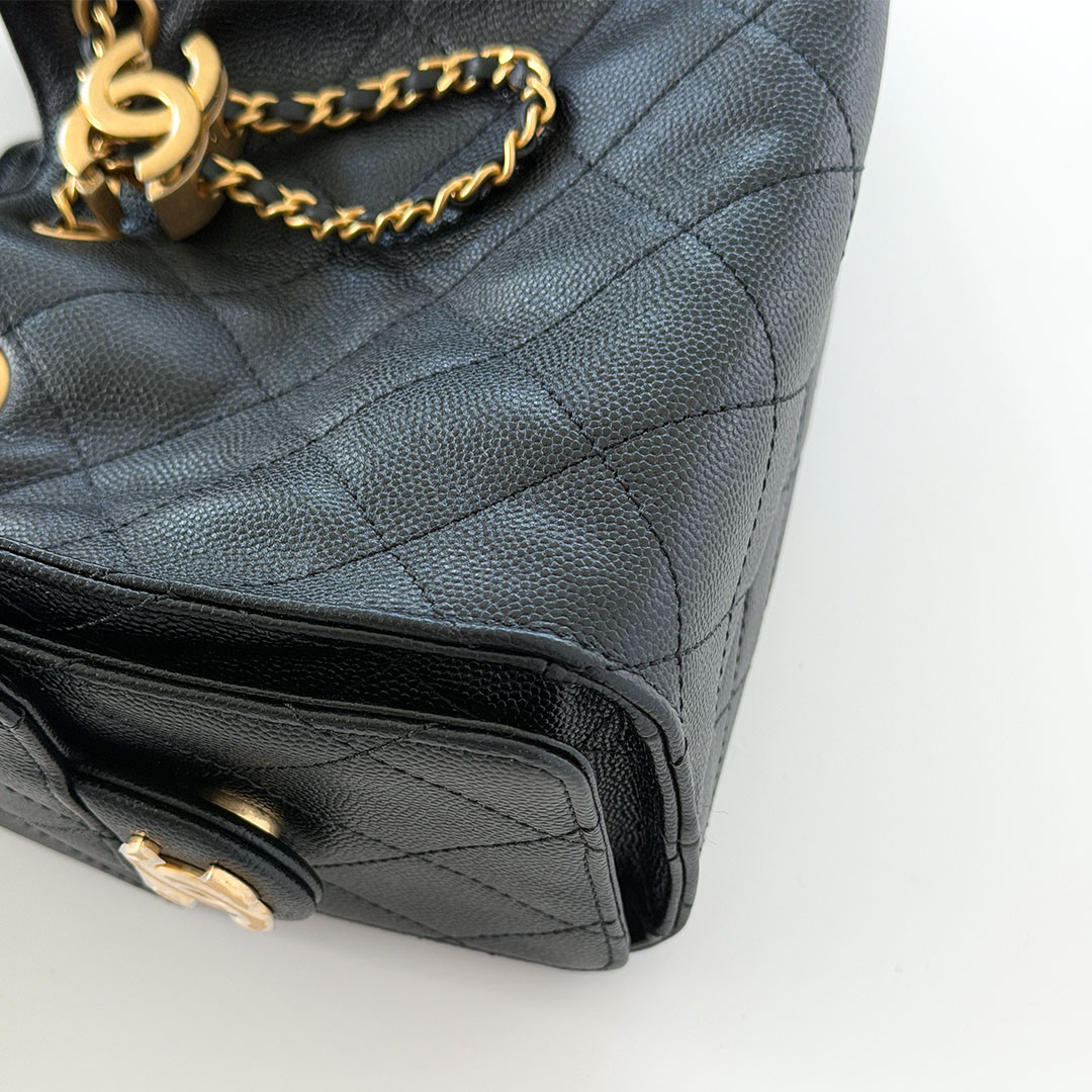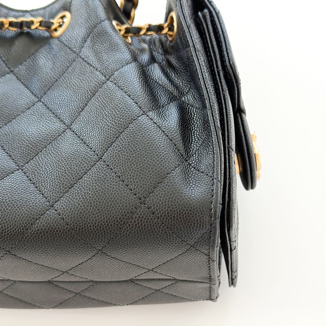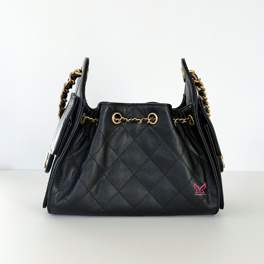 This versatile hobo bag has two exterior side pockets, providing easy access to daily essentials without compromising style. The bag features a drawstring closure. The interior is lined with matching black grosgrain fabric and includes three small slit pockets. Whether you're dressing up for an elegant evening or complementing a casual daytime outfit, this authentic CHANEL 25 Mini hobo bag adds effortless sophistication to any look.