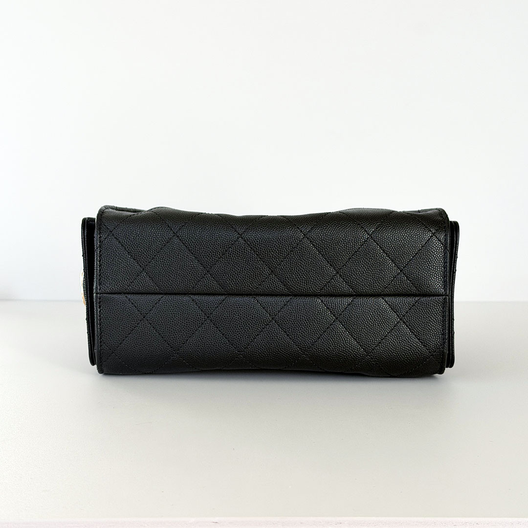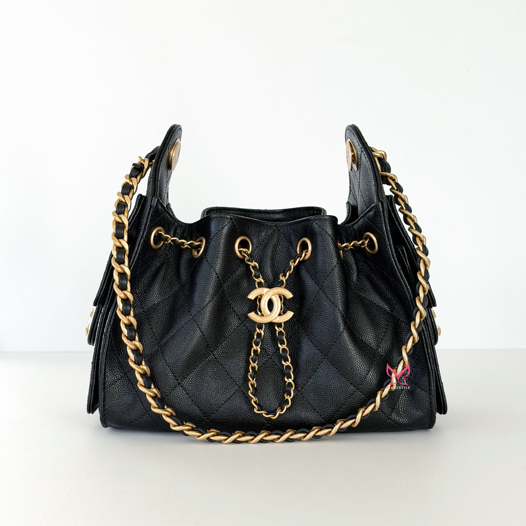 Introducing the CHANEL Mini 25 Hobo Bag 26C Black Quilted Caviar, an exquisite blend of sophistication and functionality from the coveted 26C collection. Crafted from luxurious black quilted caviar leather, this chic hobo embodies timeless elegance. The bag is adorned with antique-gold hardware and the iconic CHANEL diamond quilt pattern, adding a touch of opulence to any ensemble.