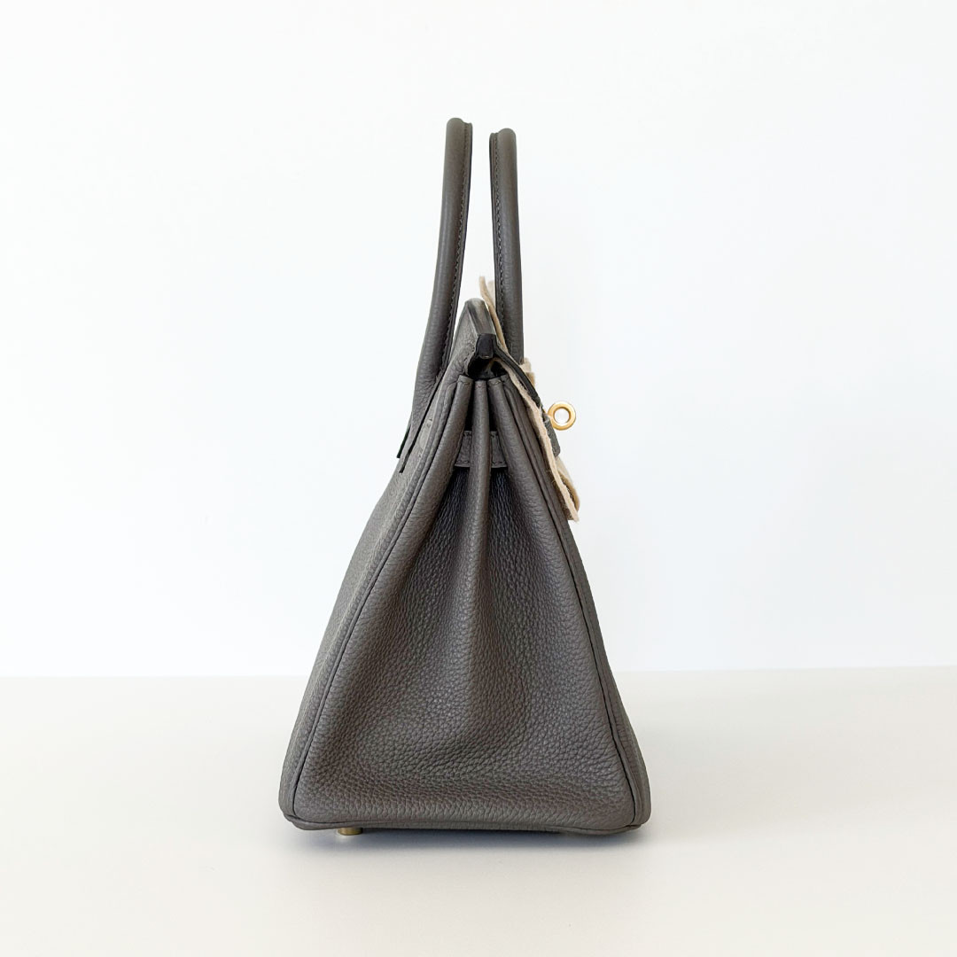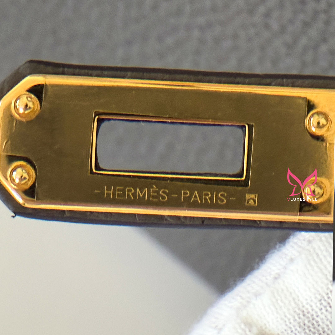 The Hermés Birkin 25cm Etain Togo is a luxurious and timeless handbag. Crafted from grained calfskin leather in versatile medium gray, known for its durability and scratch resistance, this luxurious piece is designed to stand the test of time. The exquisite gold hardware beautifully complements the gray leather, adding a touch of modern elegance. Perfectly sized at 25cm, this Birkin bag is spacious enough to hold all your essentials.