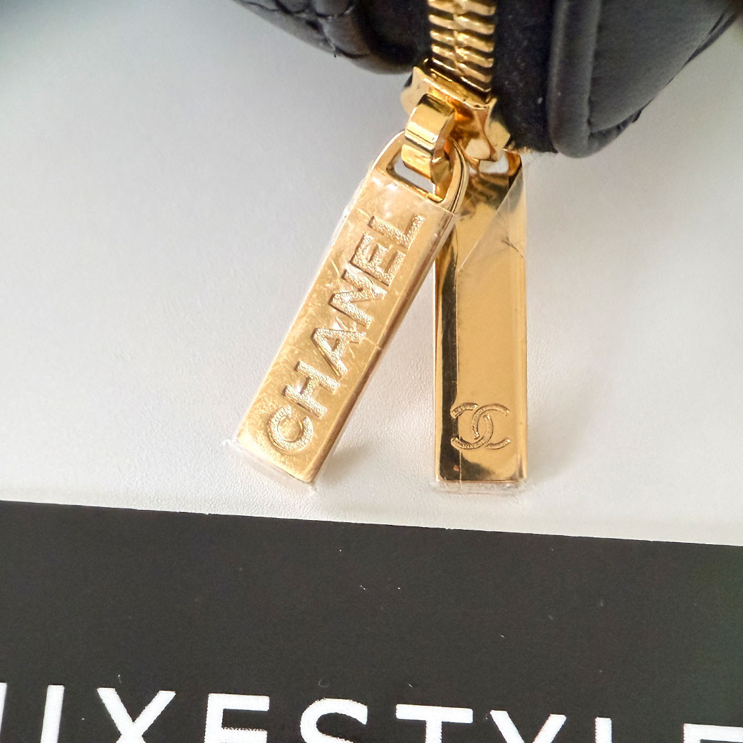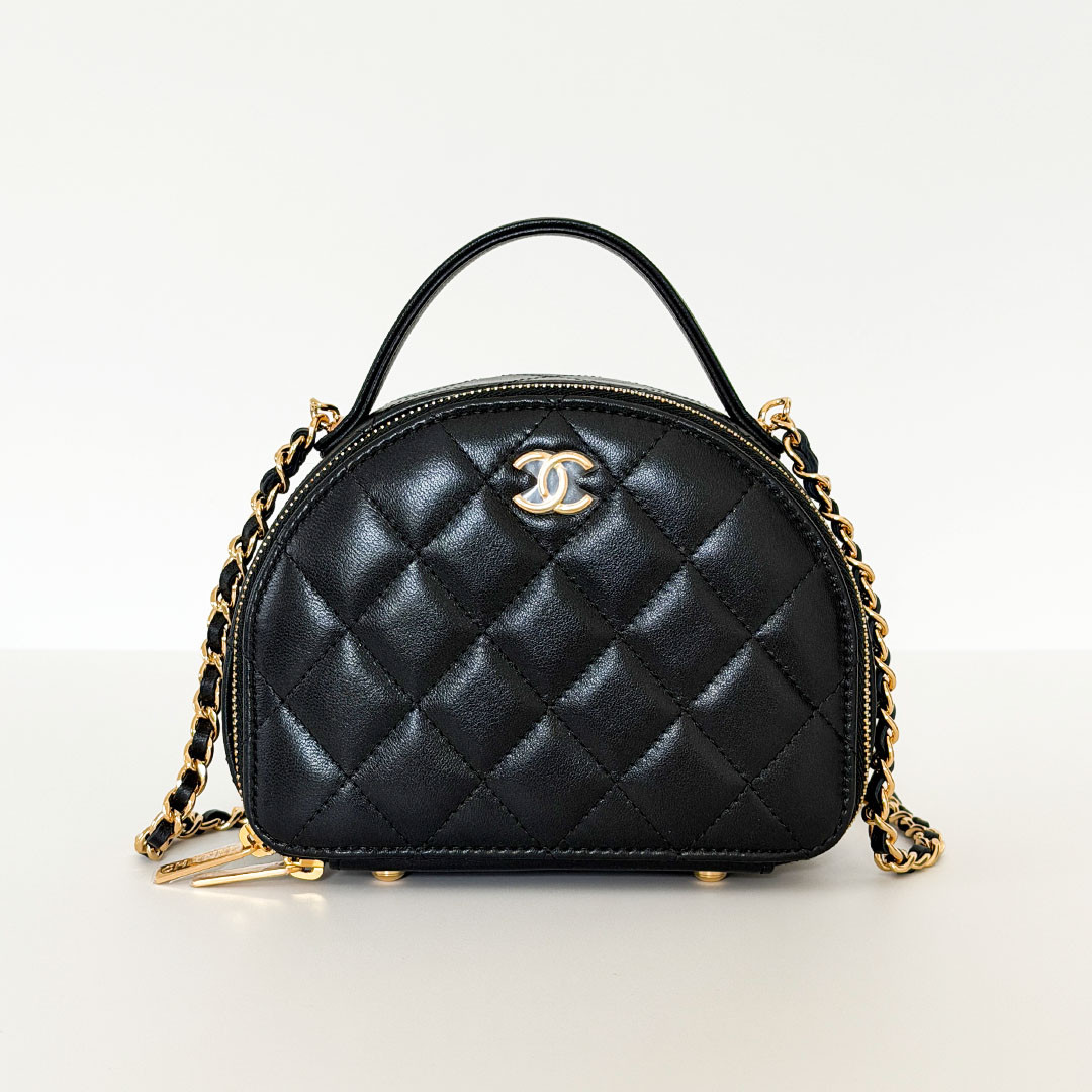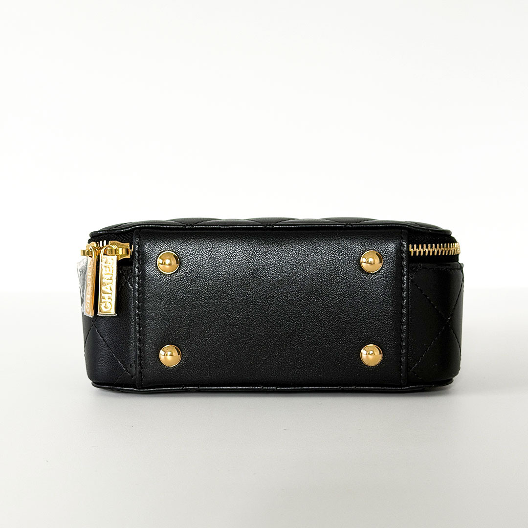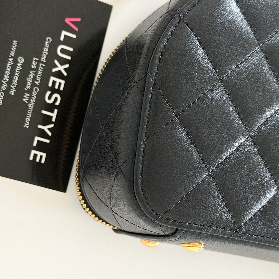 The CHANEL Chic Riviera 23C Top Handle Vanity Case in Black Lambskin is the perfect blend of elegance and versatility. This authentic CHANEL piece is crafted of luxurious quilted lambskin leather in classic black and gold hardware. It features a leather top handle for a classic carry option and a leather-threaded gold chain-link shoulder strap for versatile cross-body wear. The vanity case opens with a secure zipper and has an elegant beige fabric interior. Whether used as a cross-body for everyday chic or as a standout accessory for a night out, this Chanel vanity case makes a stunning statement piece with any ensemble.