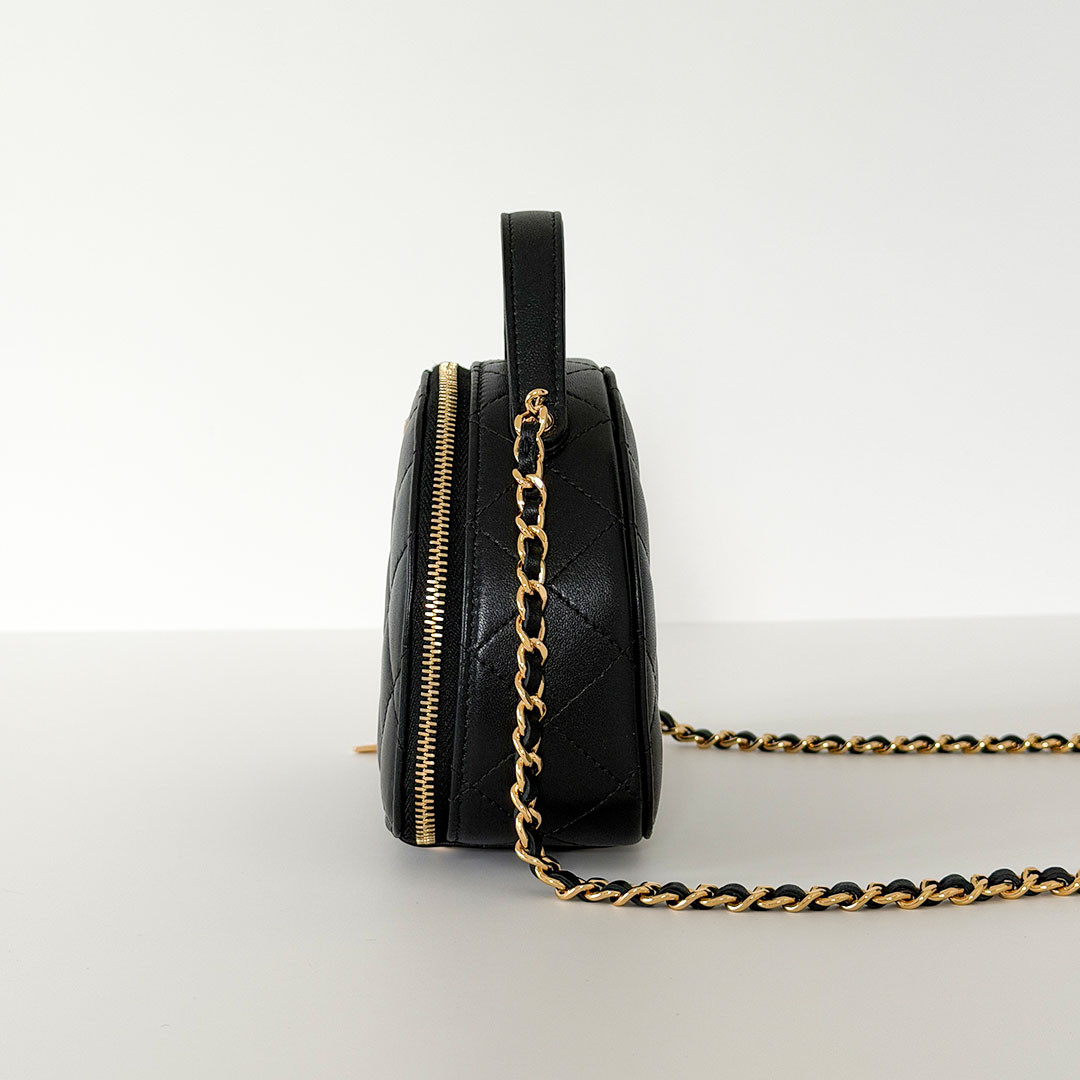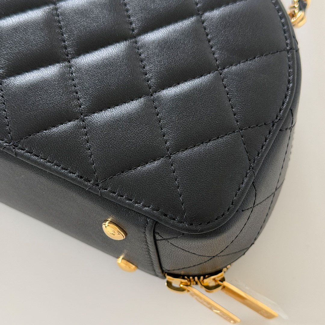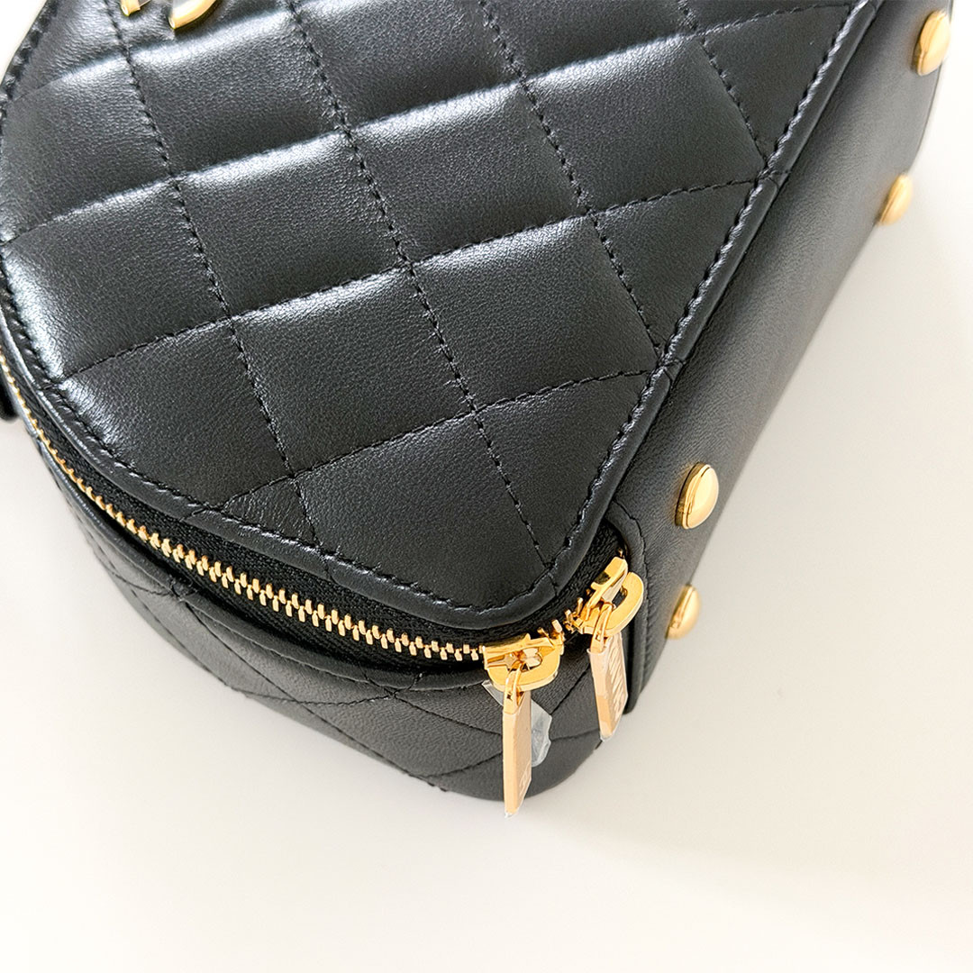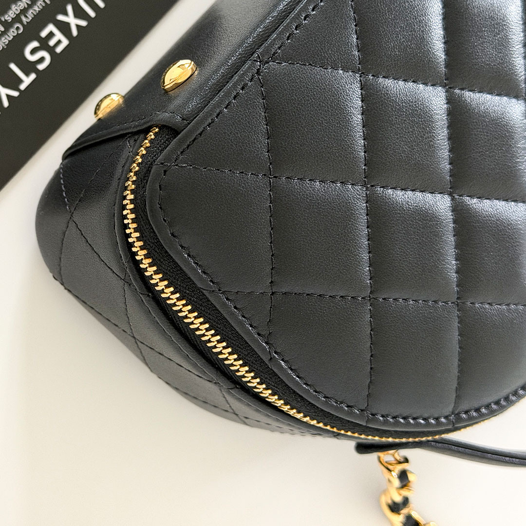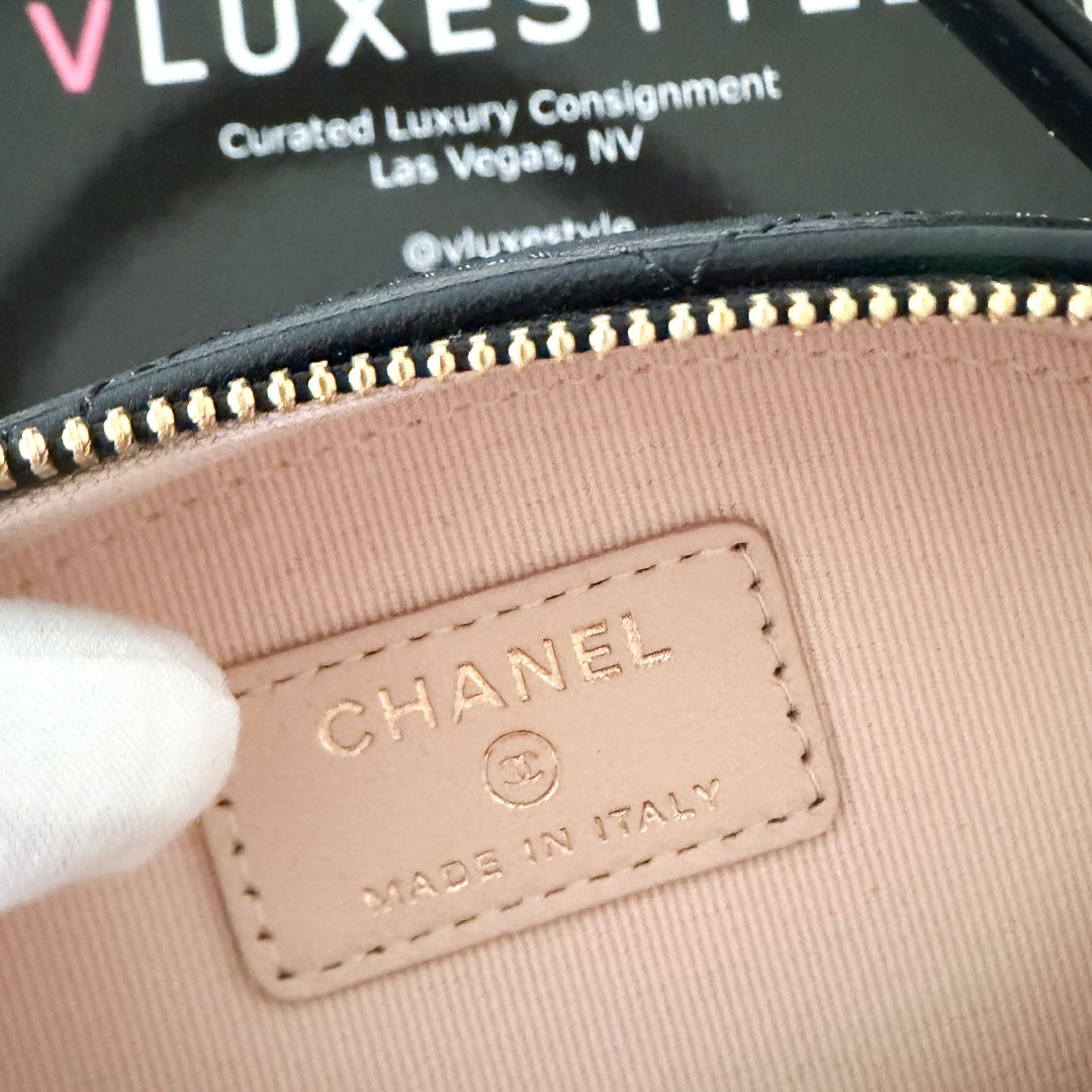 The CHANEL Chic Riviera 23C Top Handle Vanity Case in Black Lambskin is the perfect blend of elegance and versatility. This authentic CHANEL piece is crafted of luxurious quilted lambskin leather in classic black and gold hardware. It features a leather top handle for a classic carry option and a leather-threaded gold chain-link shoulder strap for versatile cross-body wear. The vanity case opens with a secure zipper and has an elegant beige fabric interior. Whether used as a cross-body for everyday chic or as a standout accessory for a night out, this Chanel vanity case makes a stunning statement piece with any ensemble.