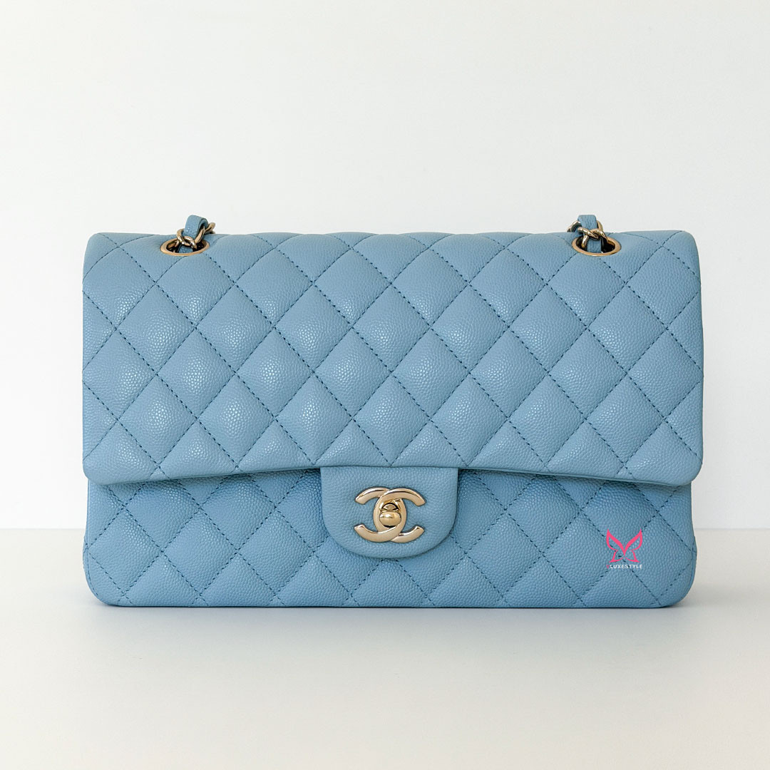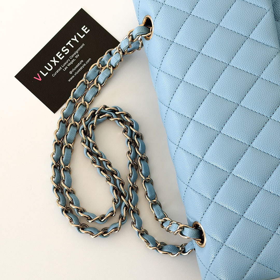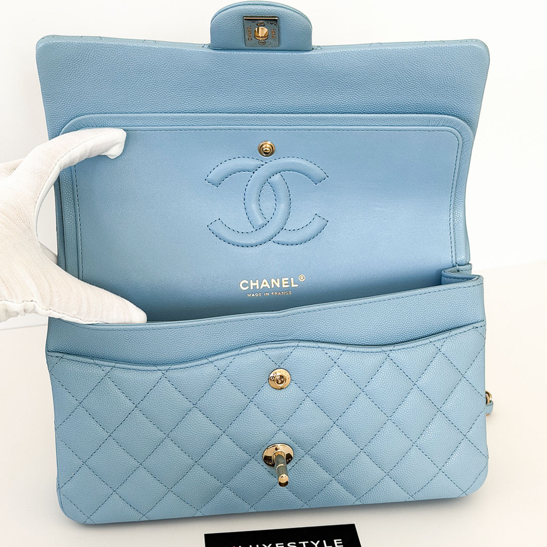 The Classic Medium Double Flap 23P Light Blue Quilted Caviar, featuring light gold hardware by CHANEL, is a luxurious and iconic shoulder bag with timeless elegance. Crafted from durable caviar leather in a stunning light blue color, it's the perfect pop of color that effortlessly transforms any look. The iconic double-flap design adds a touch of sophistication, and light gold hardware adds a touch of elegance, making it the perfect statement piece for any occasion.