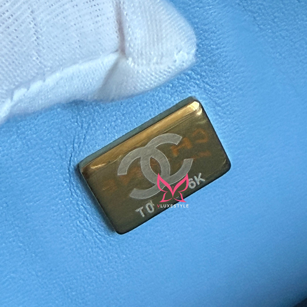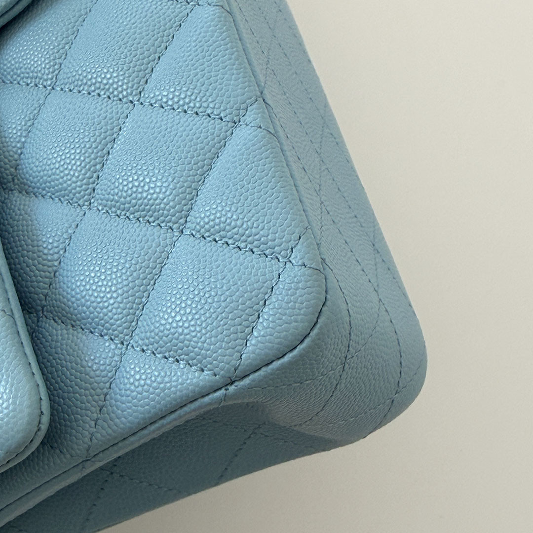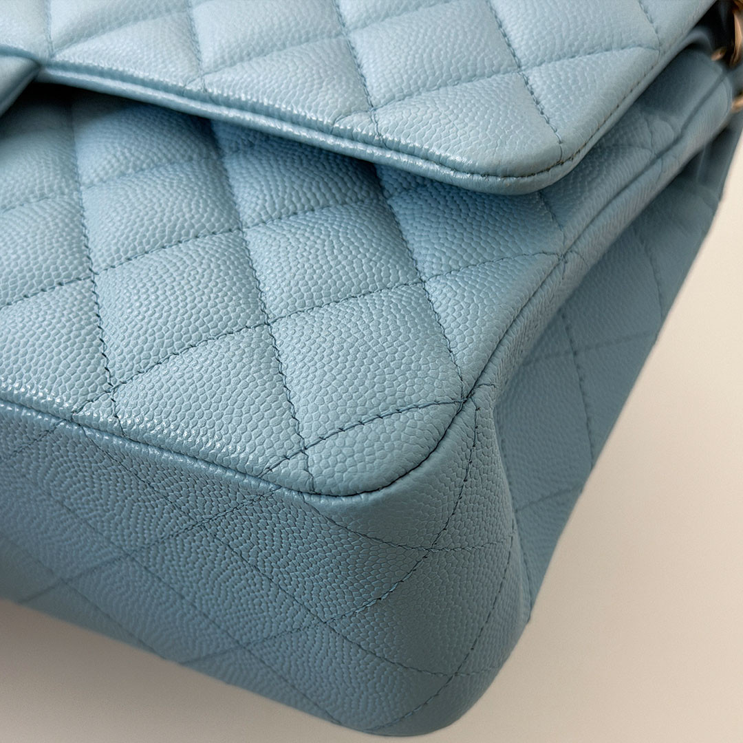 The Classic Medium Double Flap 23P Light Blue Quilted Caviar, featuring light gold hardware by CHANEL, is a luxurious and iconic shoulder bag with timeless elegance. Crafted from durable caviar leather in a stunning light blue color, it's the perfect pop of color that effortlessly transforms any look. The iconic double-flap design adds a touch of sophistication, and light gold hardware adds a touch of elegance, making it the perfect statement piece for any occasion.