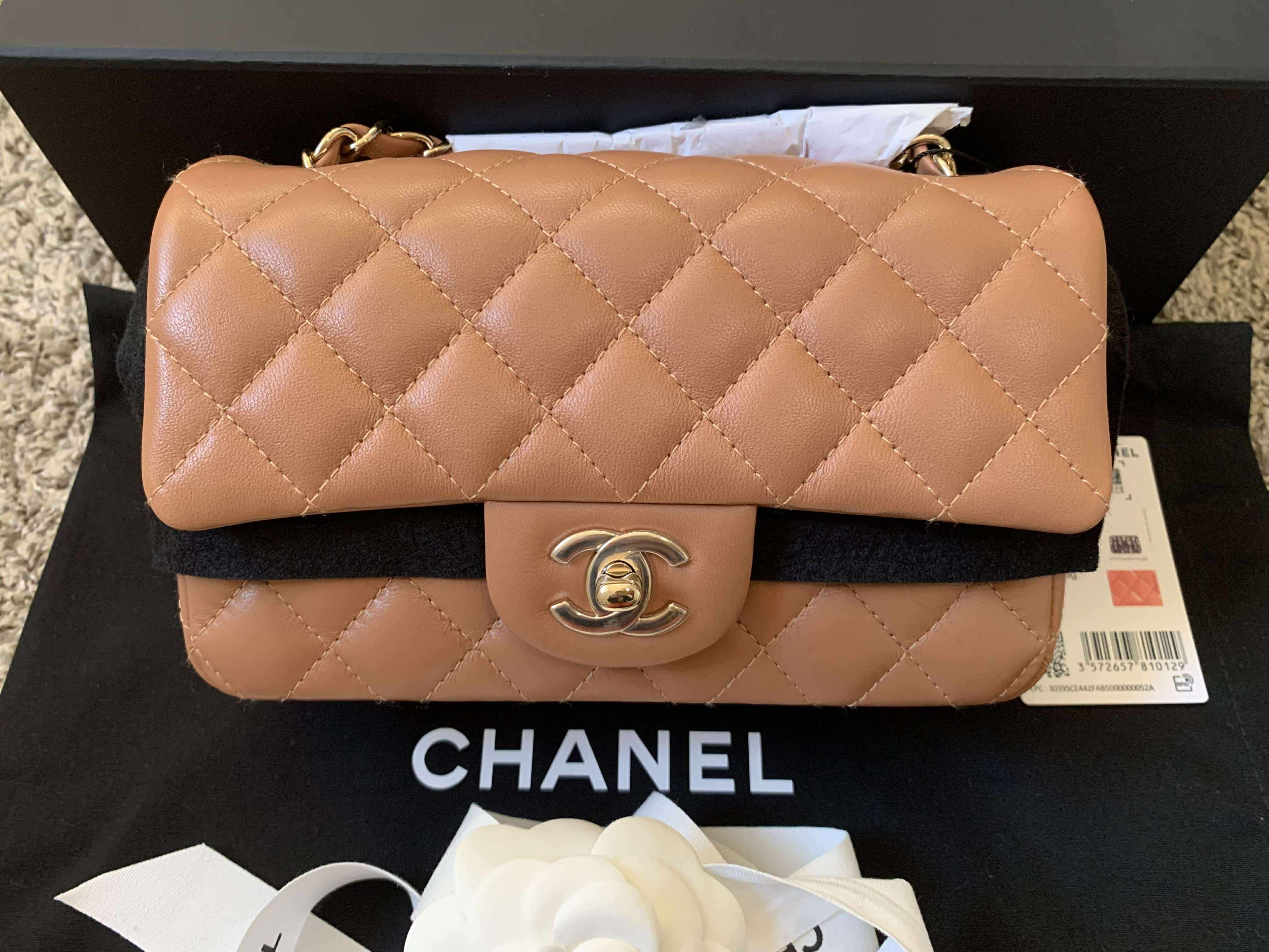 The CHANEL Classic Mini Rectangular Flap 22S in Caramel Quilted Lambskin effortlessly combines elegance and timeless sophistication. Crafted from luxurious lambskin leather, this exquisite bag features a rich caramel hue that perfectly complements the light gold hardware.