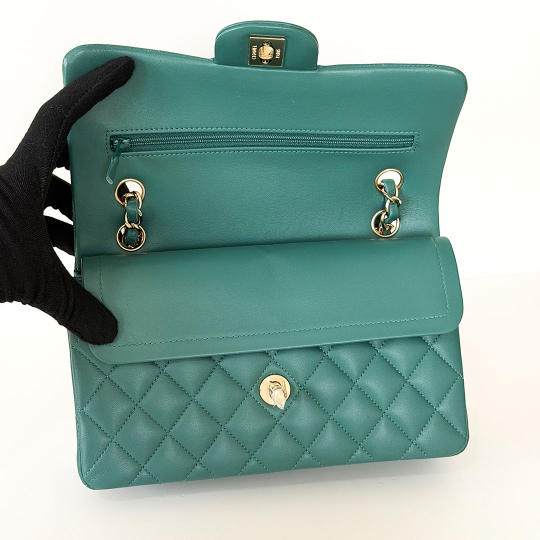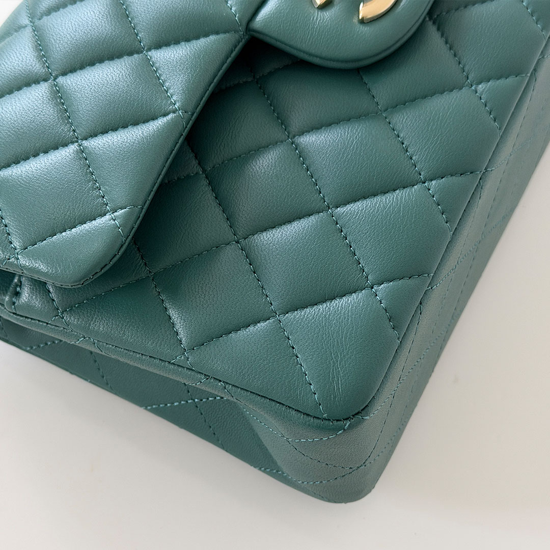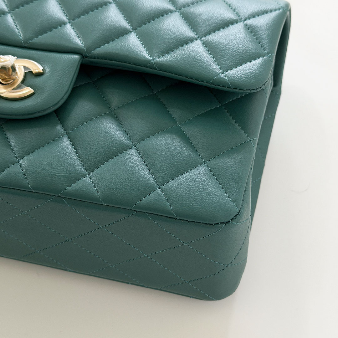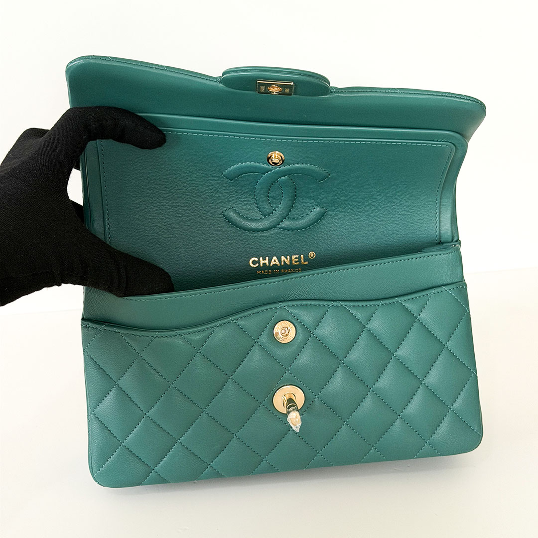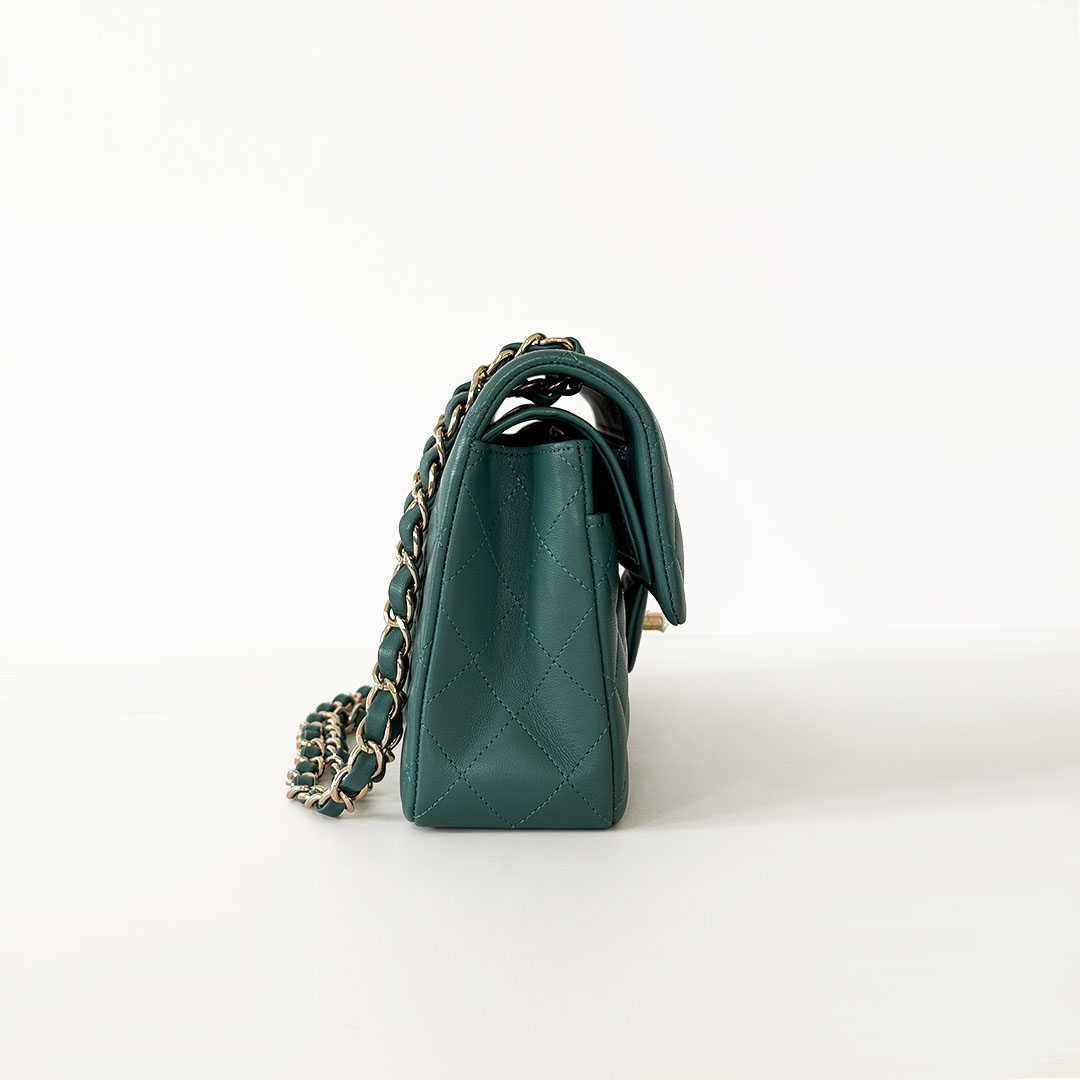 The Classic Small Double Flap 21A Green Quilted Lambskin, featuring light gold hardware by CHANEL, is an exquisite and iconic shoulder bag with timeless elegance. This shoulder bag is crafted from luxurious lambskin leather in the stunning green color. It's versatile, adding a pop of color that effortlessly complements any wardrobe, and the light gold hardware adds a touch of elegance, making it a perfect piece for any occasion.