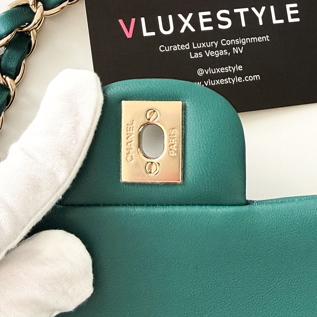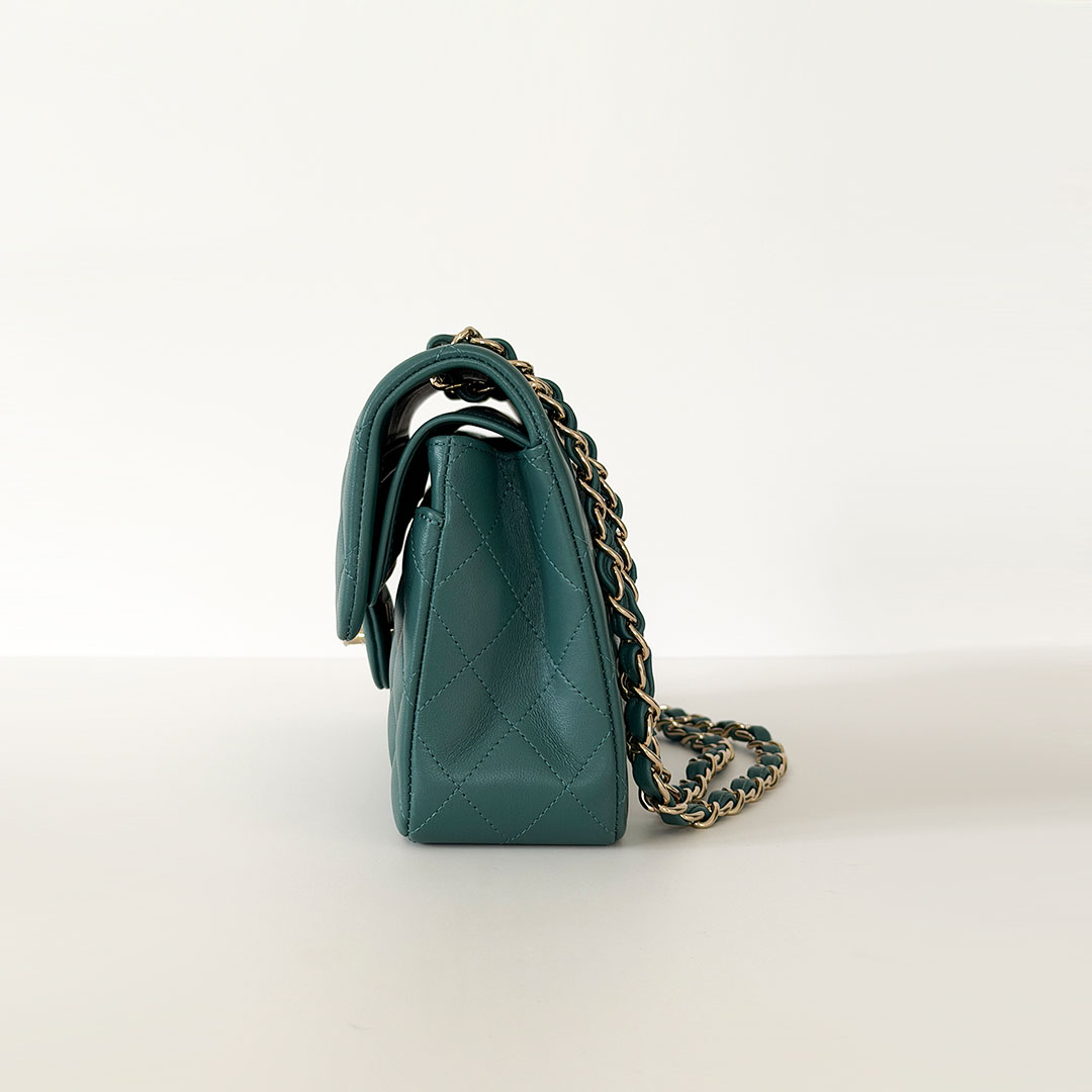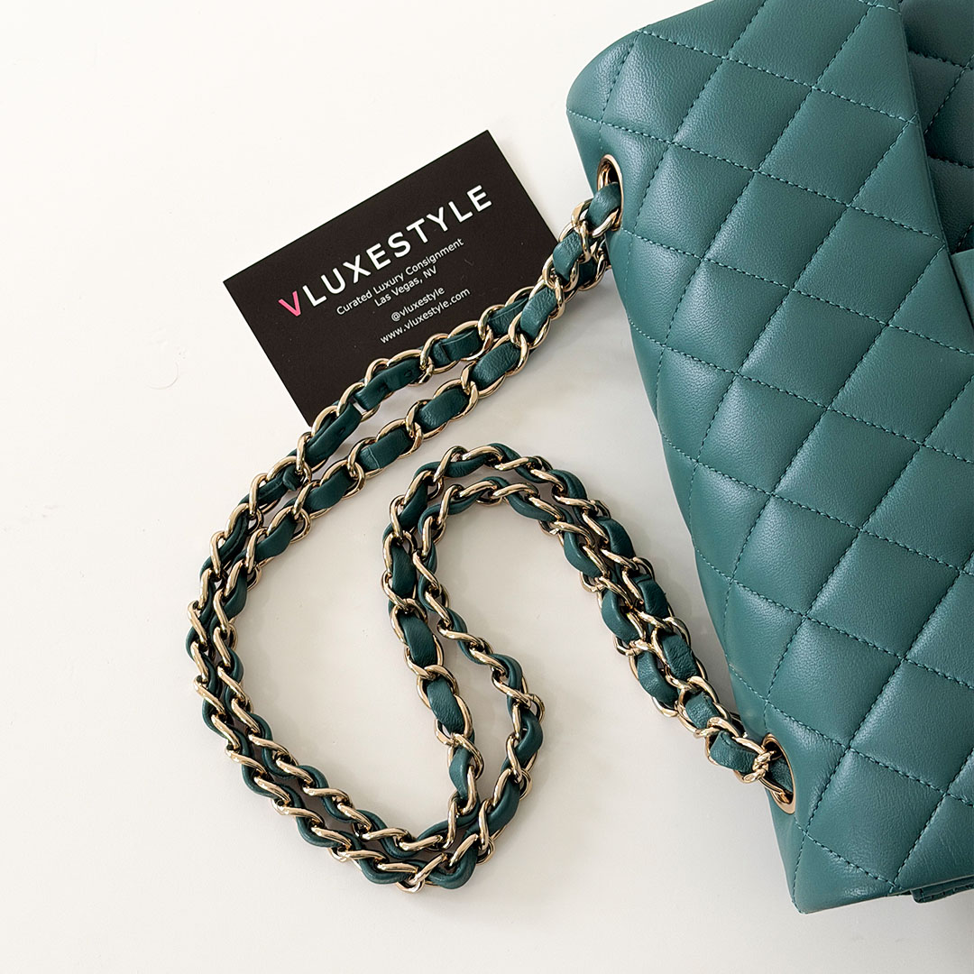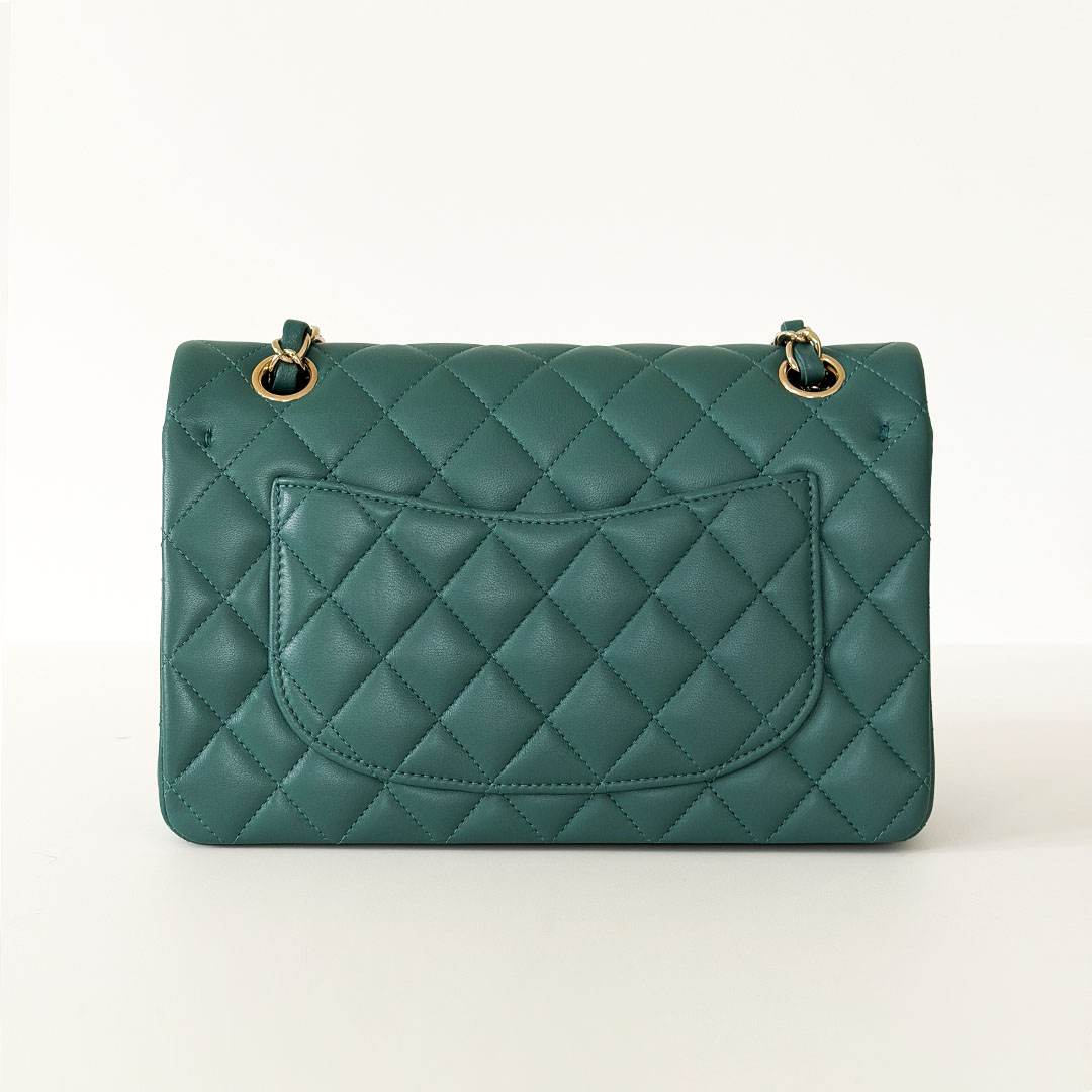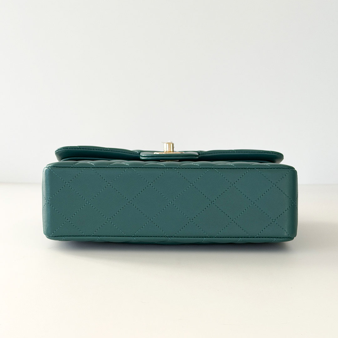 The Classic Small Double Flap 21A Green Quilted Lambskin, featuring light gold hardware by CHANEL, is an exquisite and iconic shoulder bag with timeless elegance. This shoulder bag is crafted from luxurious lambskin leather in the stunning green color. It's versatile, adding a pop of color that effortlessly complements any wardrobe, and the light gold hardware adds a touch of elegance, making it a perfect piece for any occasion.