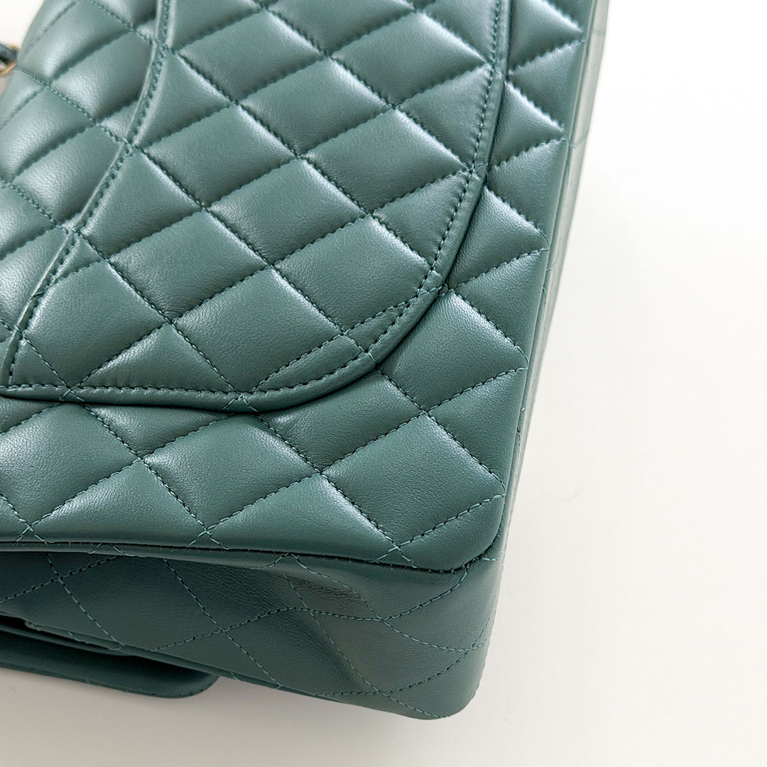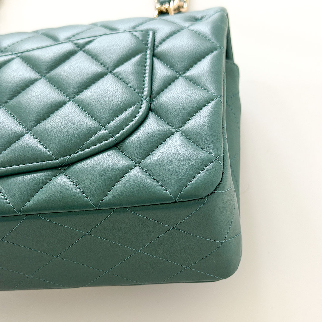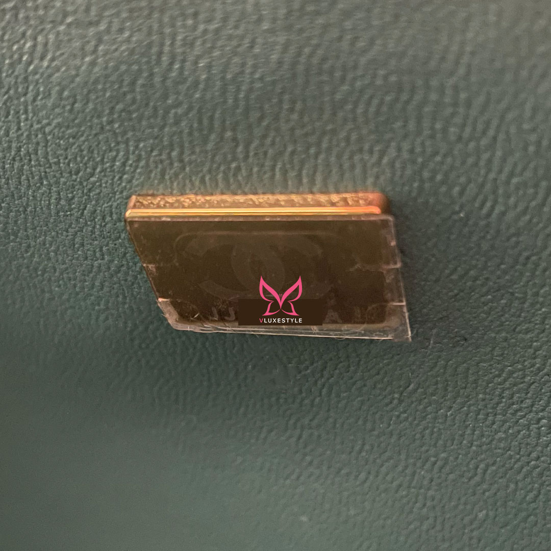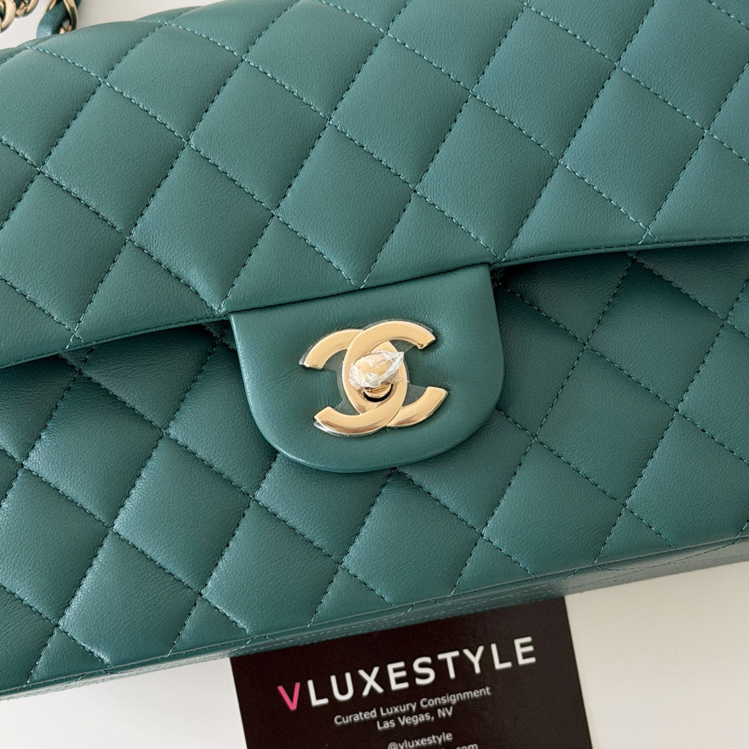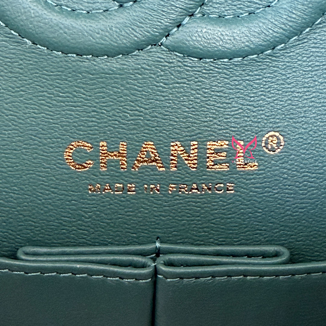 The Classic Small Double Flap 21A Green Quilted Lambskin, featuring light gold hardware by CHANEL, is an exquisite and iconic shoulder bag with timeless elegance. This shoulder bag is crafted from luxurious lambskin leather in the stunning green color. It's versatile, adding a pop of color that effortlessly complements any wardrobe, and the light gold hardware adds a touch of elegance, making it a perfect piece for any occasion.