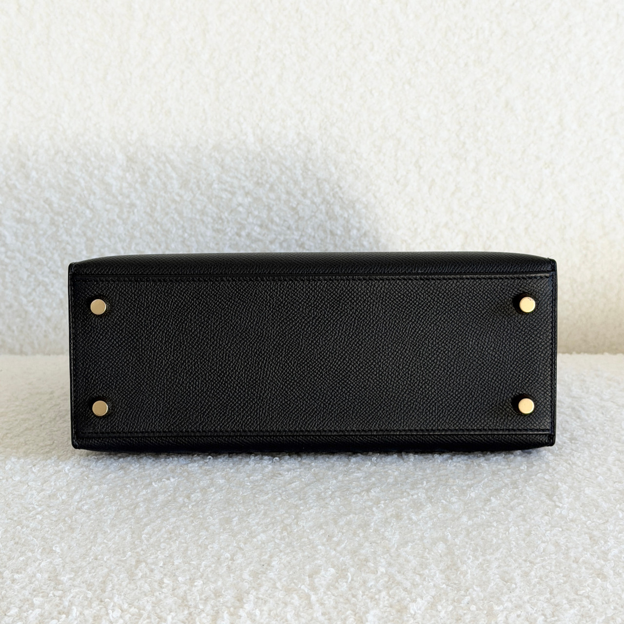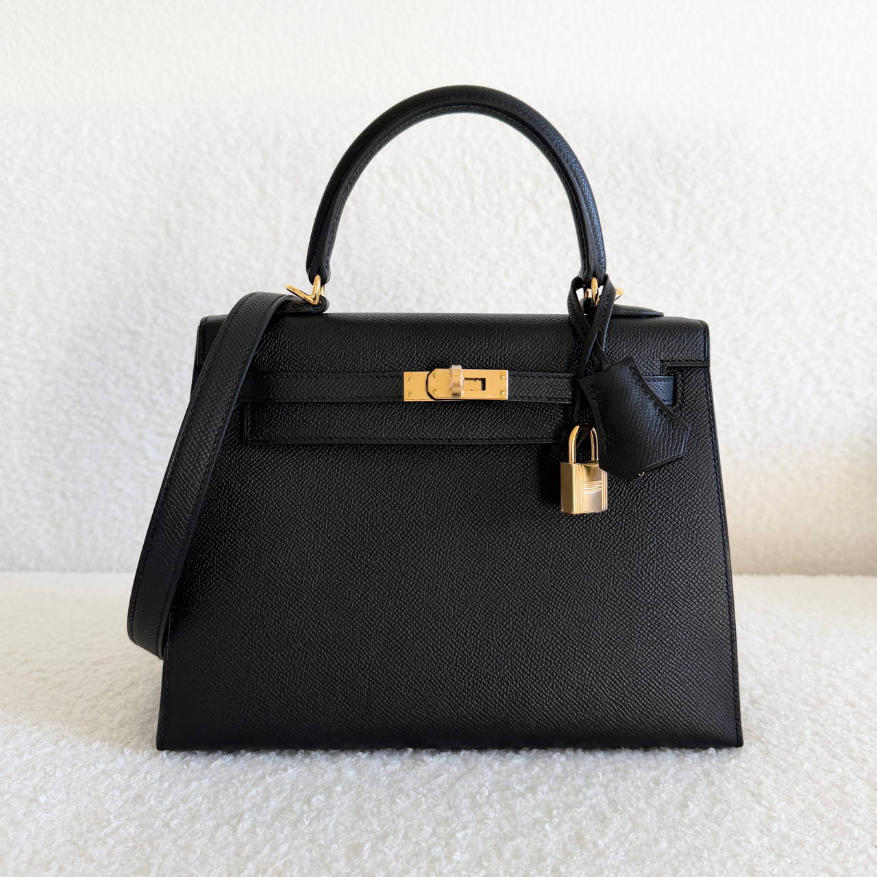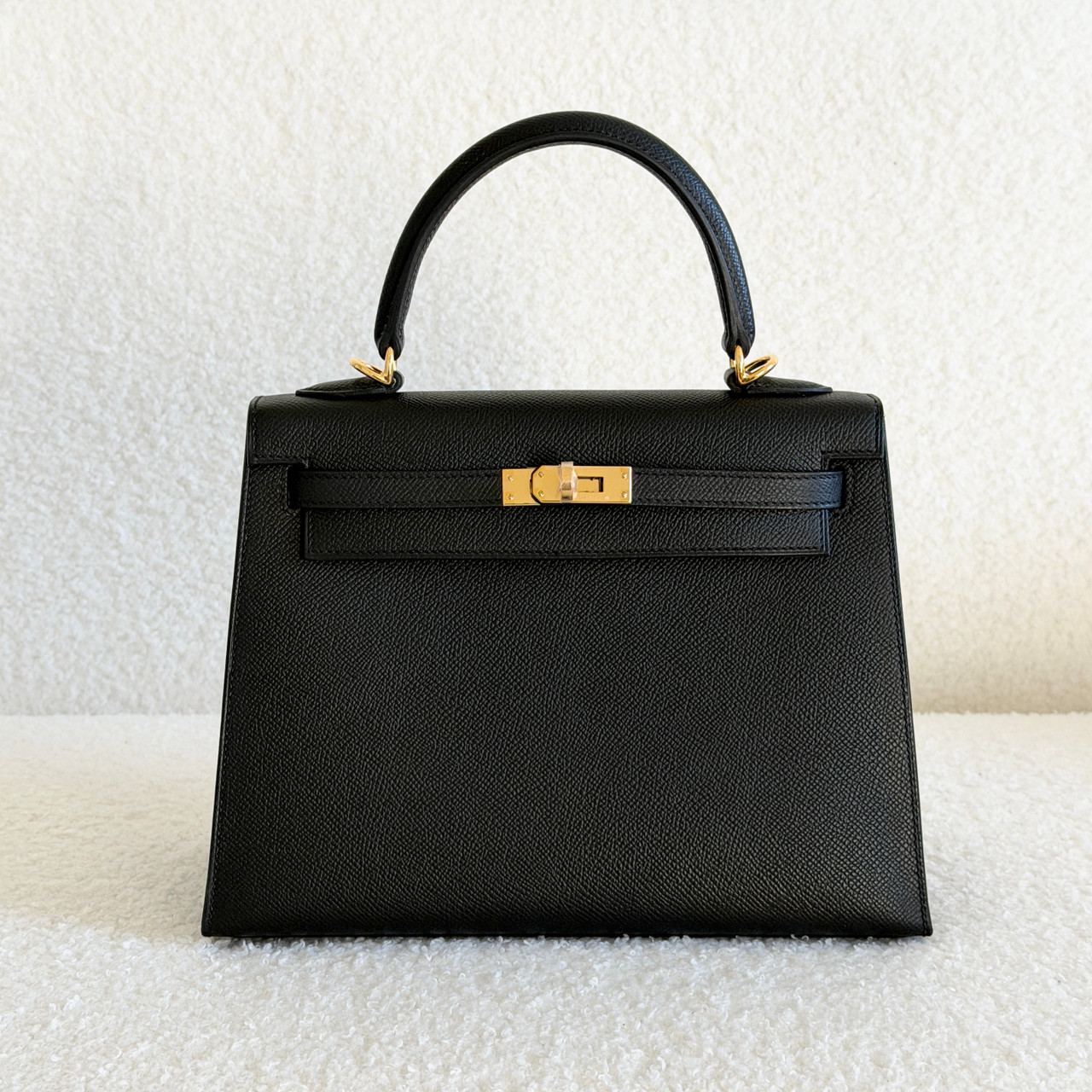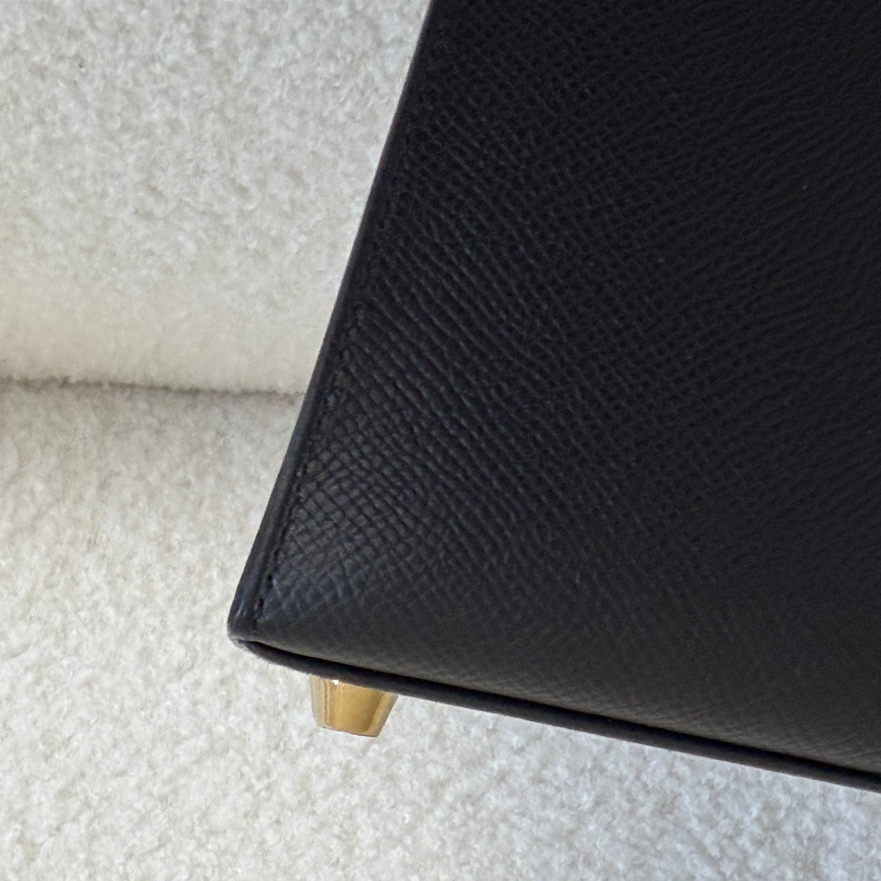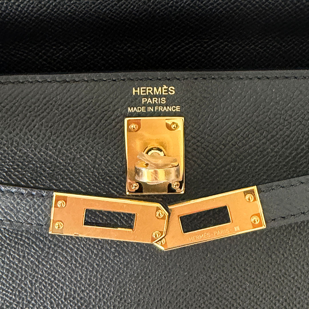 The Hermes Kelly 25 Sellier Black Epsom with Gold Hardware is a true symbol of luxury and elegance. This iconic handbag is crafted from luxurious black calfskin leather with gold-plated hardware. The classic design features a leather top handle for sophisticated carry and an optional shoulder strap for versatility.