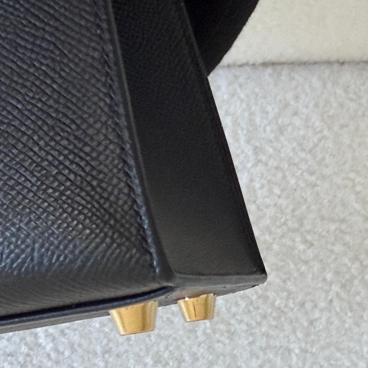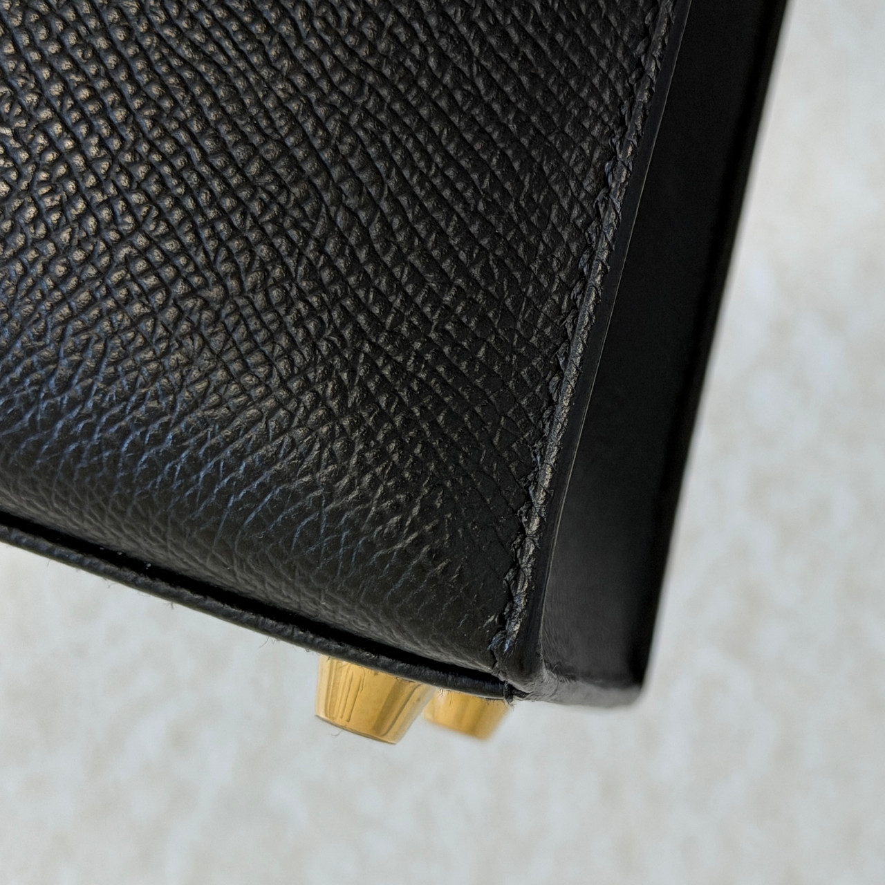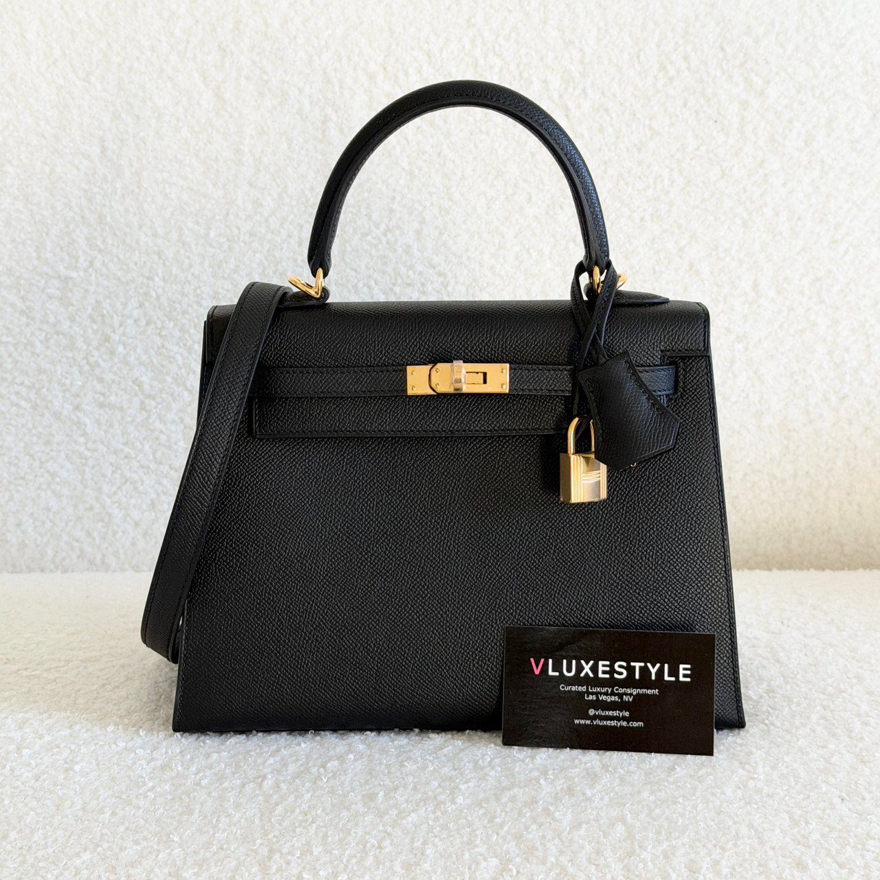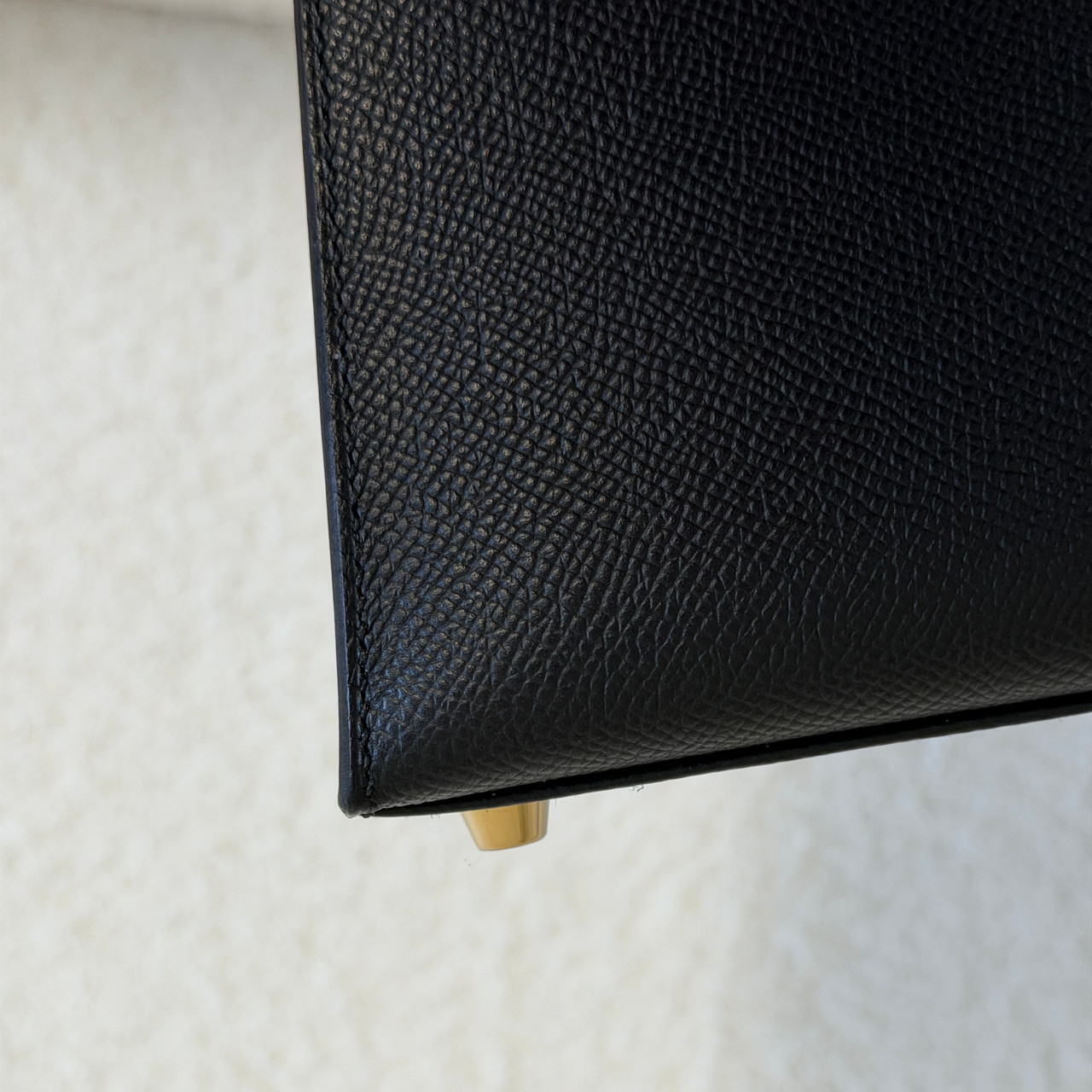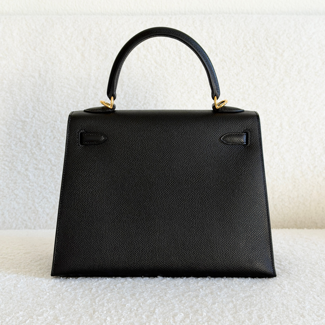 The Hermes Kelly 25 Sellier Black Epsom with Gold Hardware is a true symbol of luxury and elegance. This iconic handbag is crafted from luxurious black calfskin leather with gold-plated hardware. The classic design features a leather top handle for sophisticated carry and an optional shoulder strap for versatility.
