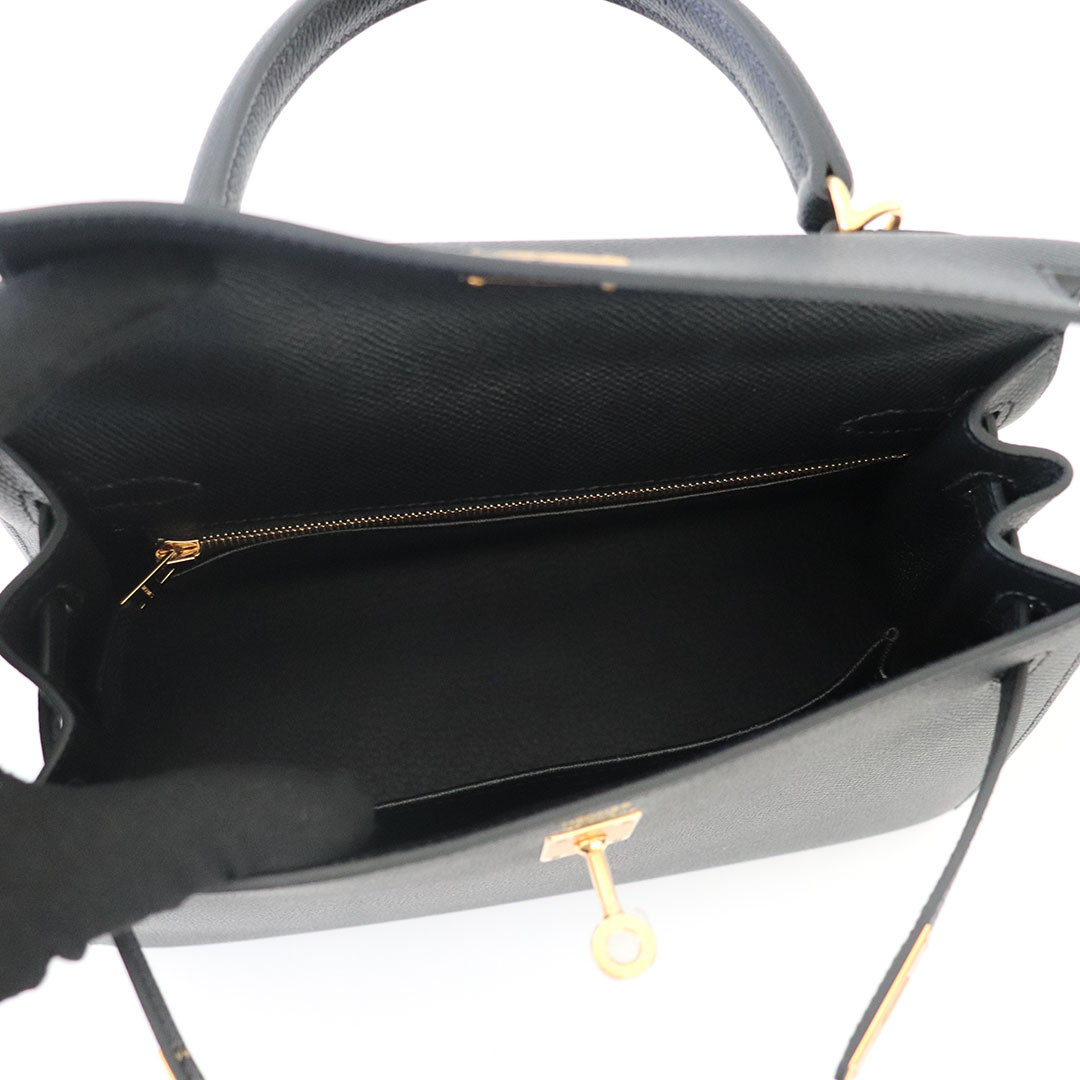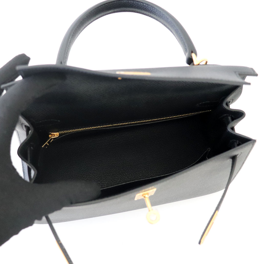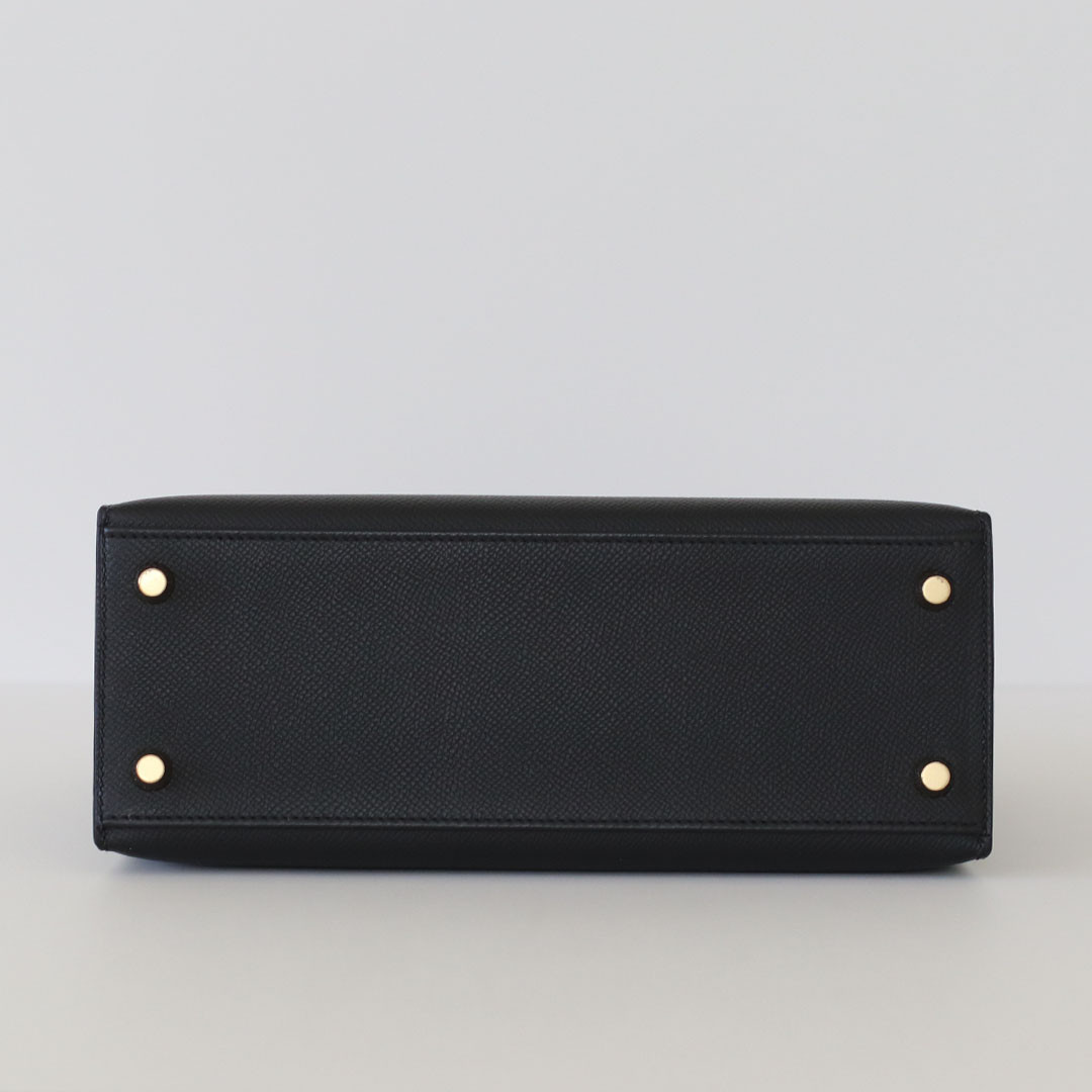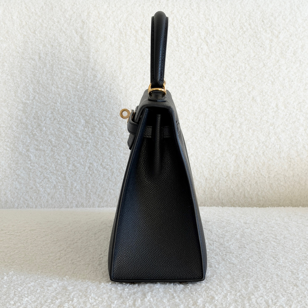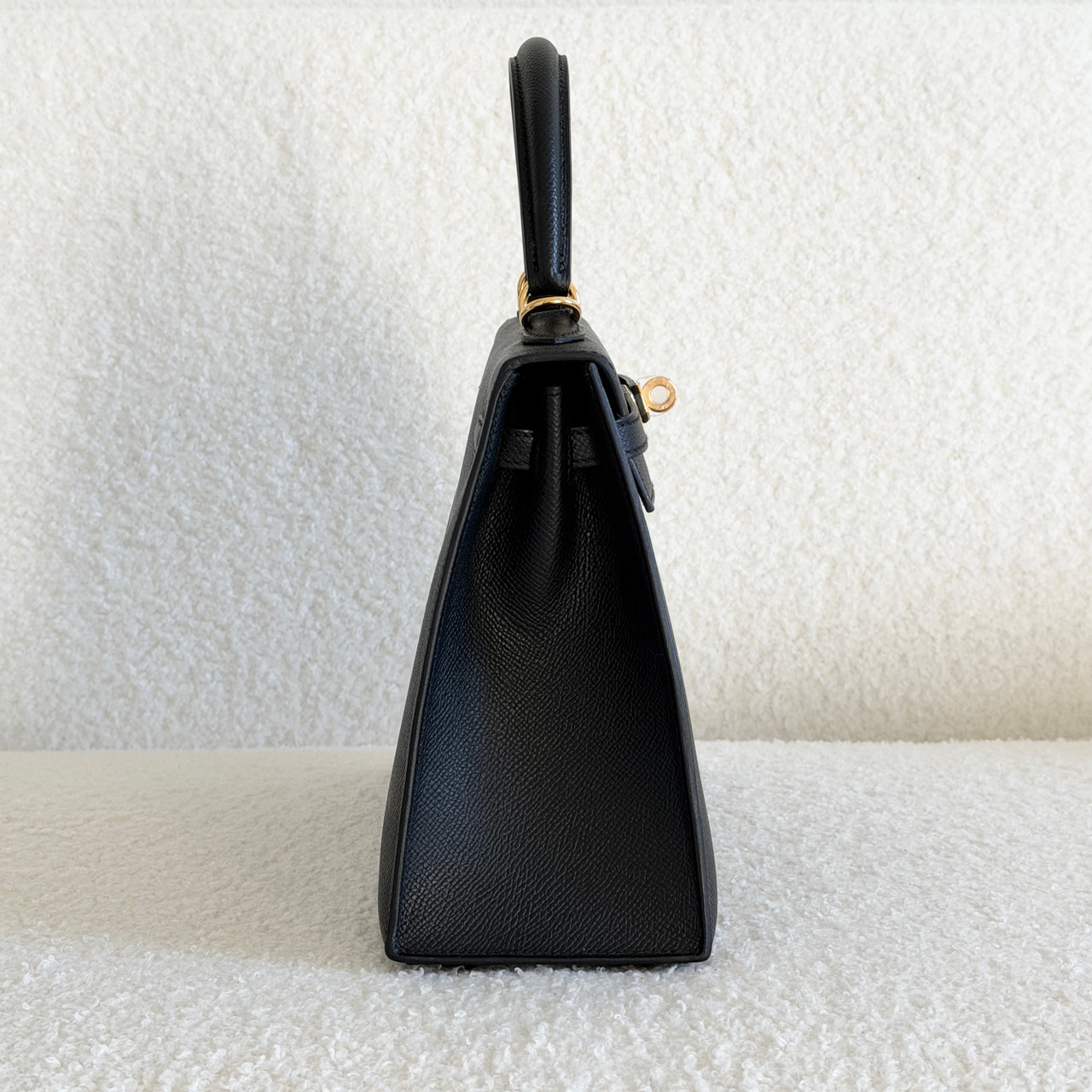The Hermes Kelly 25 Sellier Black Epsom with Gold Hardware is a true symbol of luxury and elegance. This iconic handbag is crafted from luxurious black calfskin leather with gold-plated hardware. The classic design features a leather top handle for sophisticated carry and an optional shoulder strap for versatility.