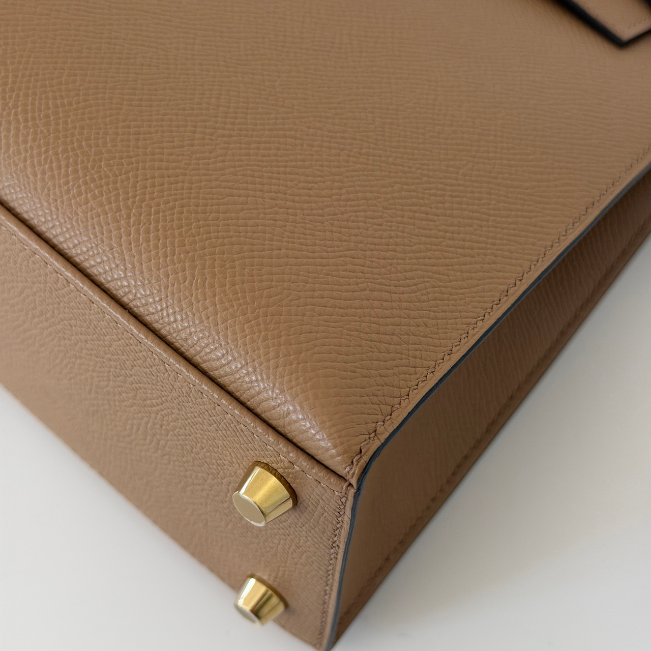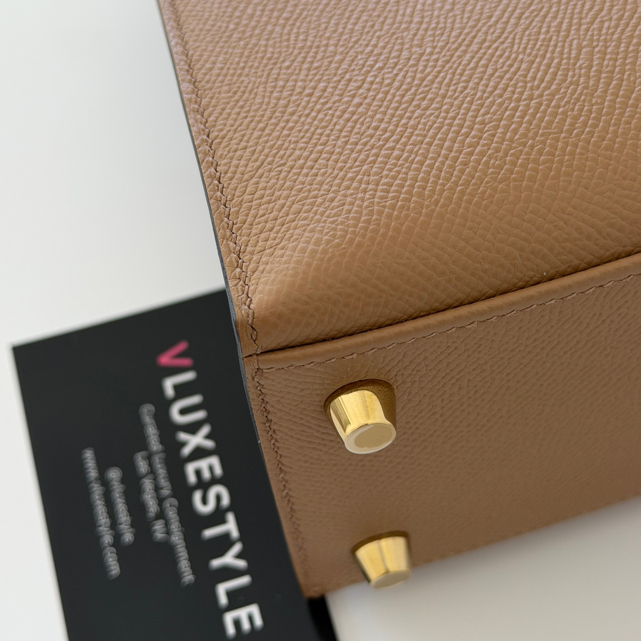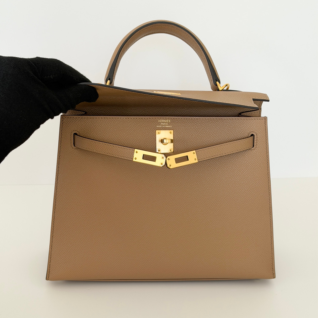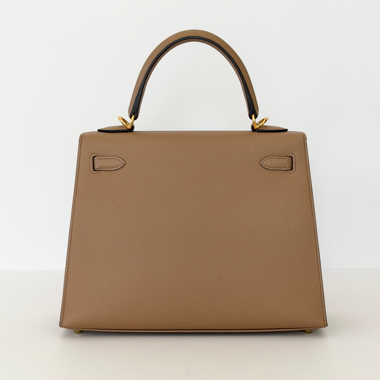 The Hermes Kelly 25 Sellier Chai Epsom with Gold Hardware is a true symbol of luxury and elegance. This iconic handbag is crafted from luxurious, warm, milky brown or beige calfskin leather with gold-plated hardware. The classic design features a leather top handle for sophisticated carry and an optional shoulder strap for versatility.