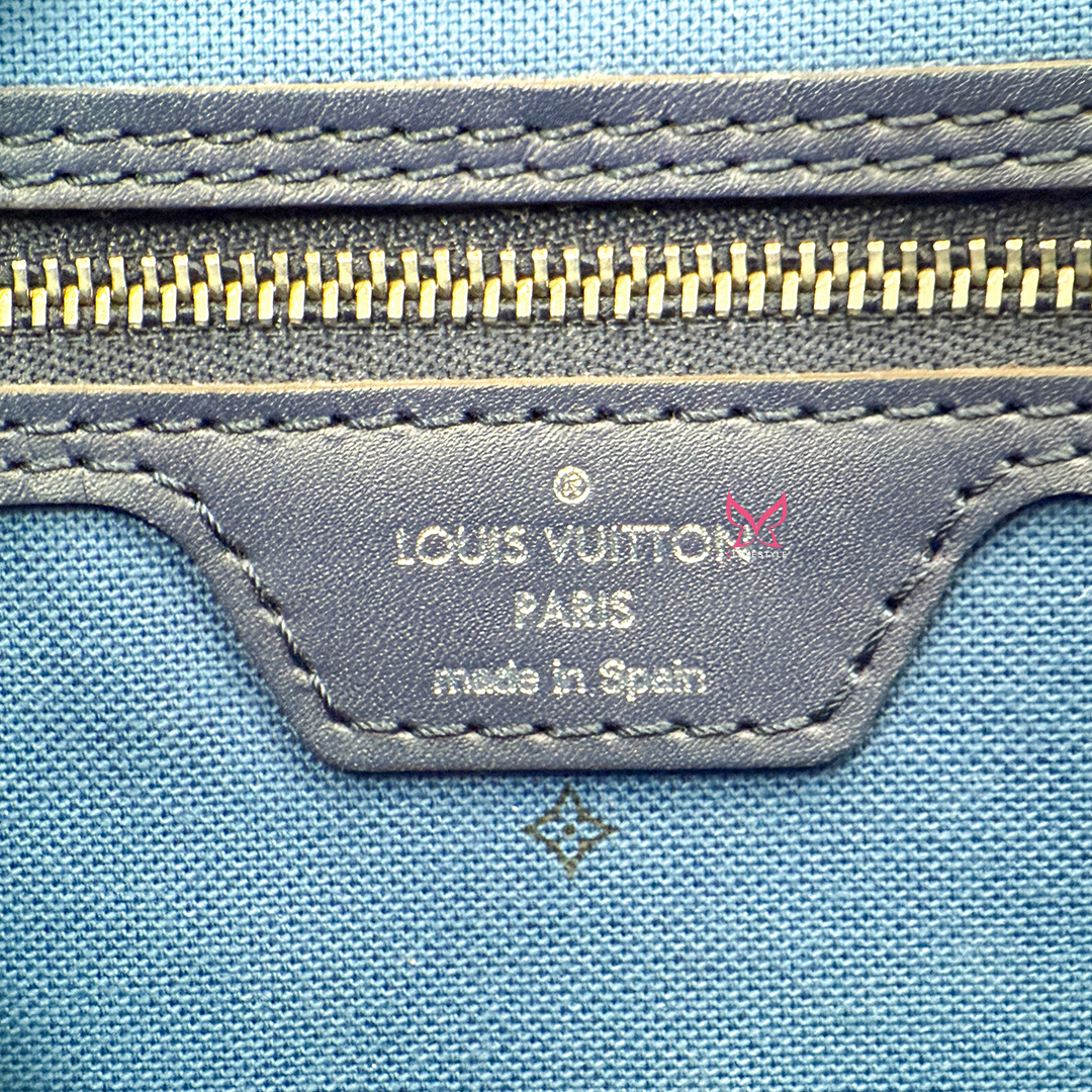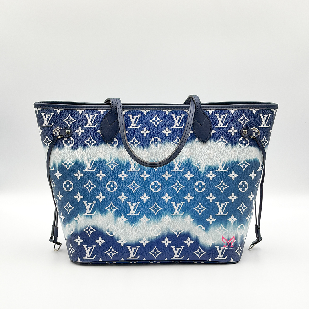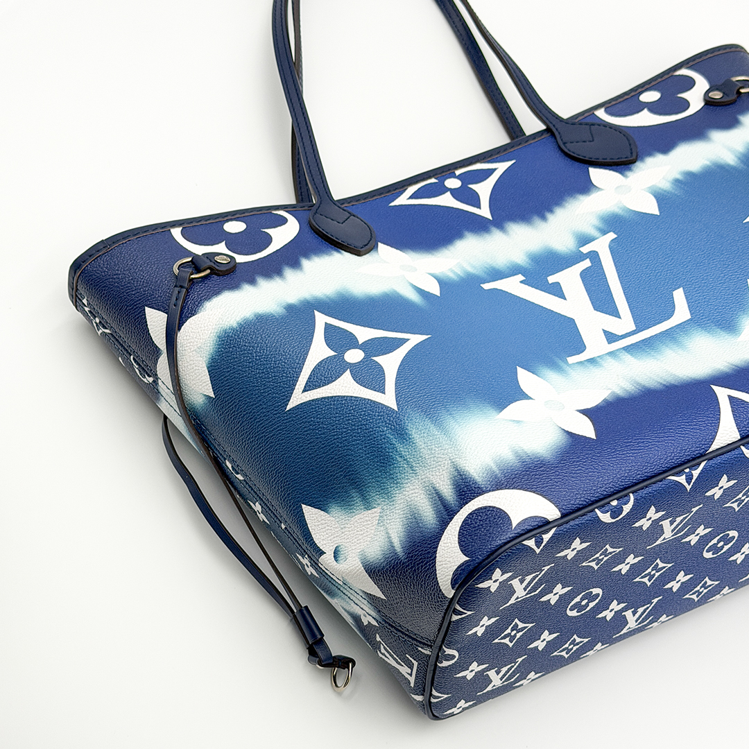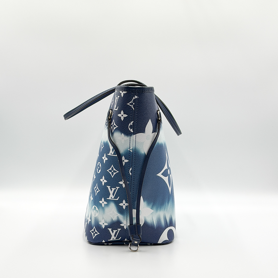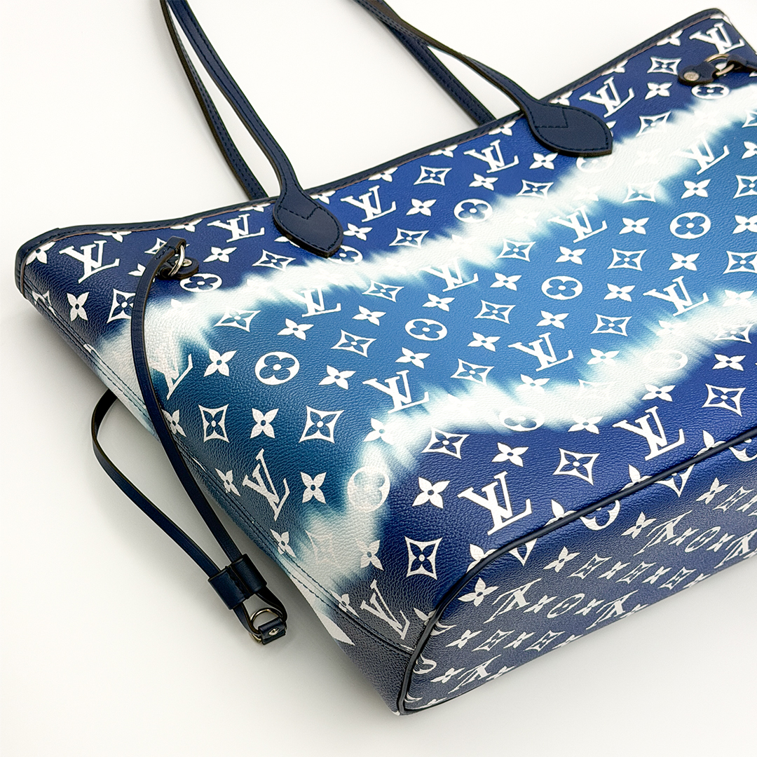 This Limited Edition Louis Vuitton Neverfull Tote MM in Jungle Dots Monogram from the exclusive Summer 2020 collection, inspired by the Japanese shibori tie-dye technique, is more than just a tote—it's a statement piece. Crafted of coated canvas, featuring a vibrant, blue tie-dye-inspired "Escale" monogram print. This tote bag seamlessly combines timeless elegance with a fresh, contemporary twist. It features polished brass hardware and trims that accentuate its modern design.