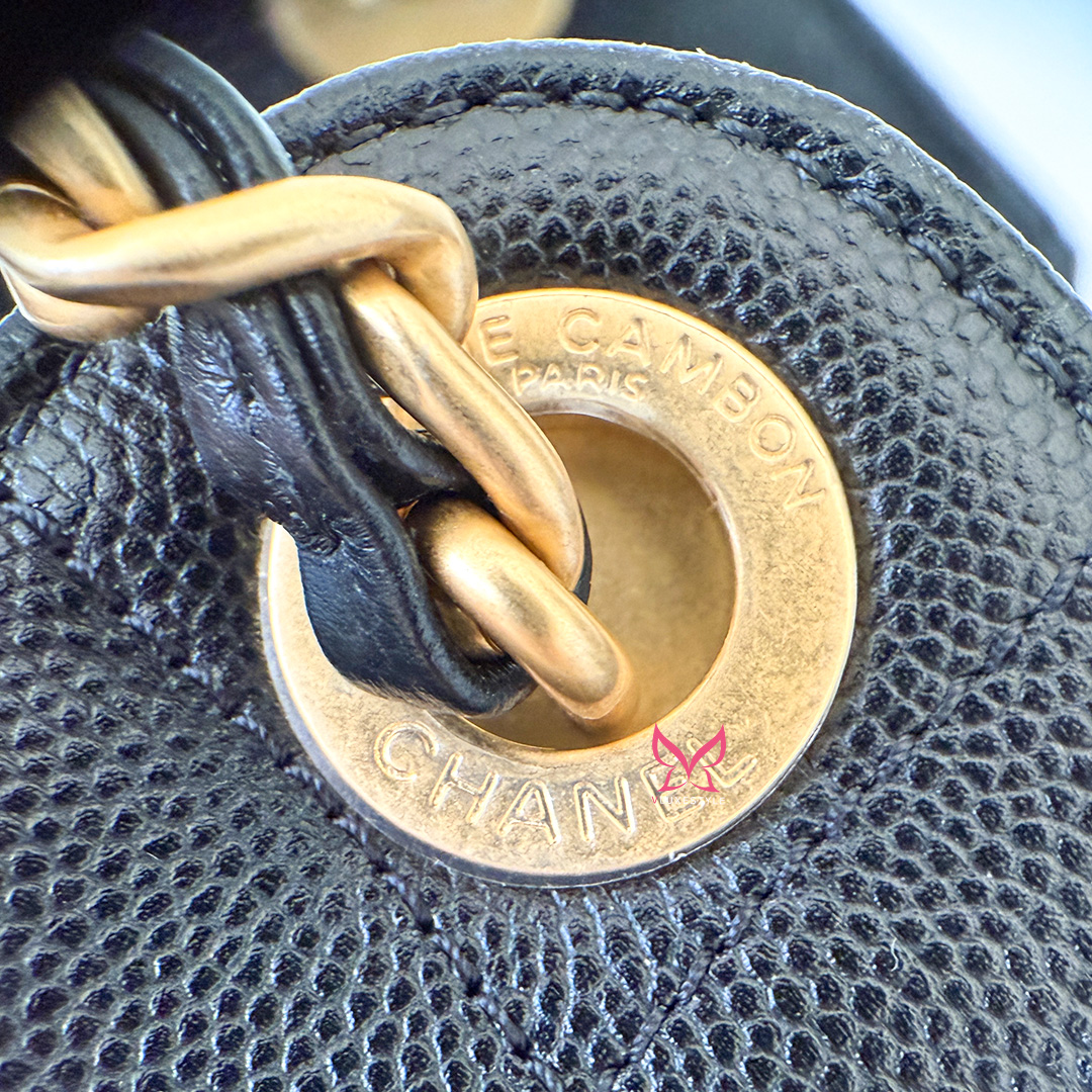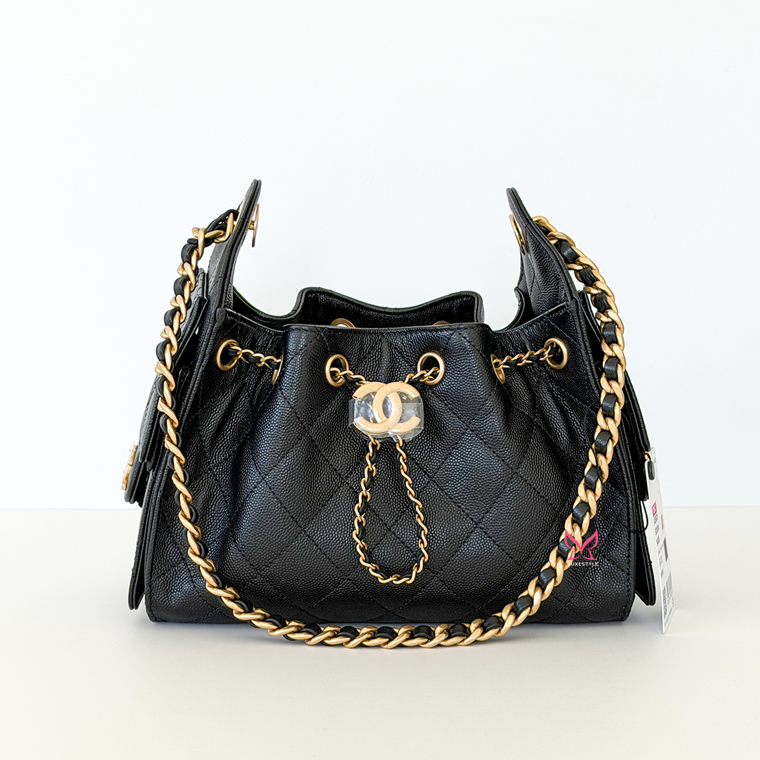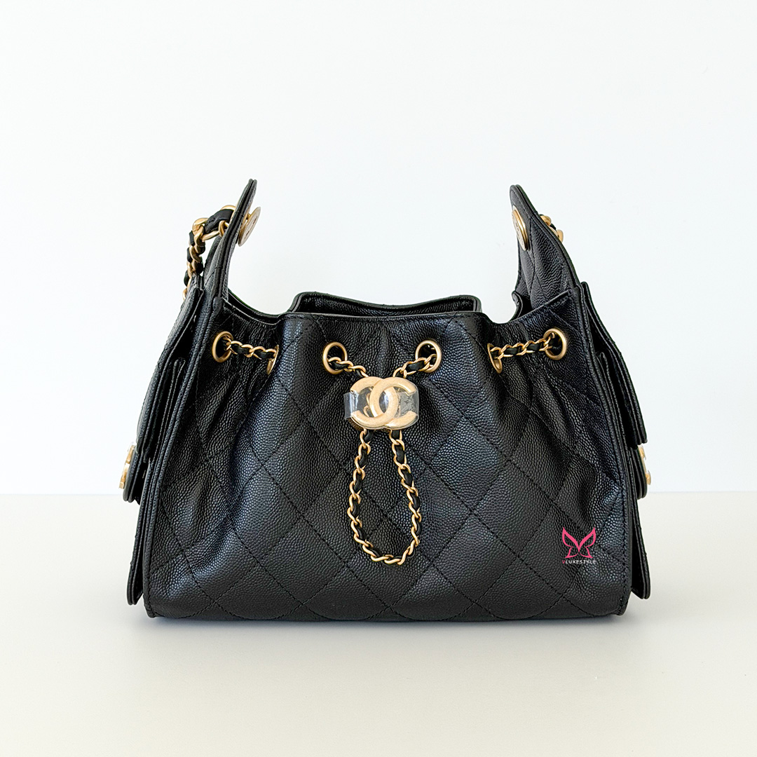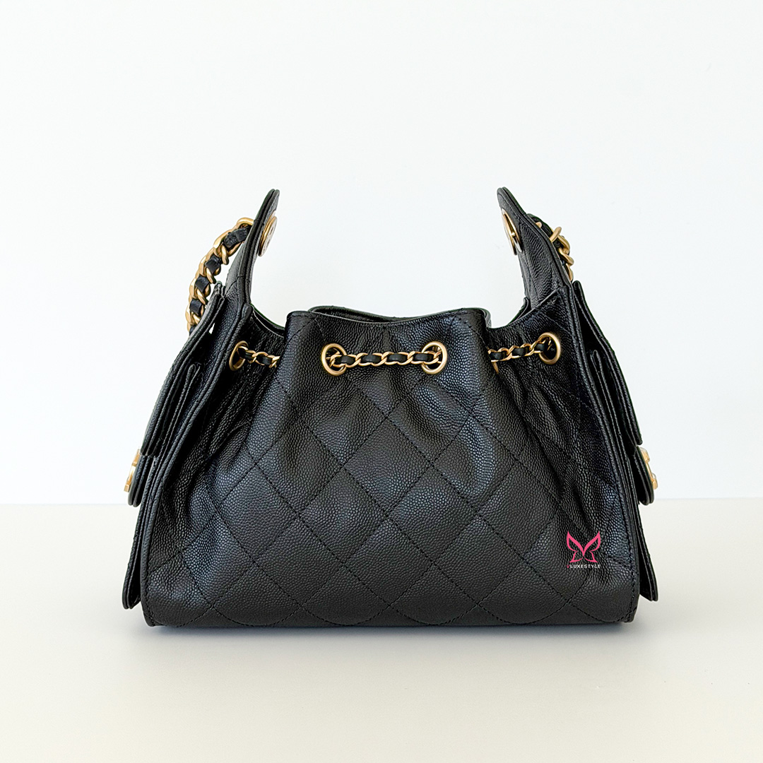 The CHANEL Mini 25 Hobo Bag 26C Black Quilted Caviar is an exquisite blend of sophistication and functionality from the coveted 26C collection. Crafted from luxurious black quilted caviar leather, this chic hobo embodies timeless elegance. The bag is adorned with antique-gold hardware and the iconic CHANEL diamond quilt pattern, adding a touch of opulence to any ensemble.