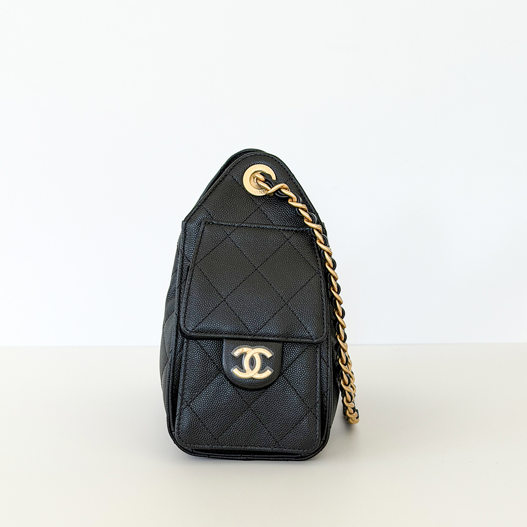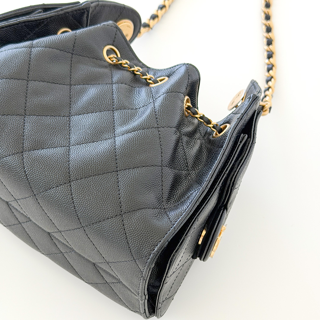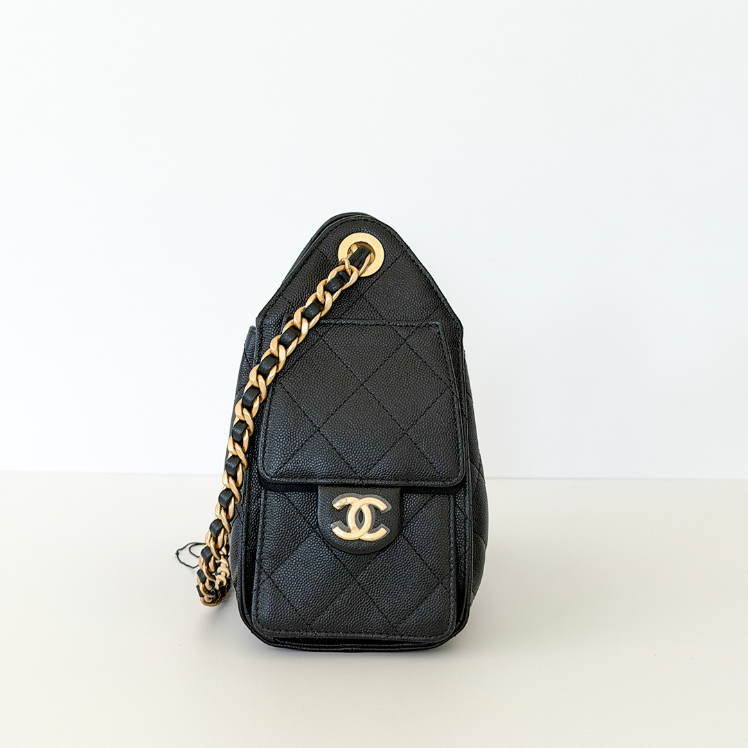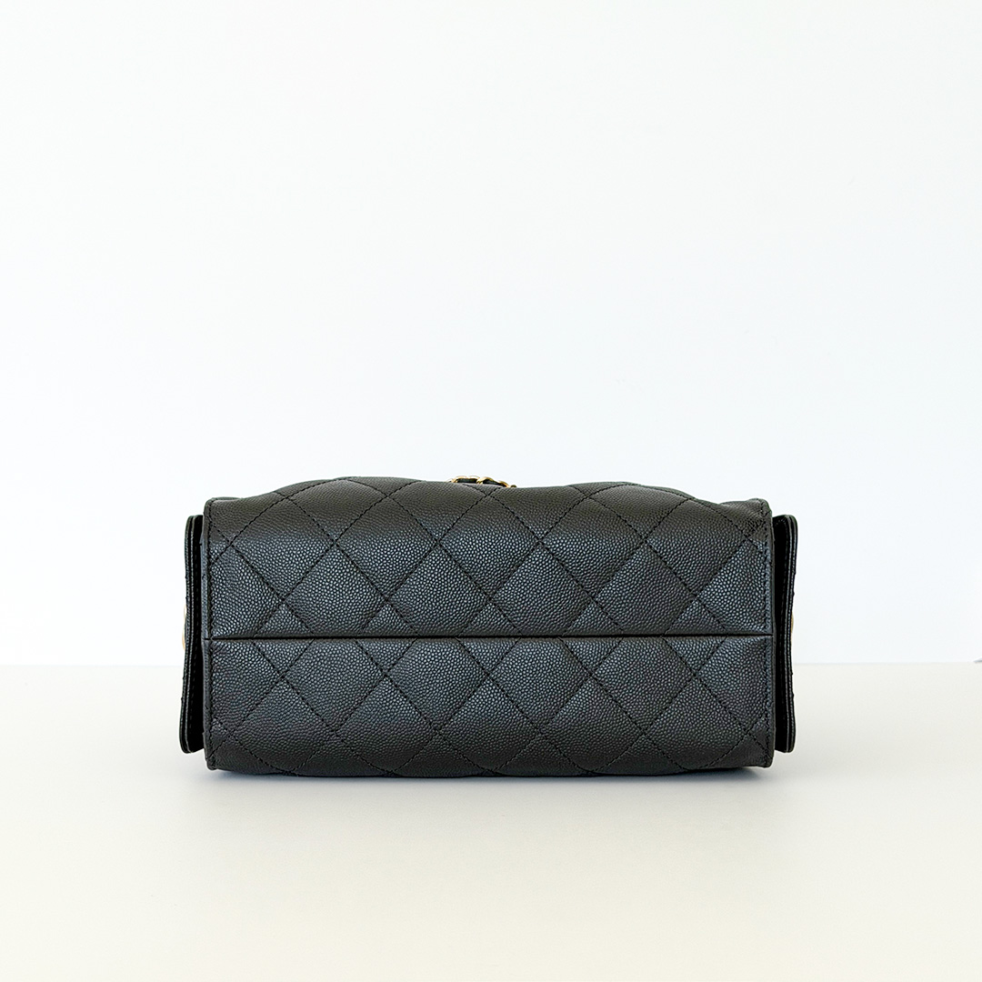 The CHANEL Mini 25 Hobo Bag 26C Black Quilted Caviar is an exquisite blend of sophistication and functionality from the coveted 26C collection. Crafted from luxurious black quilted caviar leather, this chic hobo embodies timeless elegance. The bag is adorned with antique-gold hardware and the iconic CHANEL diamond quilt pattern, adding a touch of opulence to any ensemble.