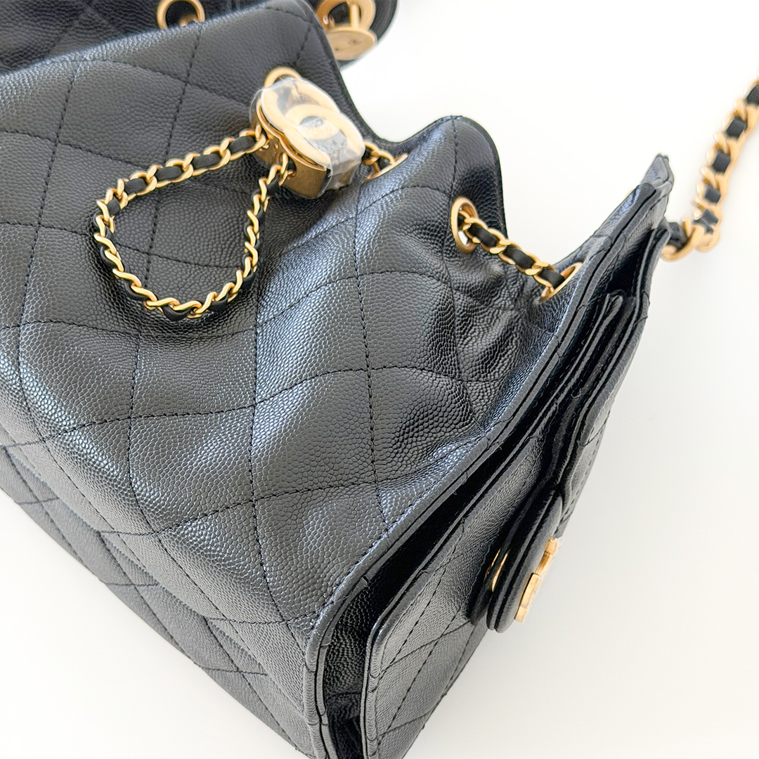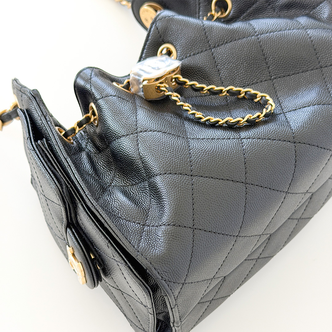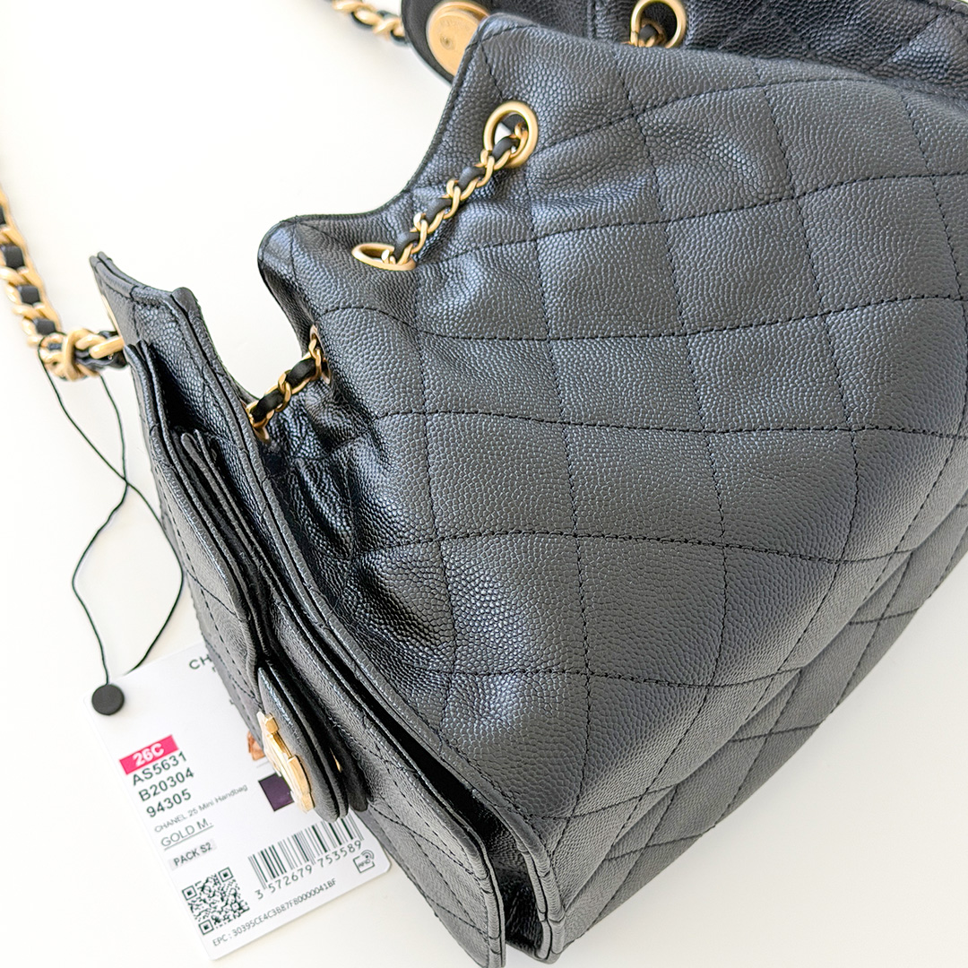 This versatile hobo bag features a drawstring closure with two exterior side pockets. The interior is lined with matching black grosgrain fabric and includes three small slit pockets. Whether you're dressing up for an elegant evening or complementing a casual daytime outfit, this authentic CHANEL 25 Mini hobo bag adds effortless sophistication to any look.
