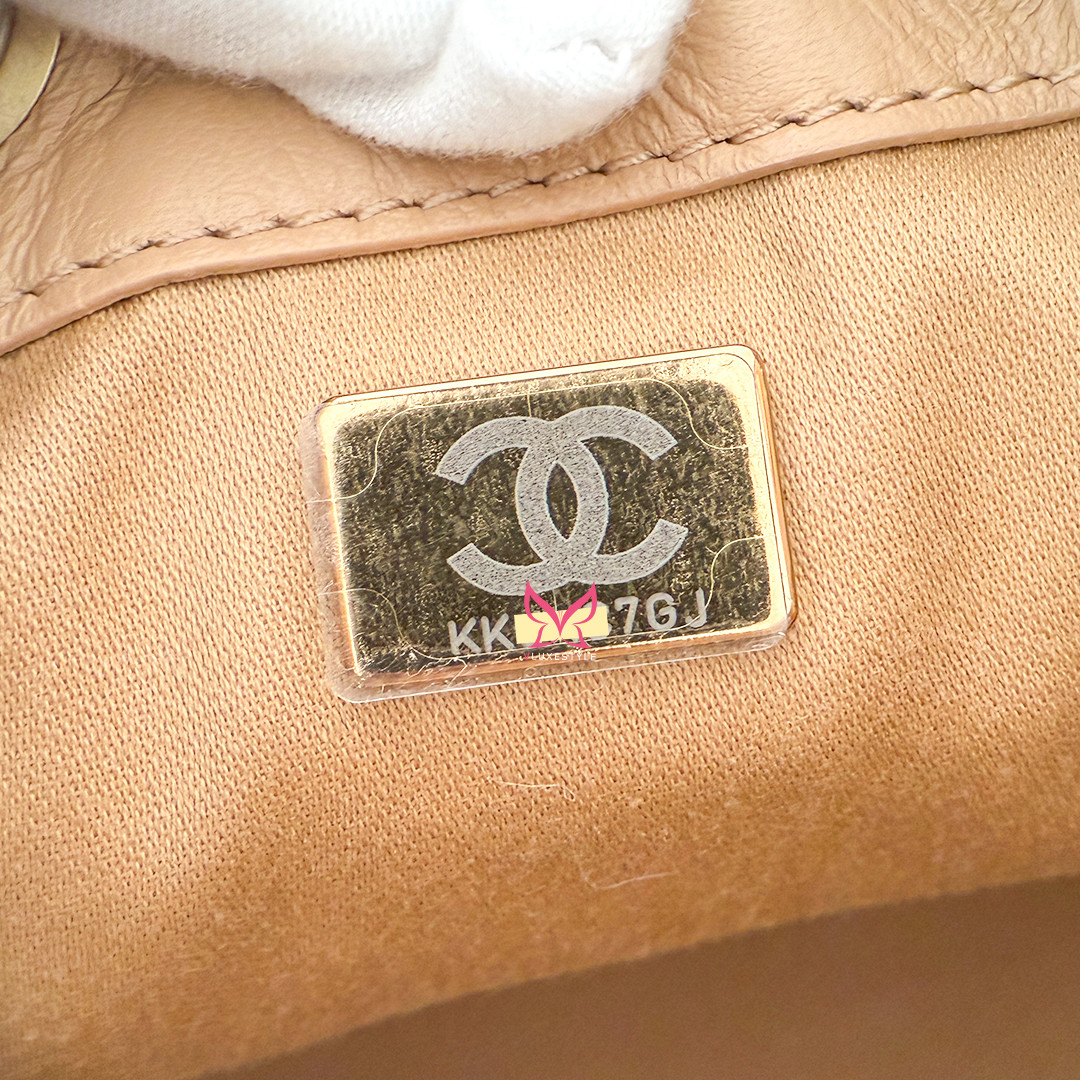 The interior is lined with matching with beige fabric and includes three small slit pockets. This authentic CHANEL Mini 25 hobo bag adds casual elegance to any look, makes it the perfect statement piece for transitioning from a beach day to a chic city night.