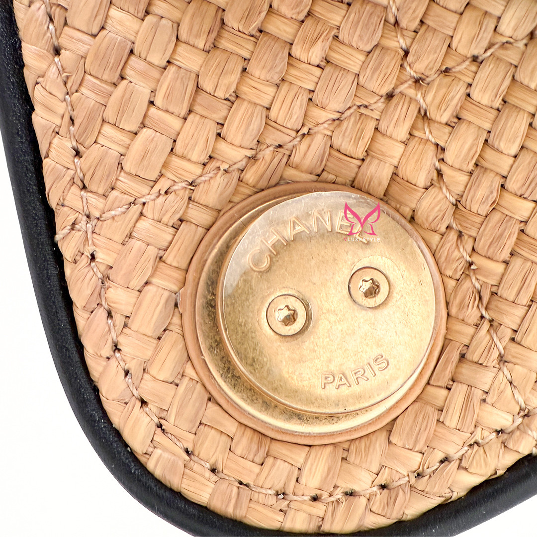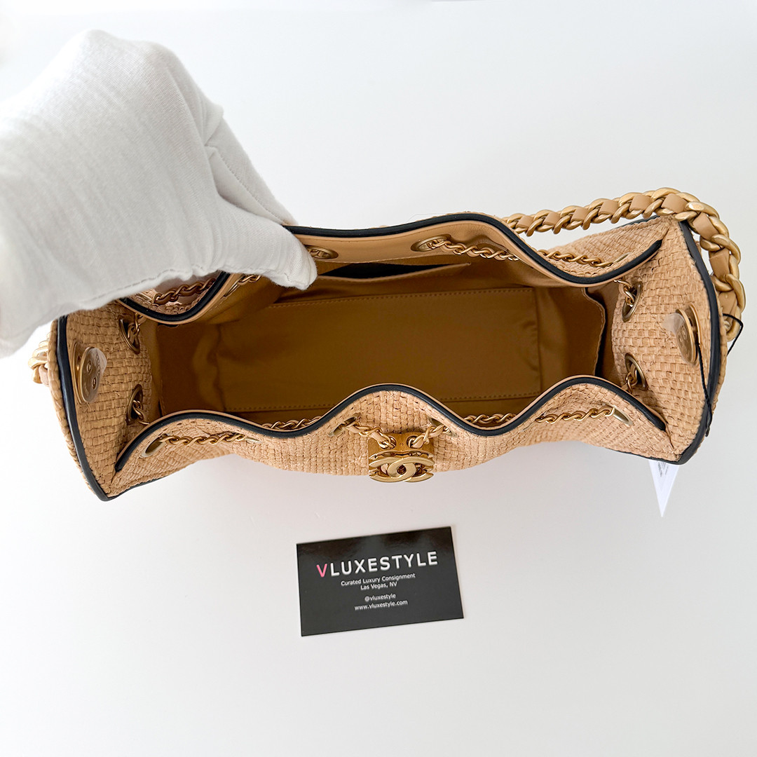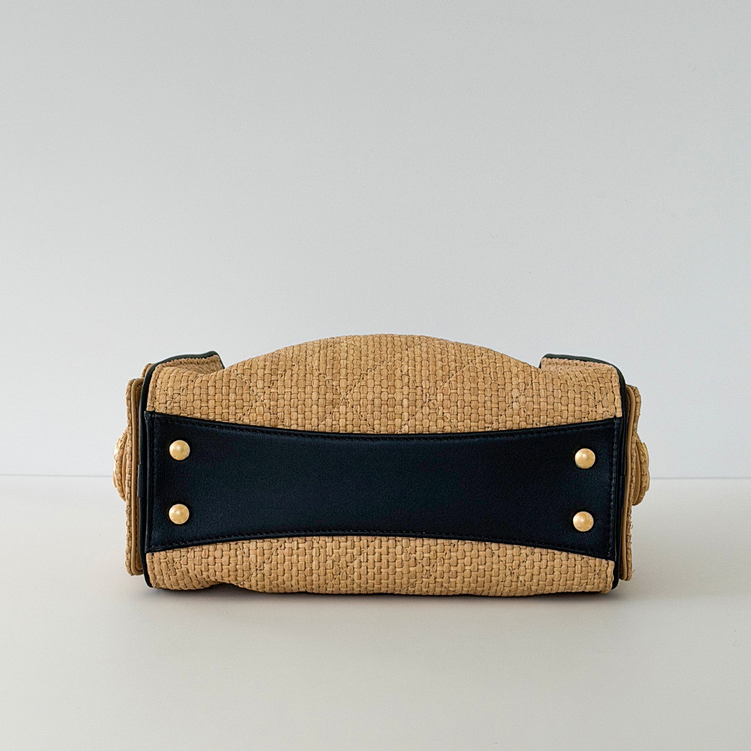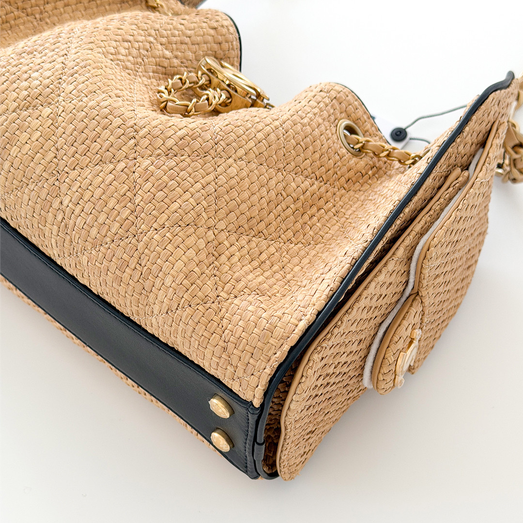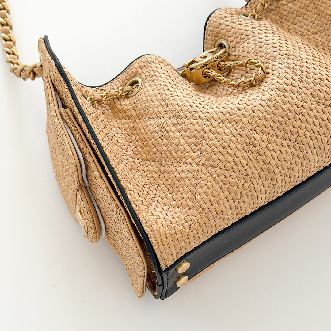 The CHANEL Mini 25 Hobo Bag Beige Black Raffia is an exquisite blend of sophistication and functionality from the coveted 26P collection. Crafted from braided raffia with black trim adorned with and brushed gold hardware. This versatile hobo bag features a drawstring closure with two exterior side pockets.