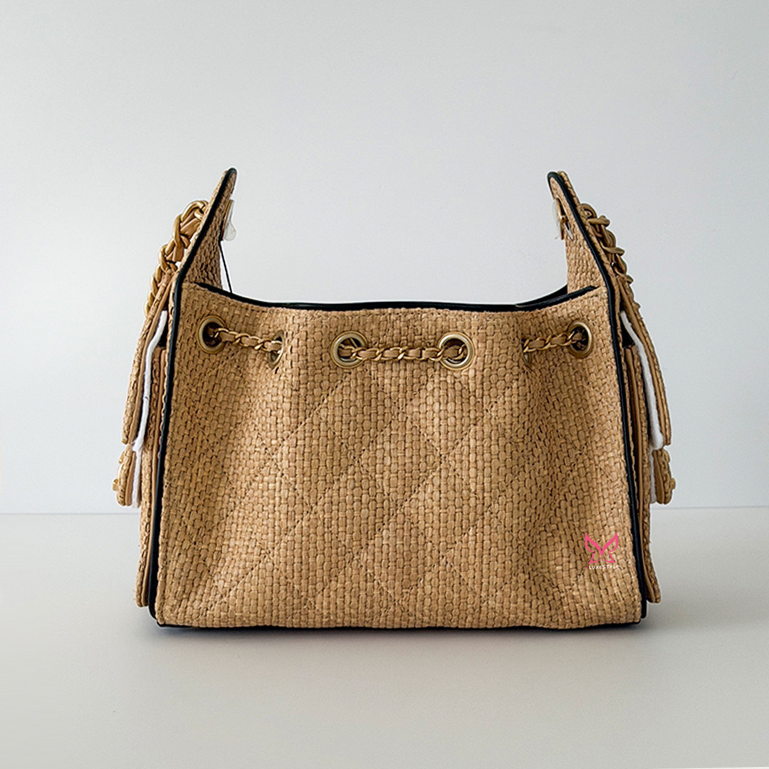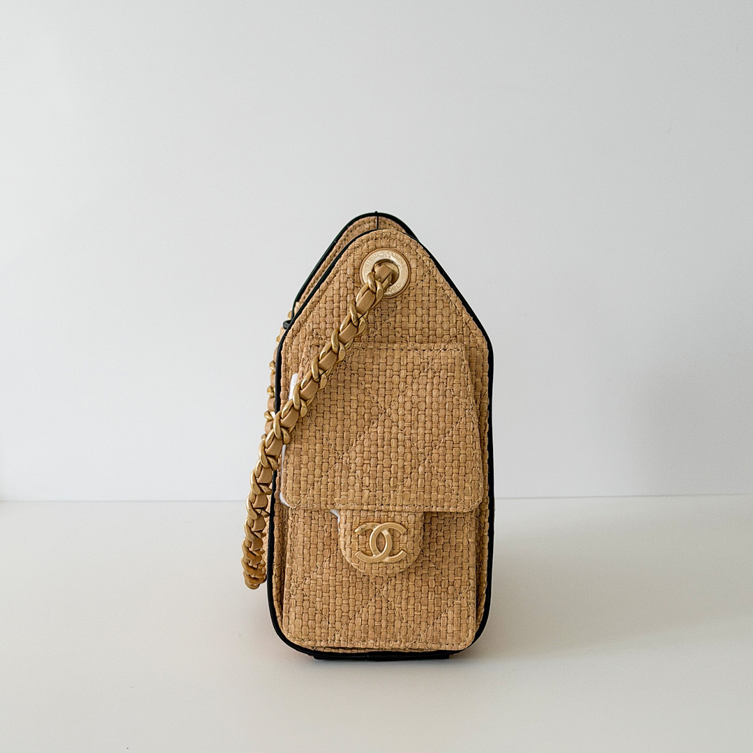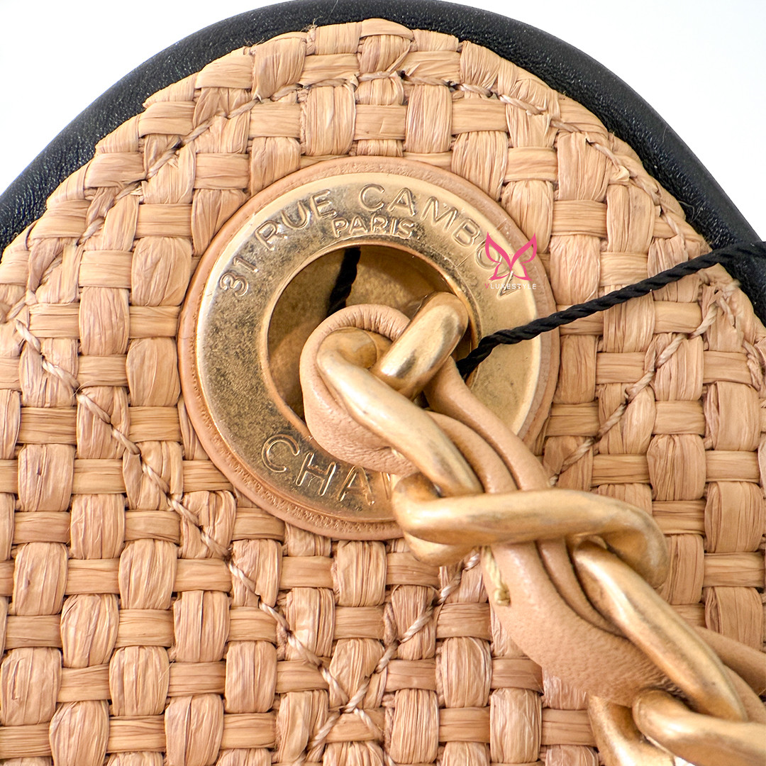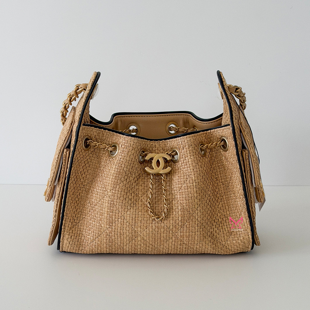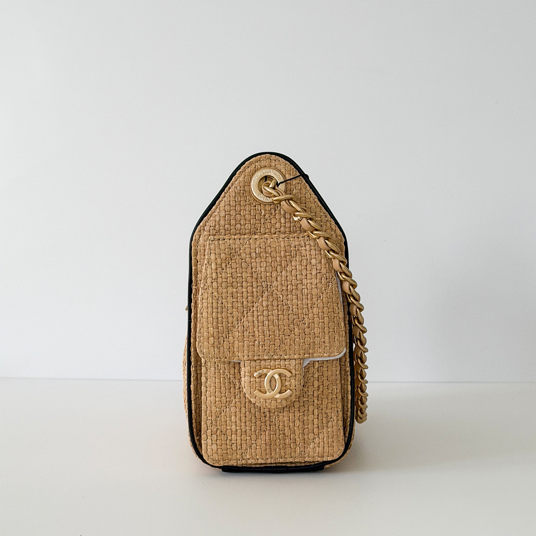 The CHANEL Mini 25 Hobo Bag Beige Black Raffia is an exquisite blend of sophistication and functionality from the coveted 26P collection. Crafted from braided raffia with black trim adorned with and brushed gold hardware. This versatile hobo bag features a drawstring closure with two exterior side pockets.