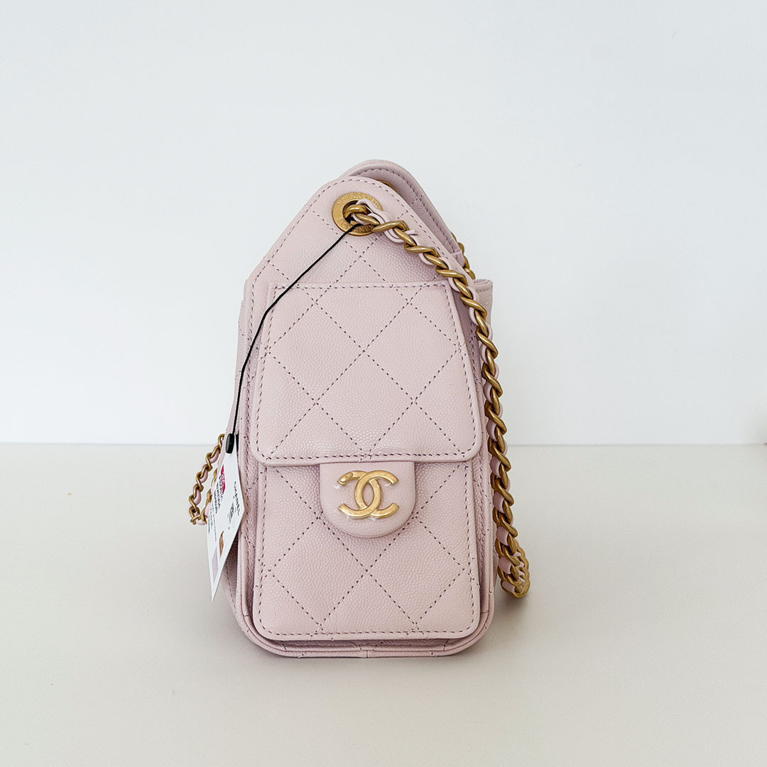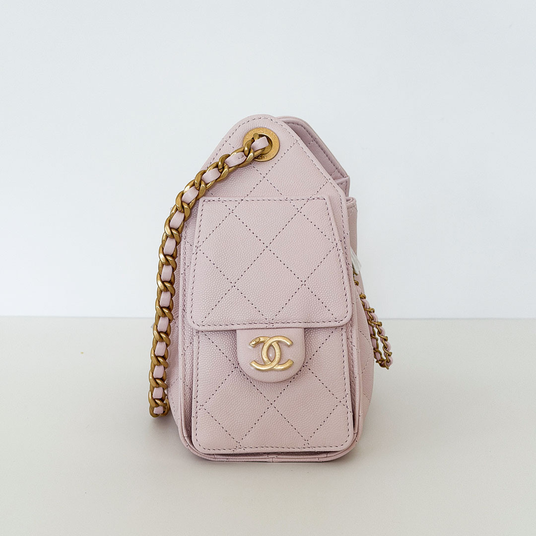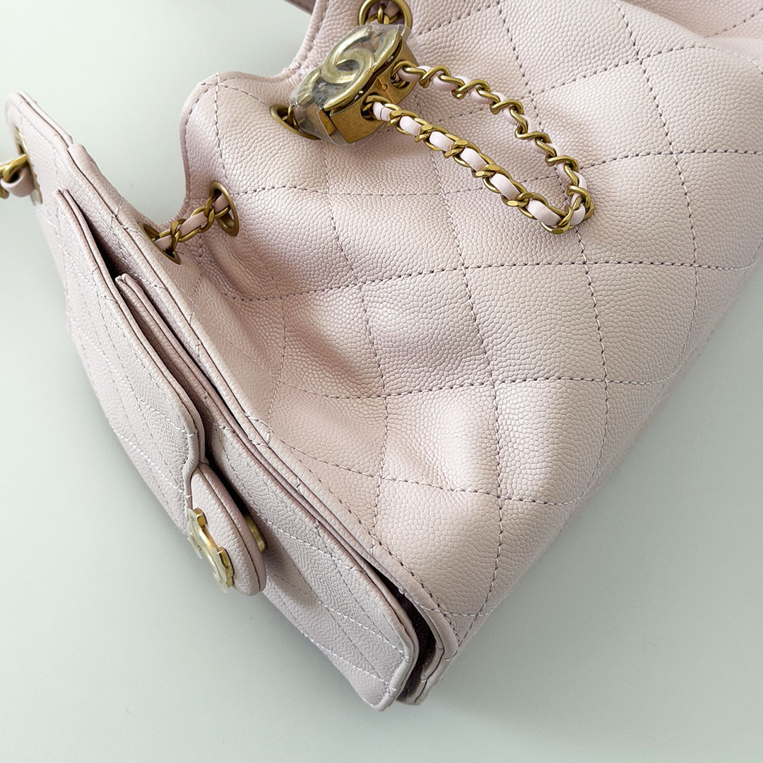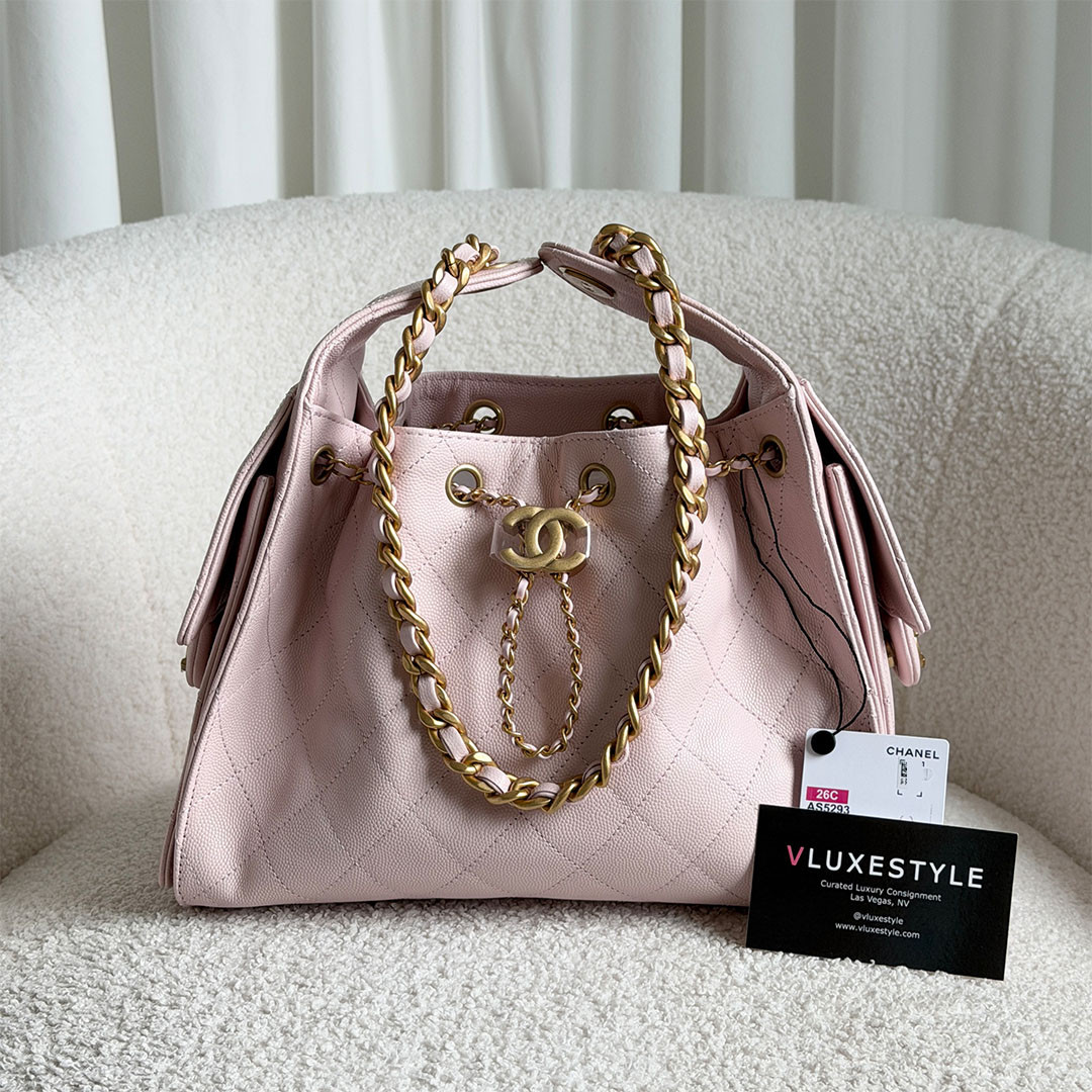 The CHANEL Mini 25 Hobo Bag 26C Rose Clair Quilted Caviar is an exquisite blend of sophistication and functionality from the coveted 26C collection. Crafted from luxurious light pink quilted caviar leather, this chic hobo embodies timeless elegance. The bag is adorned with antique-gold hardware and the iconic CHANEL diamond quilt pattern, adding a touch of opulence to any ensemble.