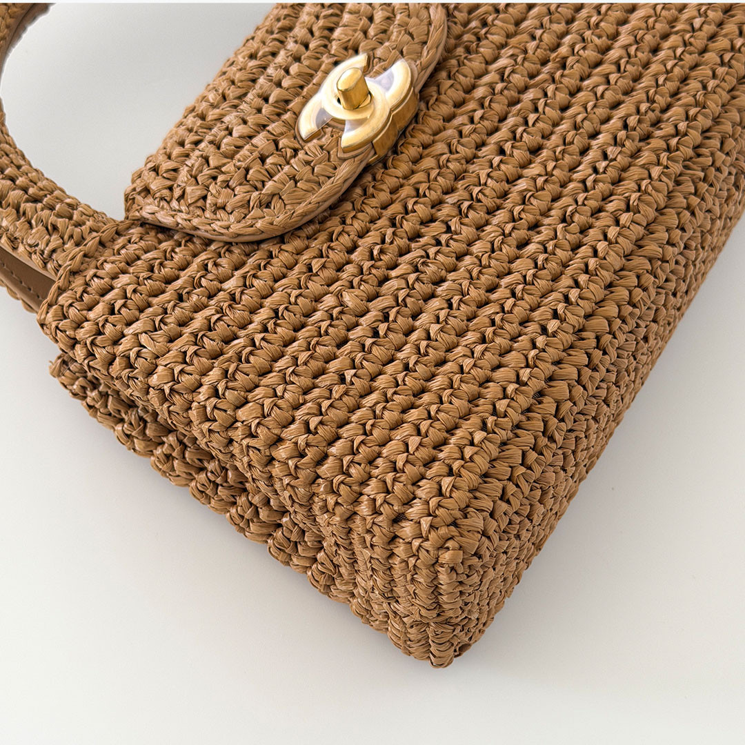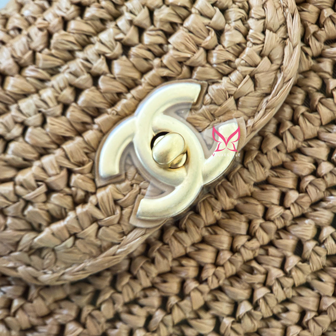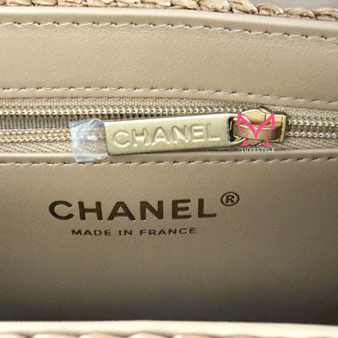 The CHANEL Mini Kelly Raffia Bag is the perfect blend of elegance and versatility –a standout from the CHANEL 26C Cruise Collection. Crafted from braided raffia adorned with brushed gold hardware. It features a trapezoidal shape, curved handles with tab closure, and the iconic CC turn-lock. It features a leather lining and is spacious enough for your essentials, including an iPhone Pro Max.
