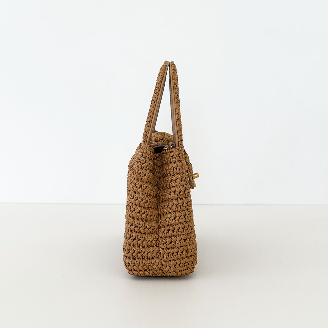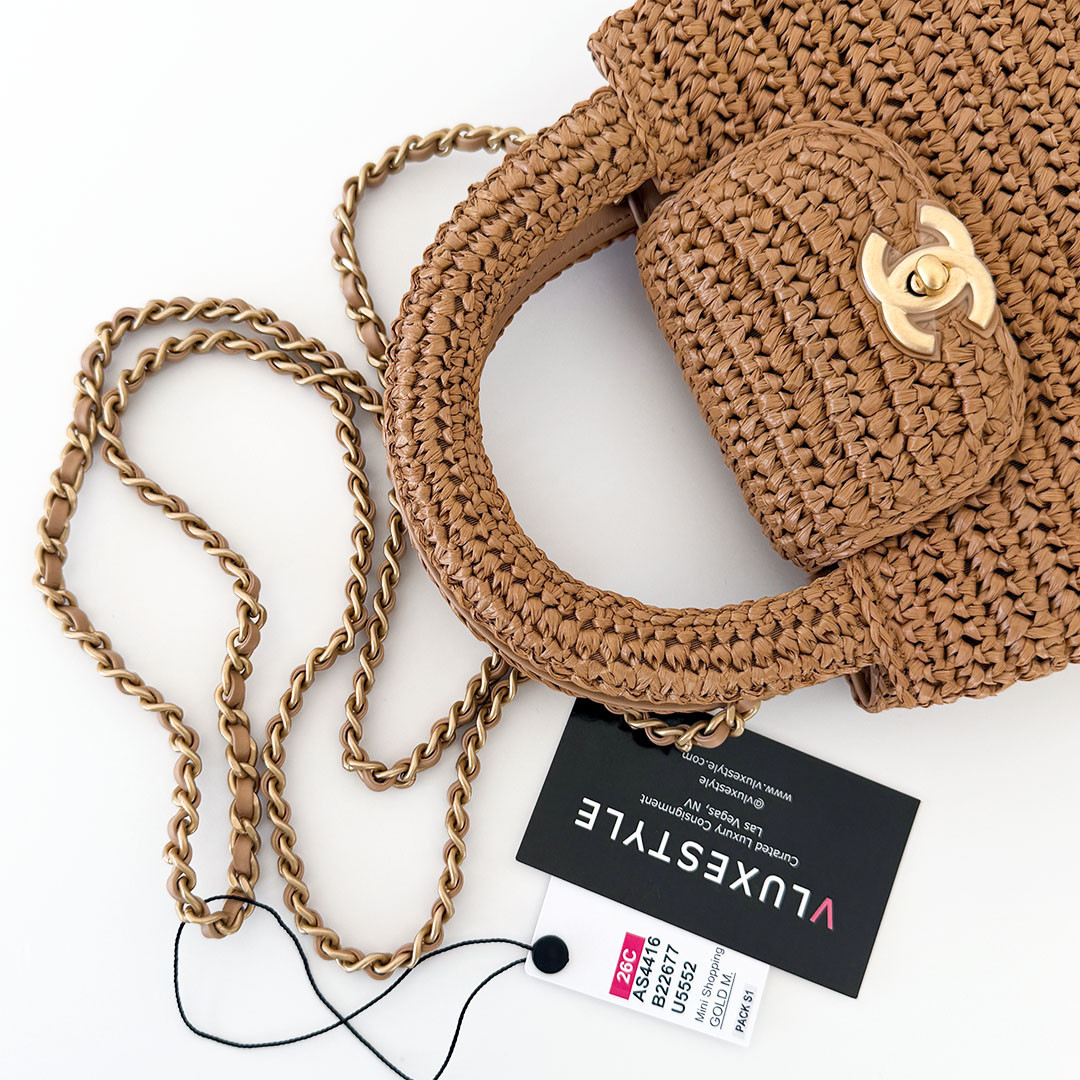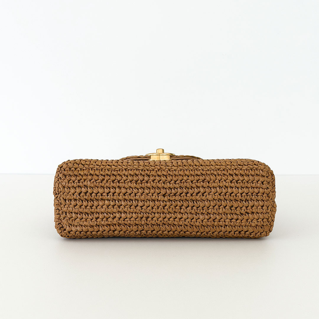 The CHANEL Mini Kelly Raffia Bag is the perfect blend of elegance and versatility –a standout from the CHANEL 26C Cruise Collection. Crafted from braided raffia adorned with brushed gold hardware. It features a trapezoidal shape, curved handles with tab closure, and the iconic CC turn-lock. It features a leather lining and is spacious enough for your essentials, including an iPhone Pro Max.