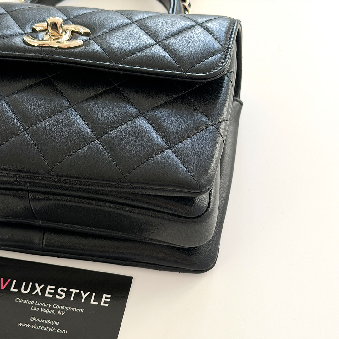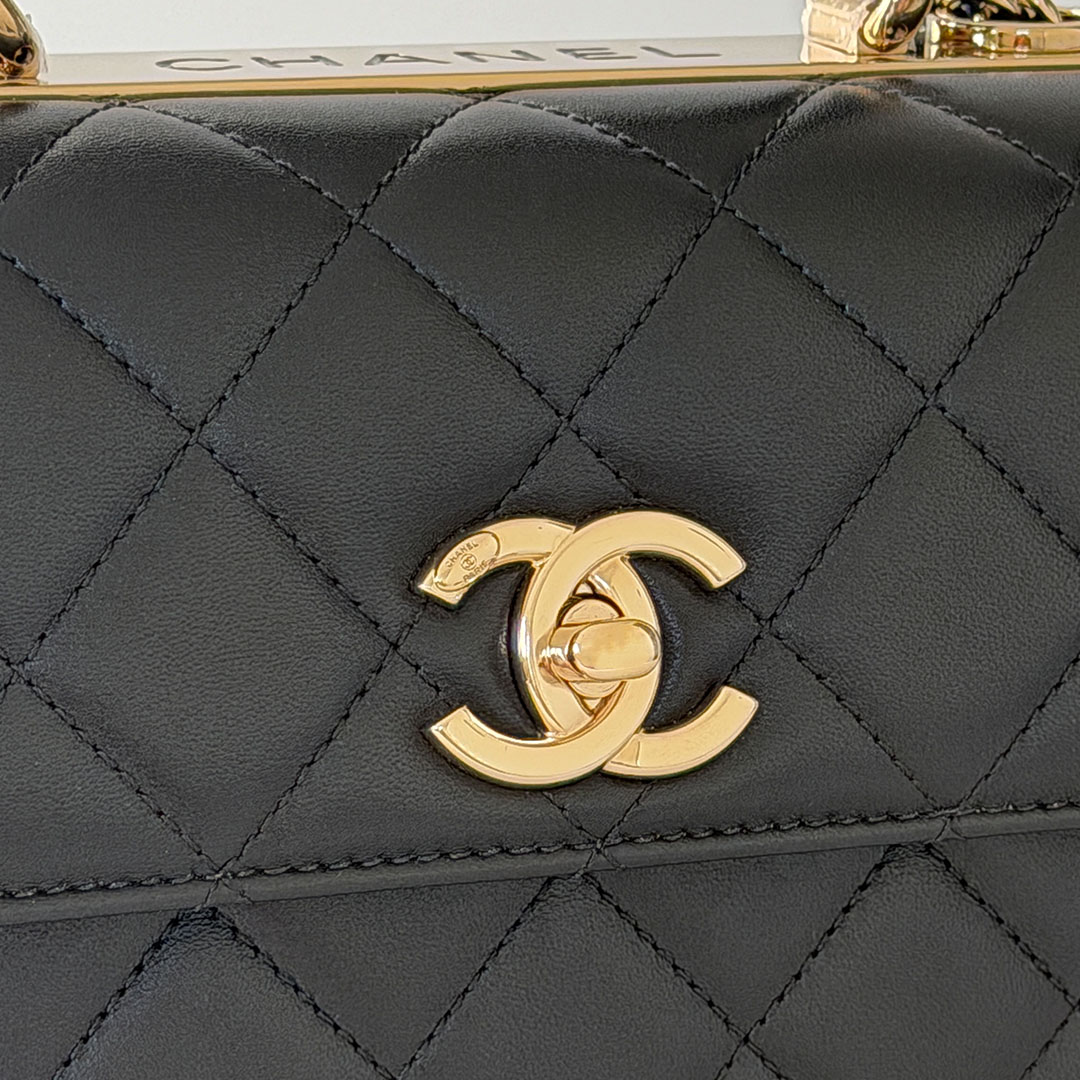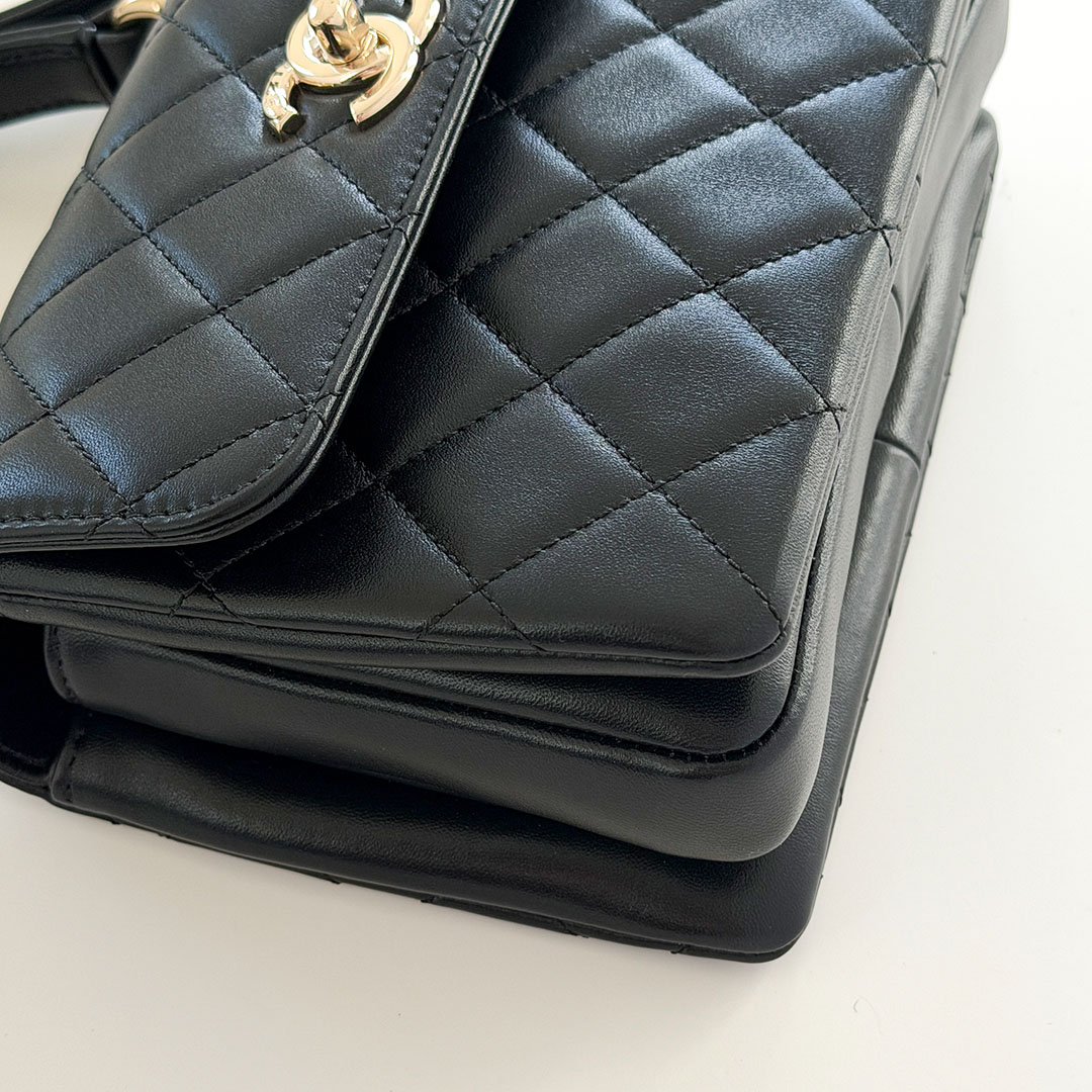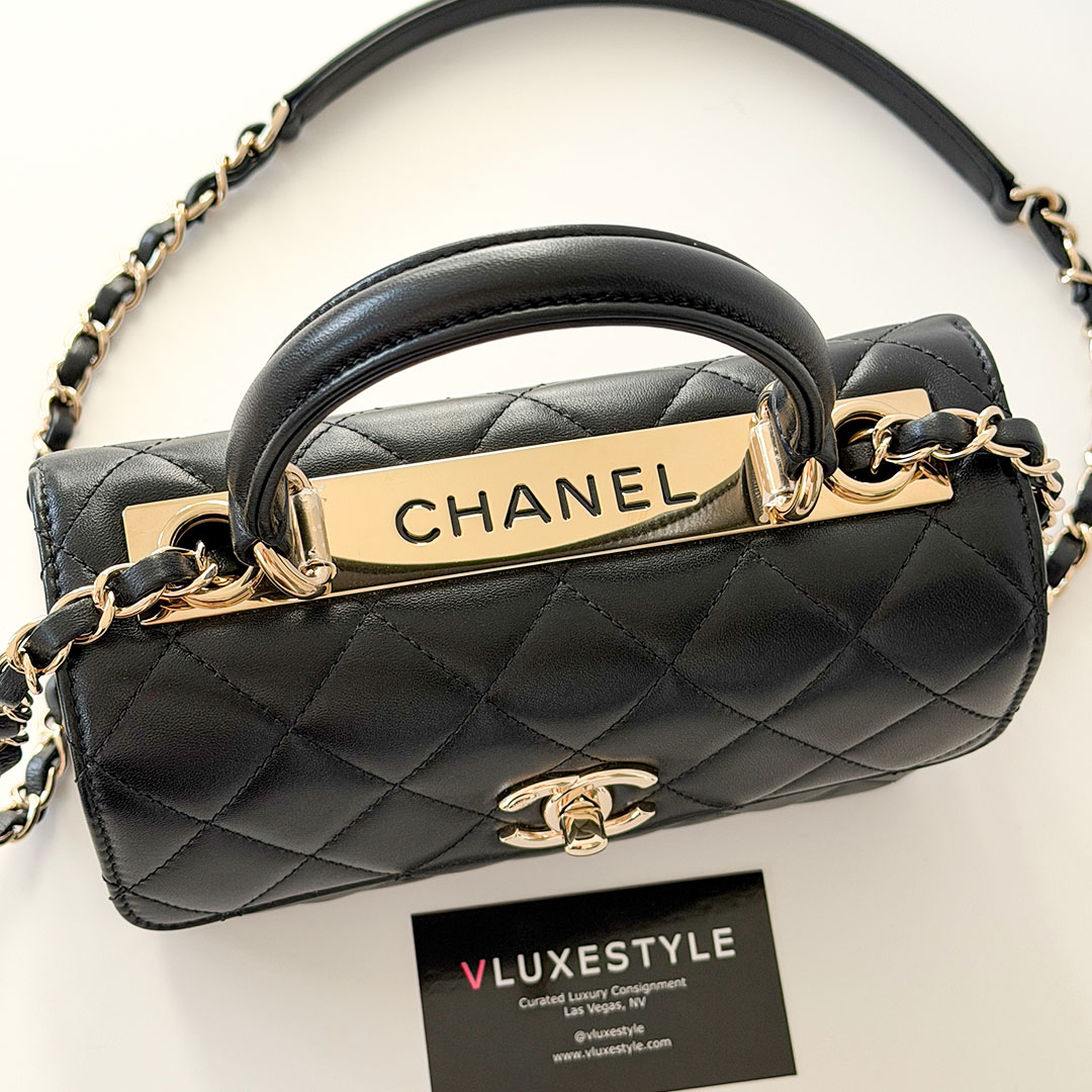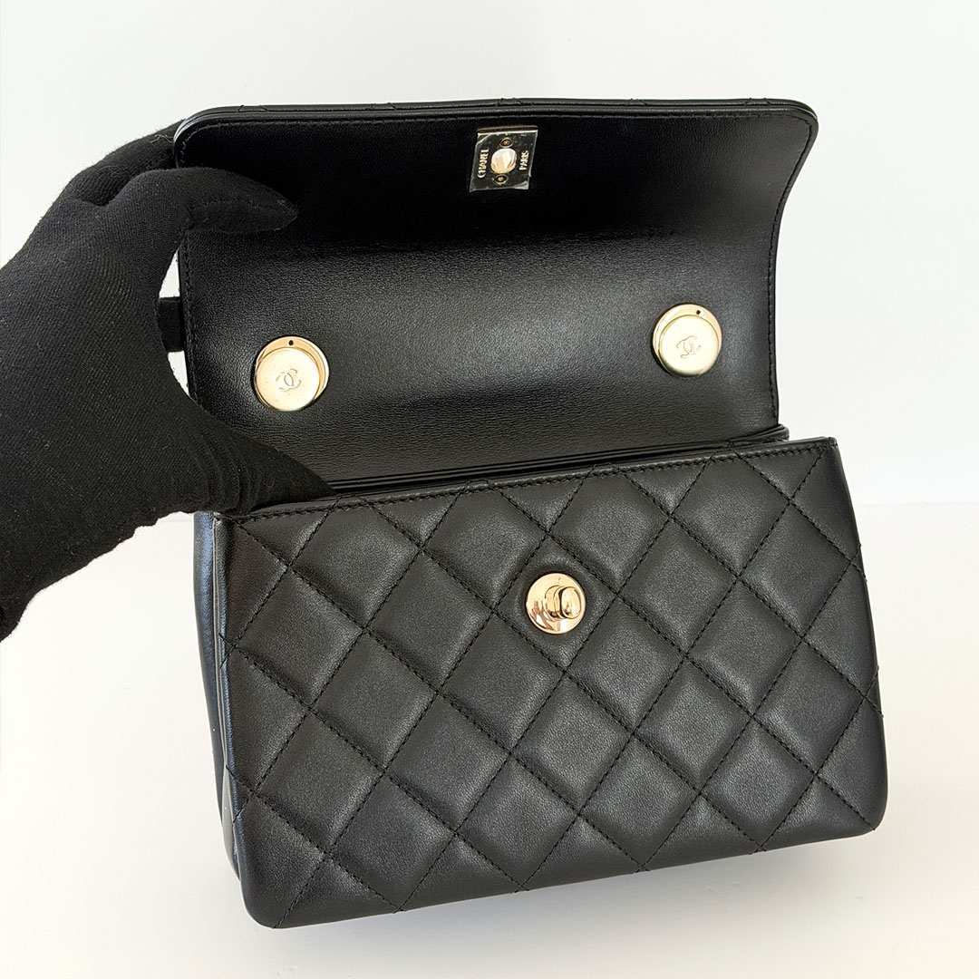 The Authentic CHANEL 24C Mini Trendy CC is a luxurious and stylish shoulder bag crafted from quilted lambskin leather in a classic black color. It features the unique "Chanel" engraved metal plate on top, the light gold hardware adds a touch of glamour, and complements the black leather. It is the first release in this mini size, making it a unique and coveted piece.
