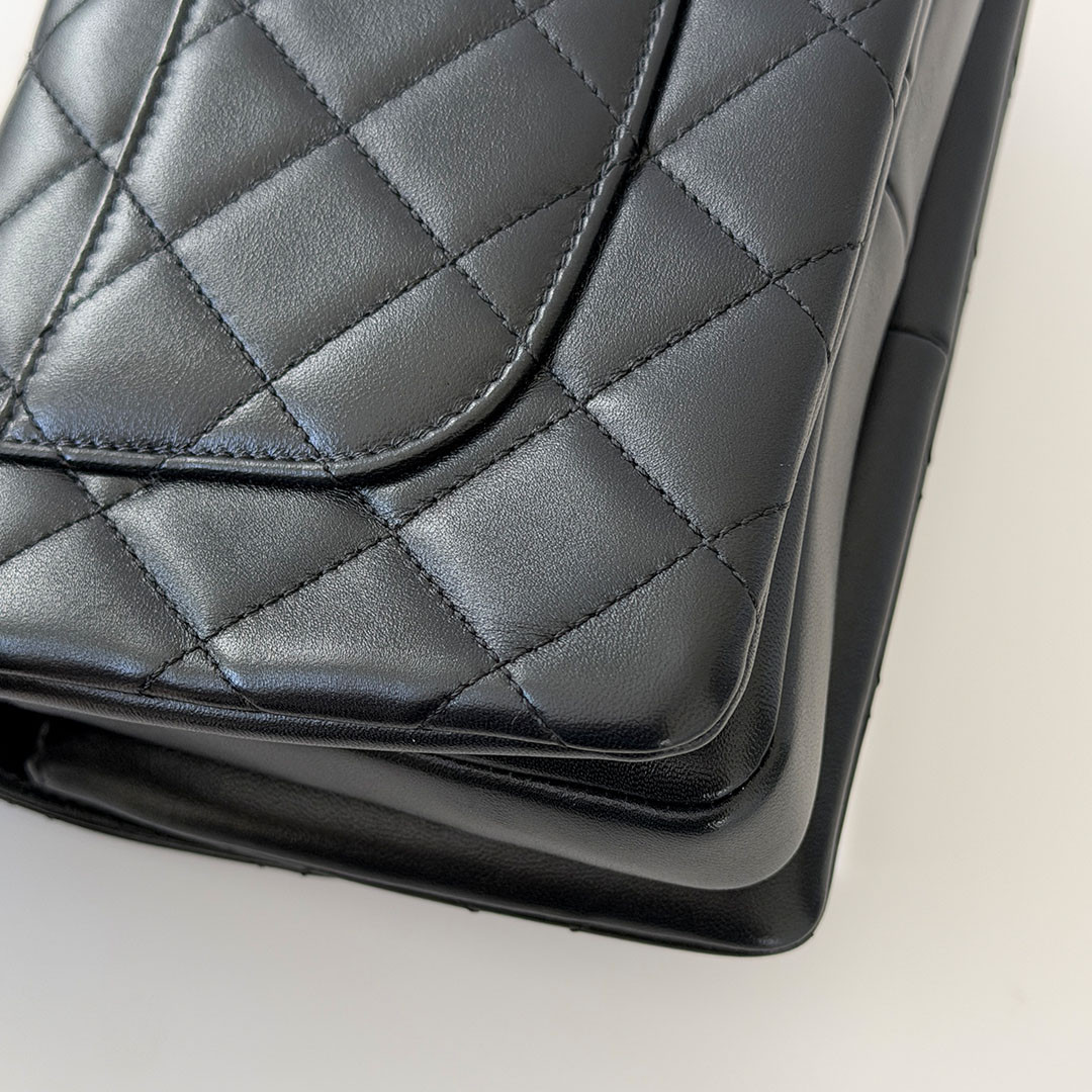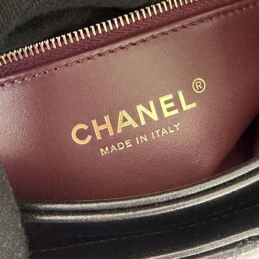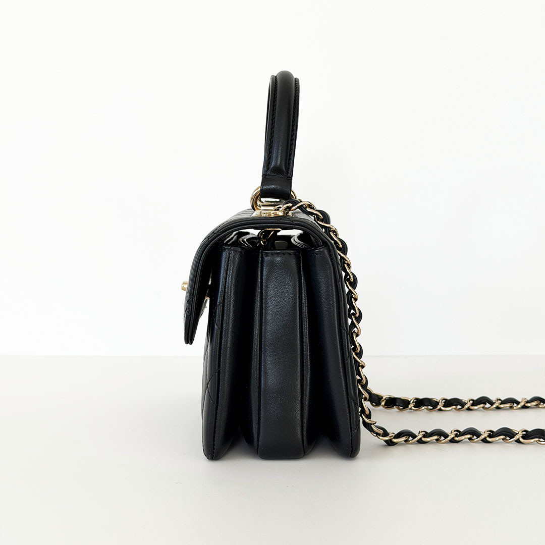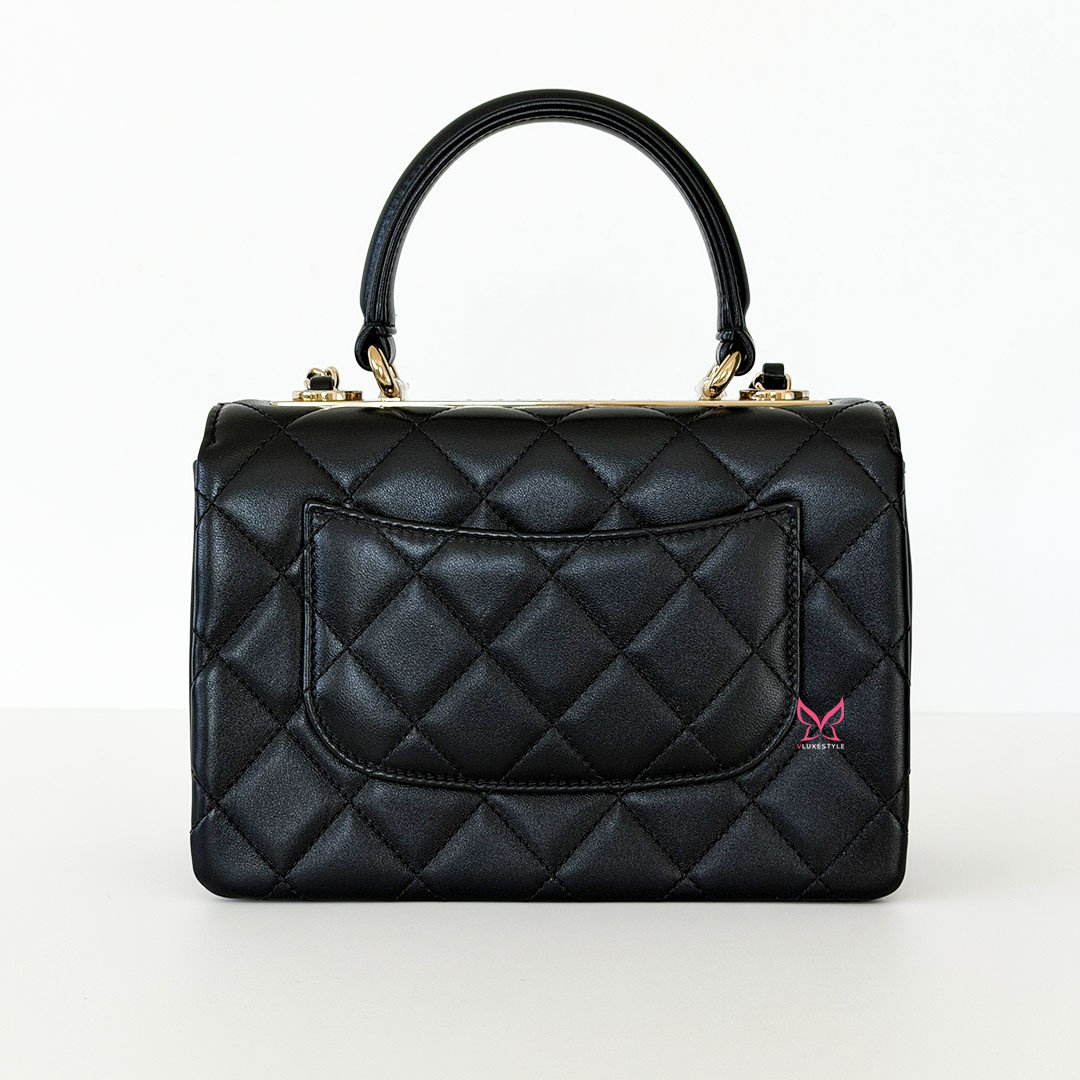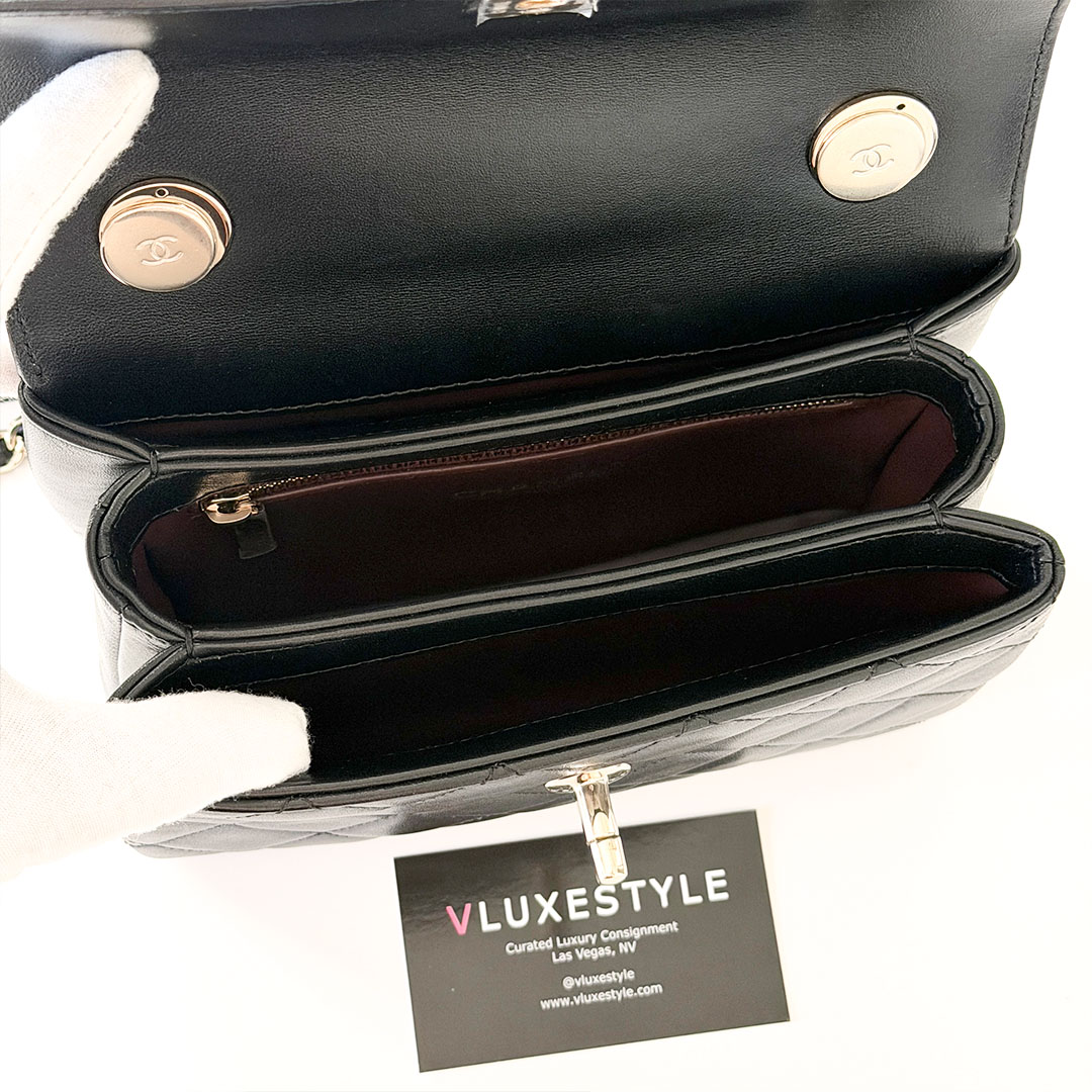 The Authentic CHANEL 24C Mini Trendy CC is a luxurious and stylish shoulder bag crafted from quilted lambskin leather in a classic black color. It features the unique "Chanel" engraved metal plate on top, the light gold hardware adds a touch of glamour, and complements the black leather. It is the first release in this mini size, making it a unique and coveted piece.