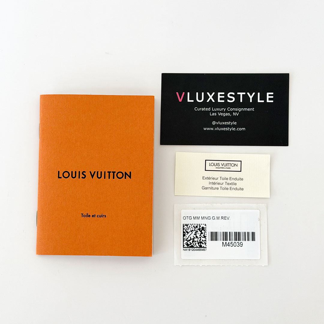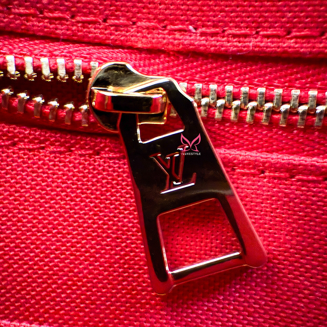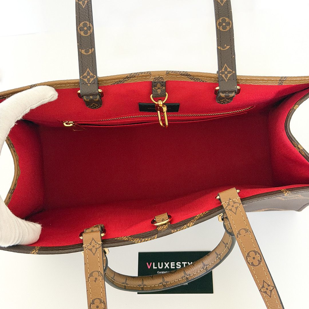 This authentic LOUIS VUITON On The Go Tote is designed for versatility, it features sturdy rolled top handles for handheld carry and long shoulder straps that can be easily tucked inside for a sleeker look. The tote opens up to reveal a red fabric interior, complete with zipper and patch pockets. it the perfect tote both everyday use and travel, combining luxury with functionality.