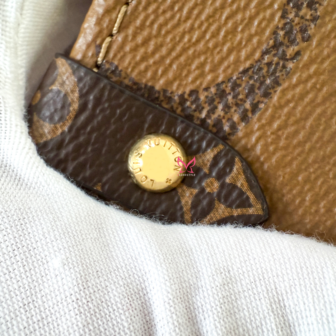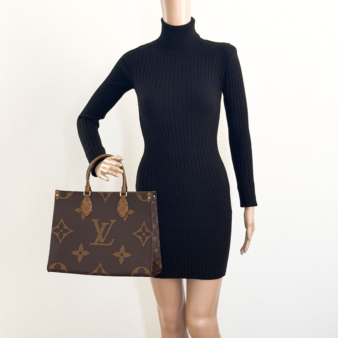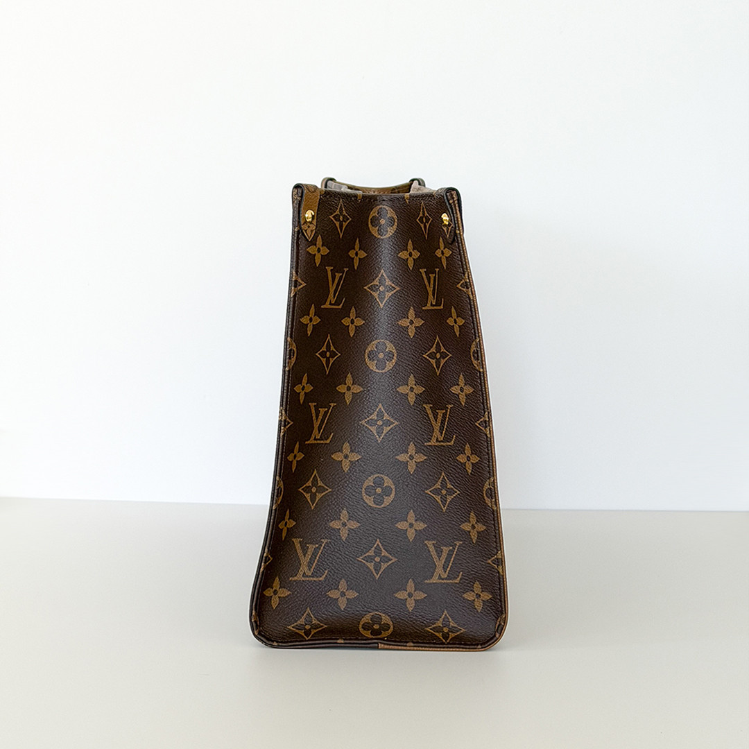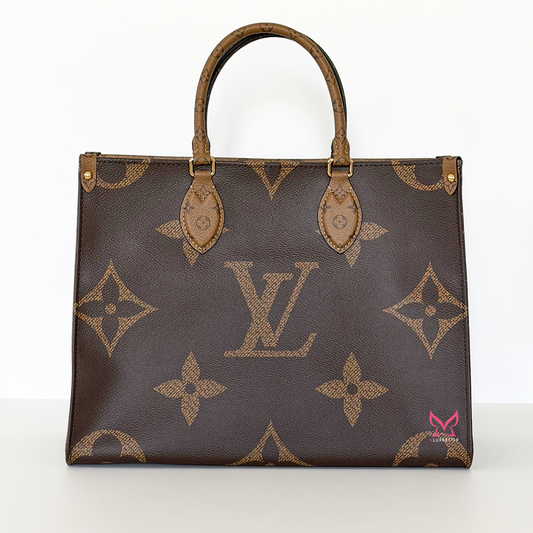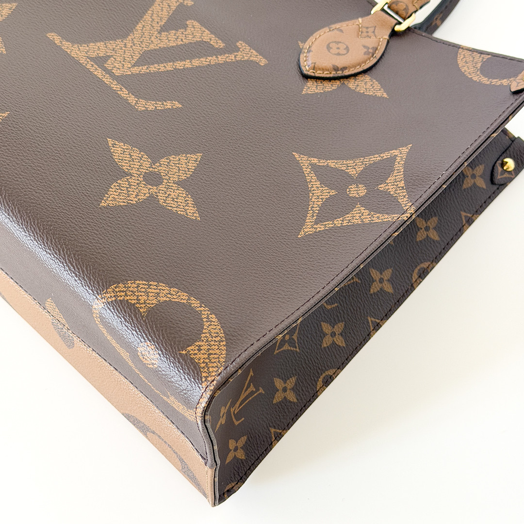 The On The Go MM Tote Reverse Monogram is an exquisite piece of luxury from Louis Vuitton, combining classic elegance with contemporary style. This chic tote features the iconic oversized Louis Vuitton monogram printed in striking reverse monogram on durable coated canvas. The rich brown tones are complemented by polished gold-tone hardware, adding a touch of sophistication to its overall design.