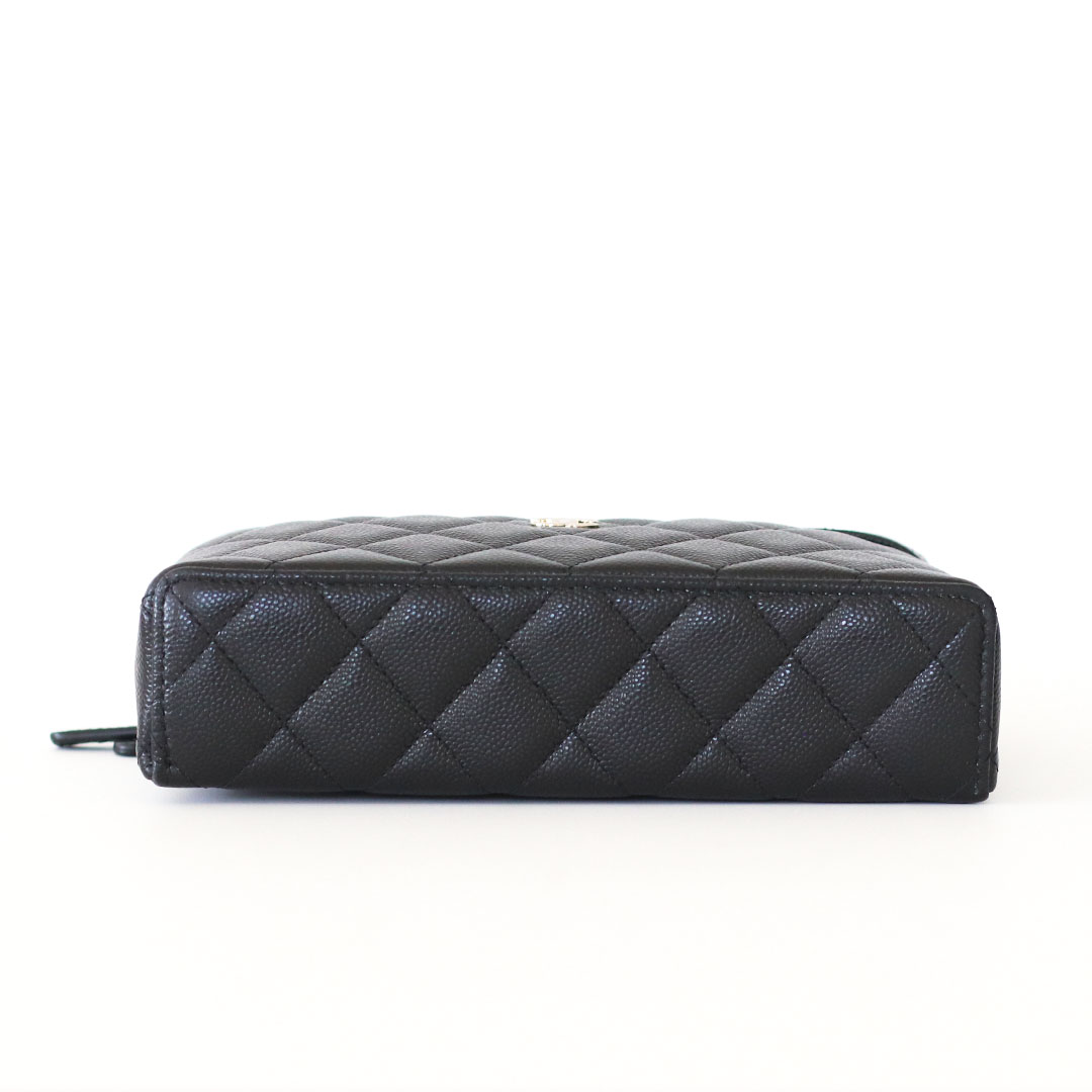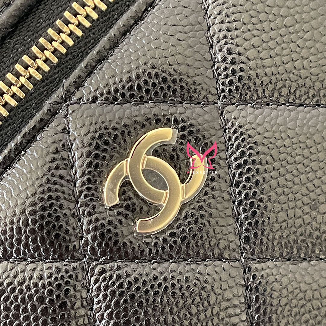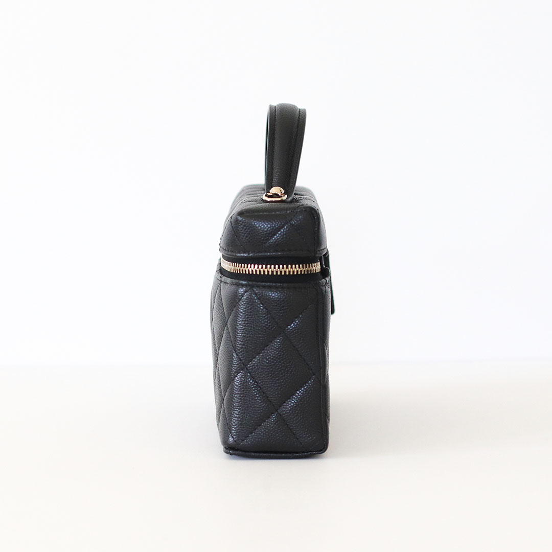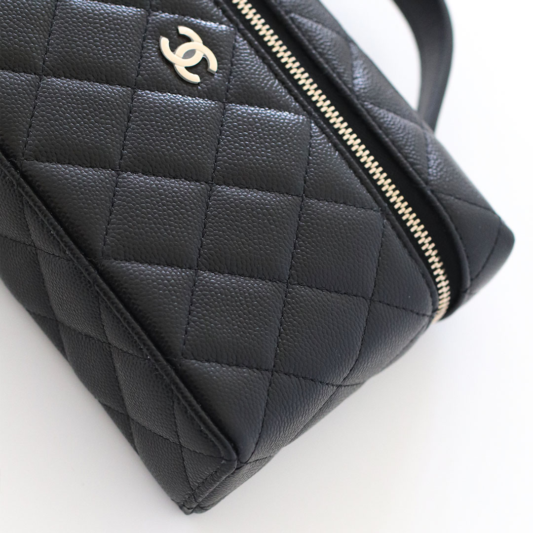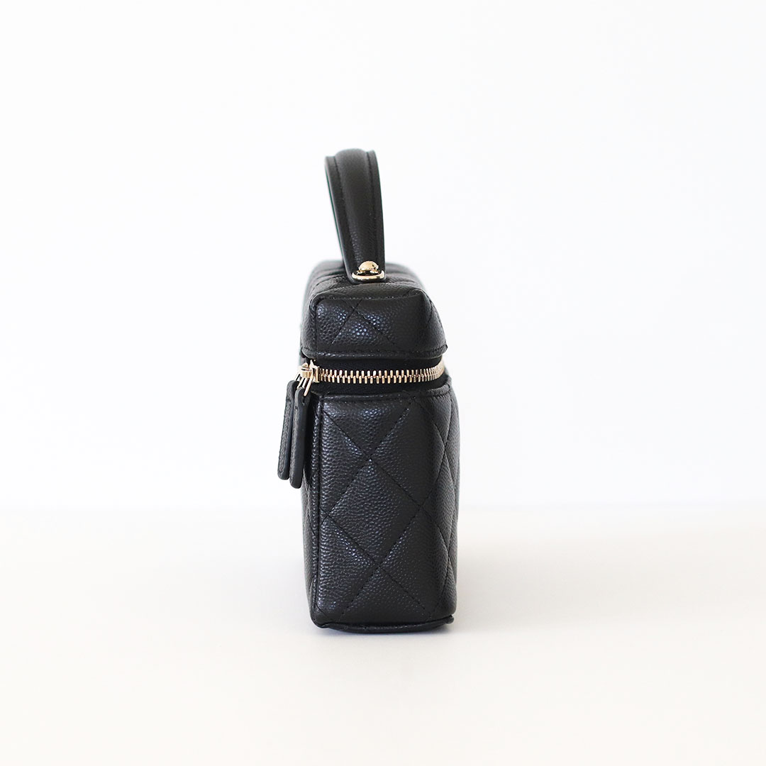 The CHANEL Vanity Top Handle Bag with Chain 25K in Black Quilted Caviar Leather. Crafted from luxurious black caviar leather, it features removable chain threaded leather with light gold hardware. This exquisite handbag effortlessly complements any outfit. You can wear it over your shoulder, cross-body, or carry it by the top handle.