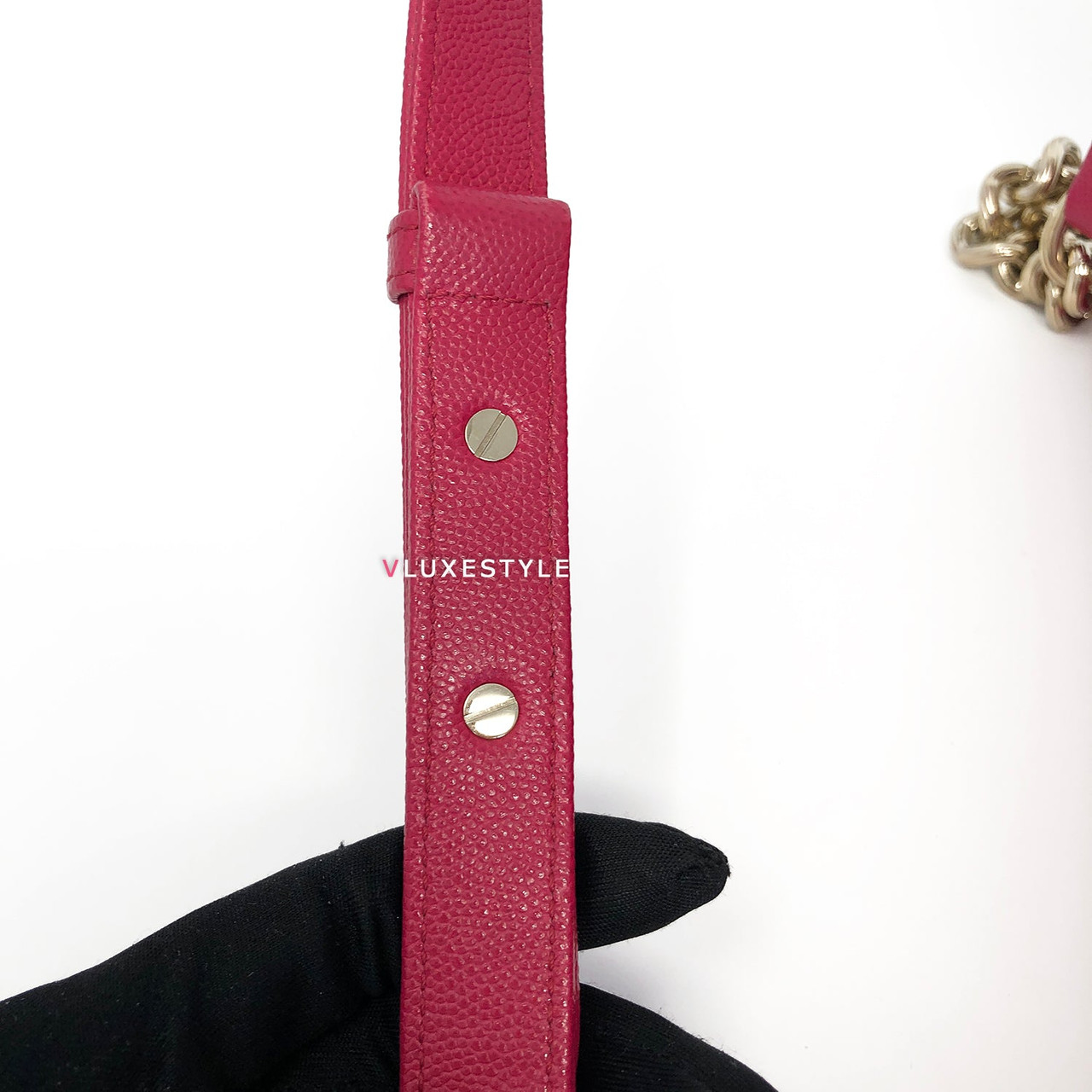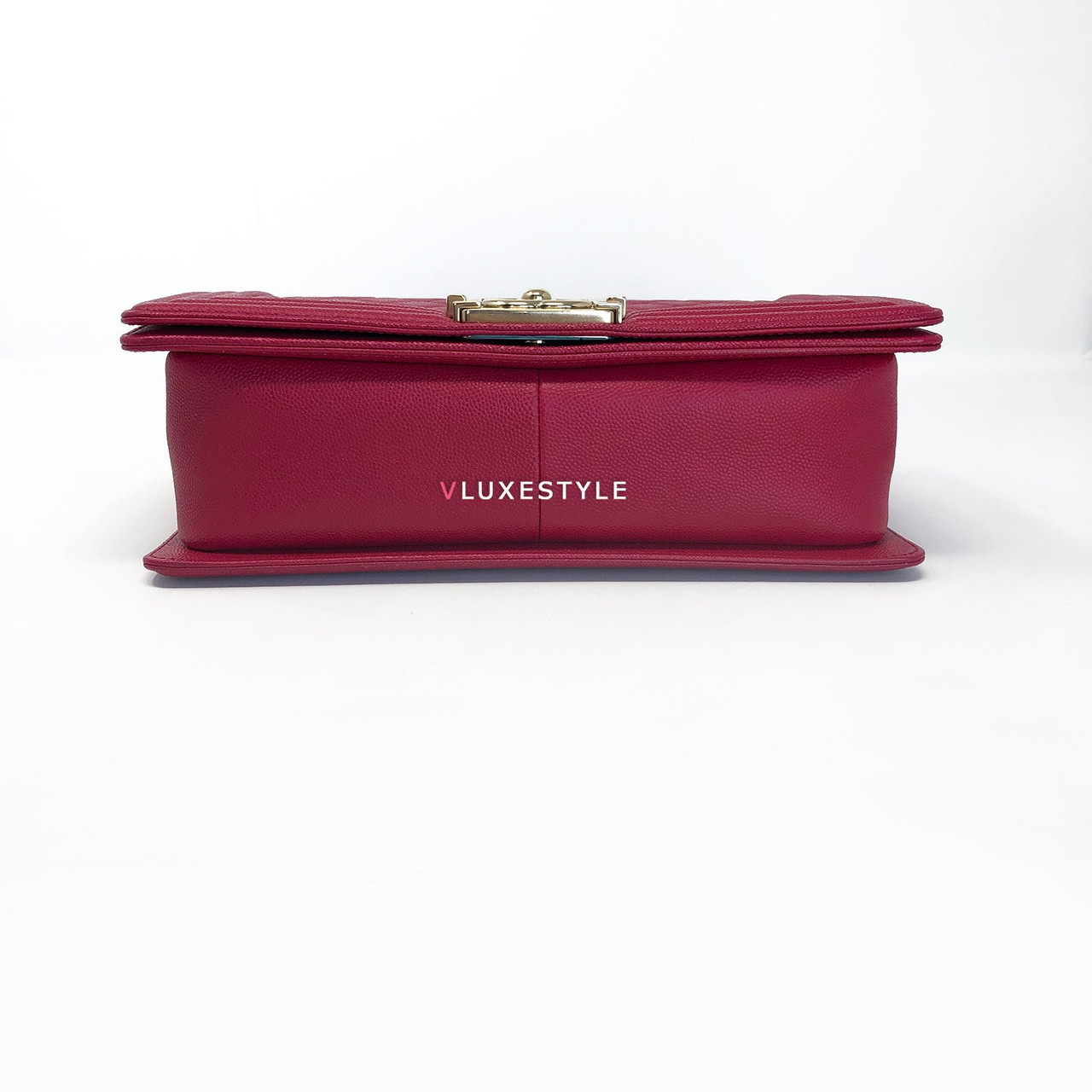 One of the most sought-after styles! Sold out when it was released! Limited Edition Authentic Chanel 17P Le boy Old Medium Fuchsia Caviar with rigid shiny light gold hardware. This shoulder bag is crafted of luxurious and durable caviar leather in beautiful fuchsia pink and light gold hardware. The bag can be worn long and short over-the-shoulder bag and crossbody.