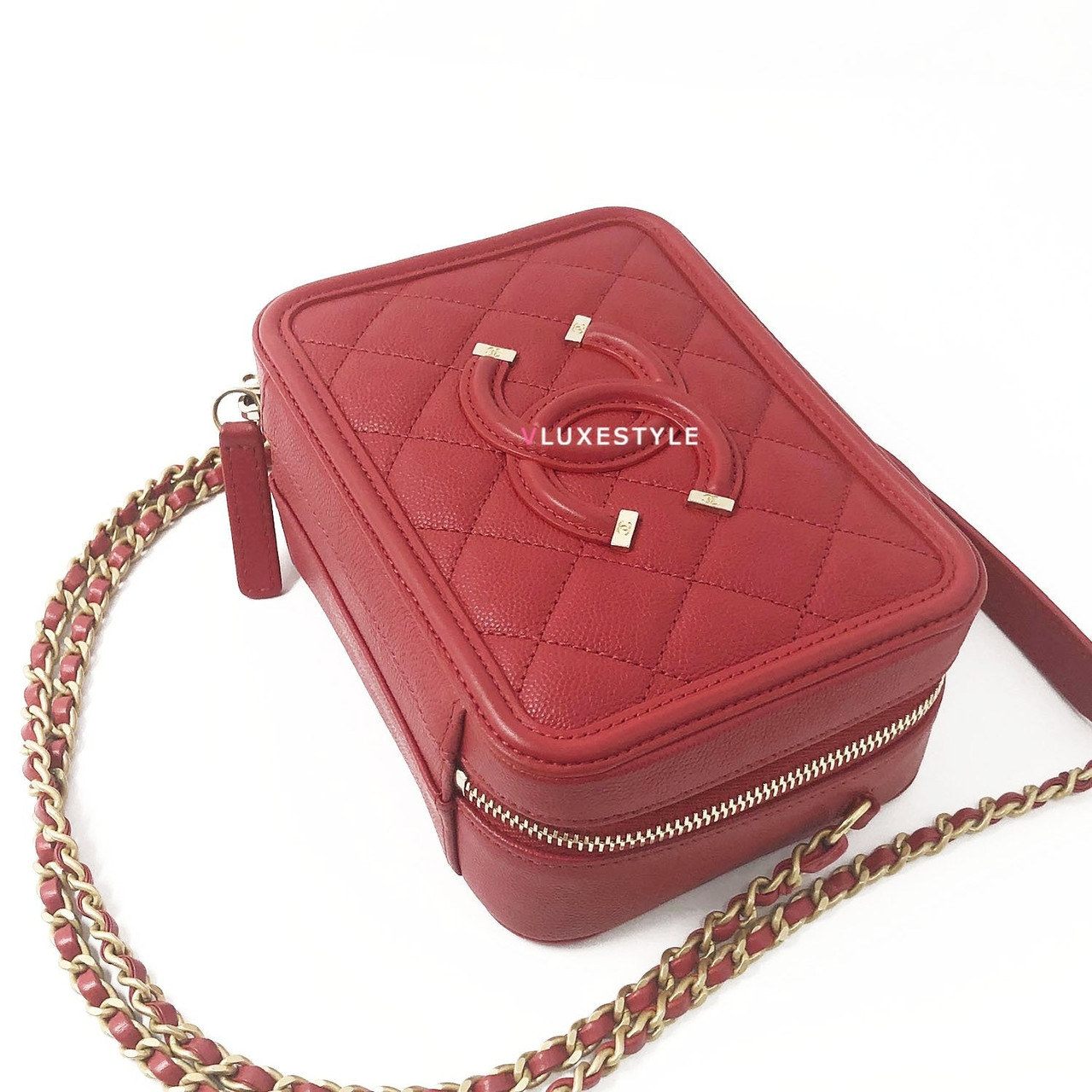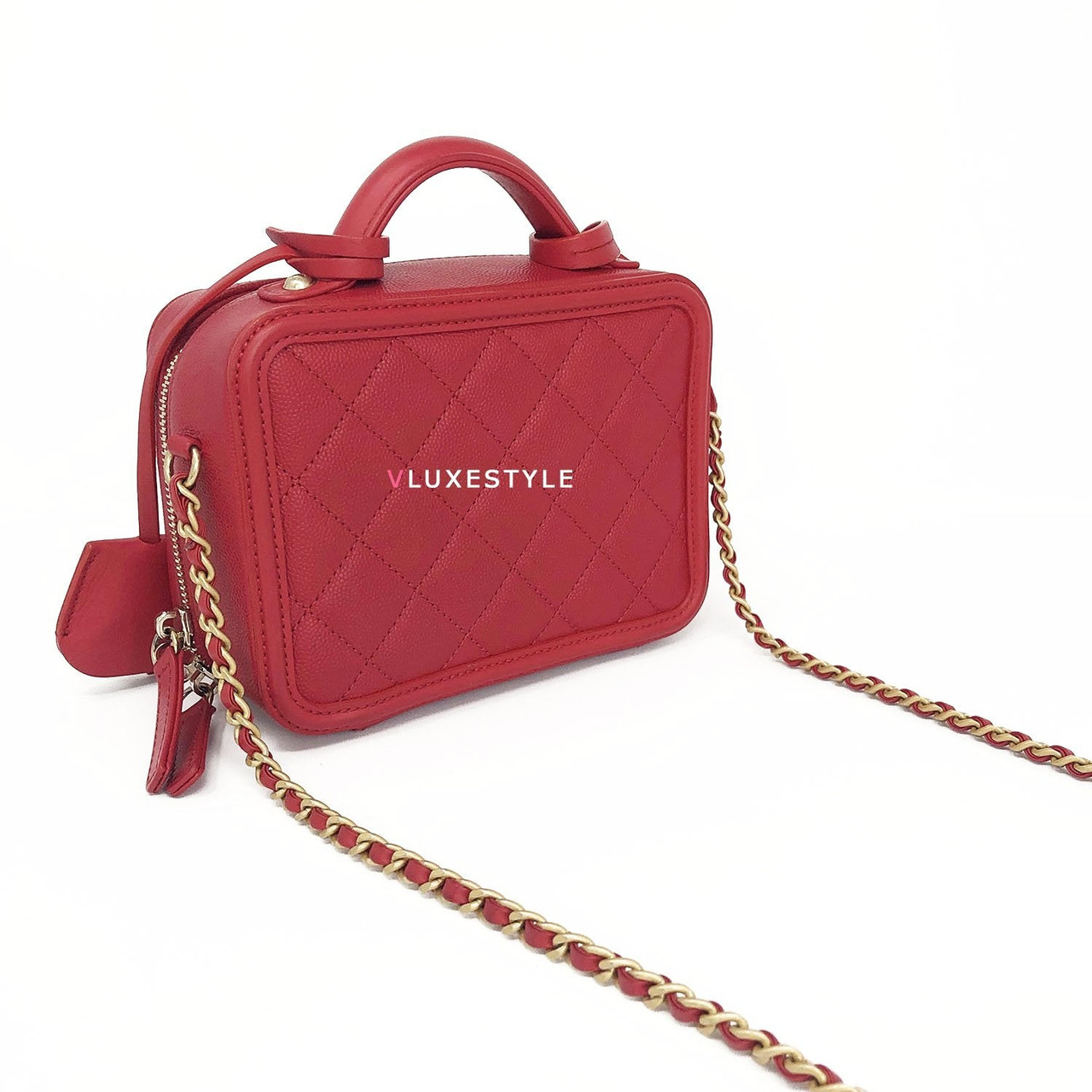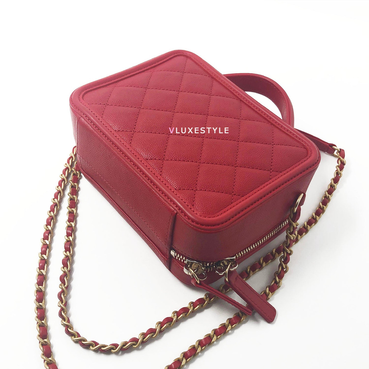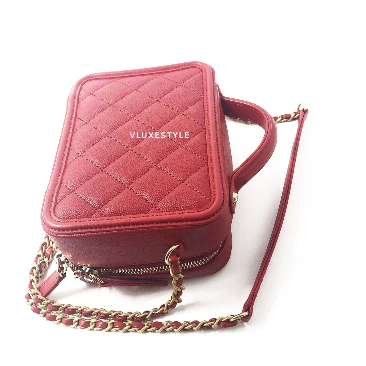 Authentic Chanel 18P Small Filigree Vanity Case Red Quilted Caviar with aged gold hardware. This stylish shoulder bag is crafted of luxurious and durable quilted caviar leather in stunning red and aged gold hardware with stitched Chanel CC logo in the center. Wear this bag handheld, cross-body or over-the-shoulder. Very chic and elegant a must-have for every Chanel lover.