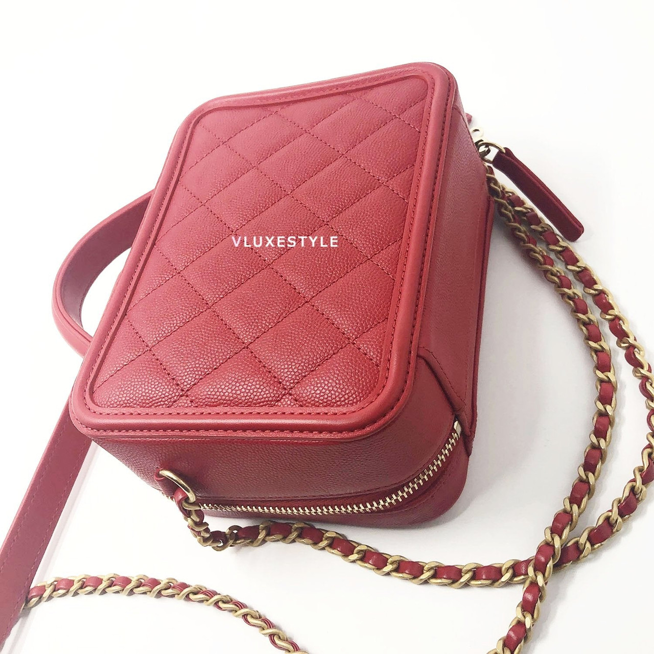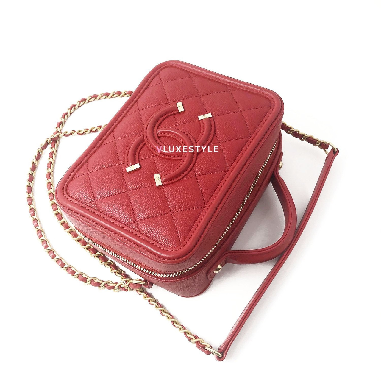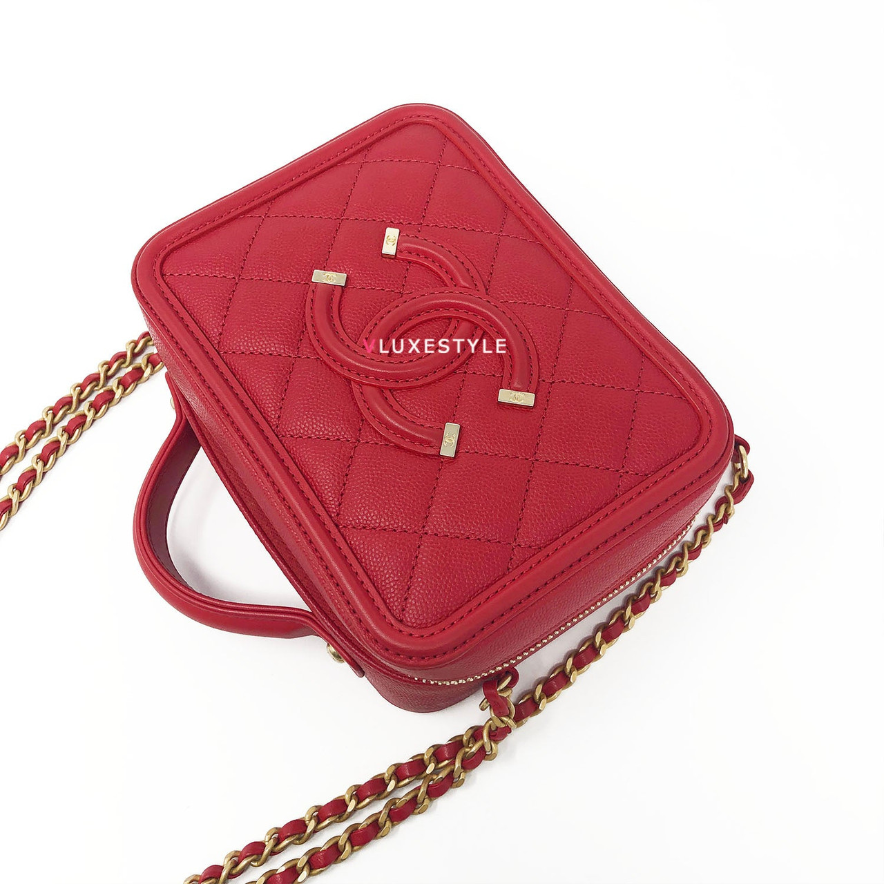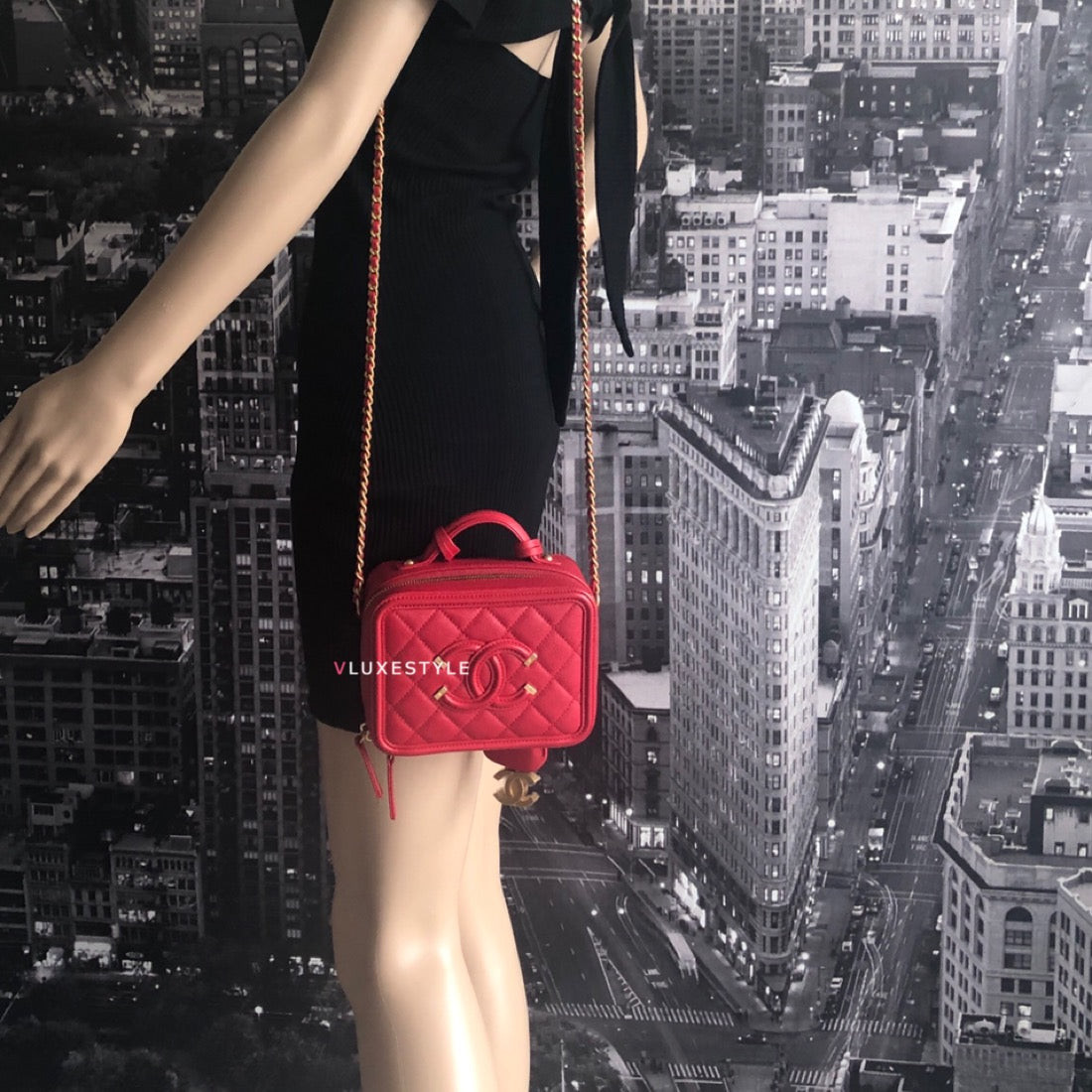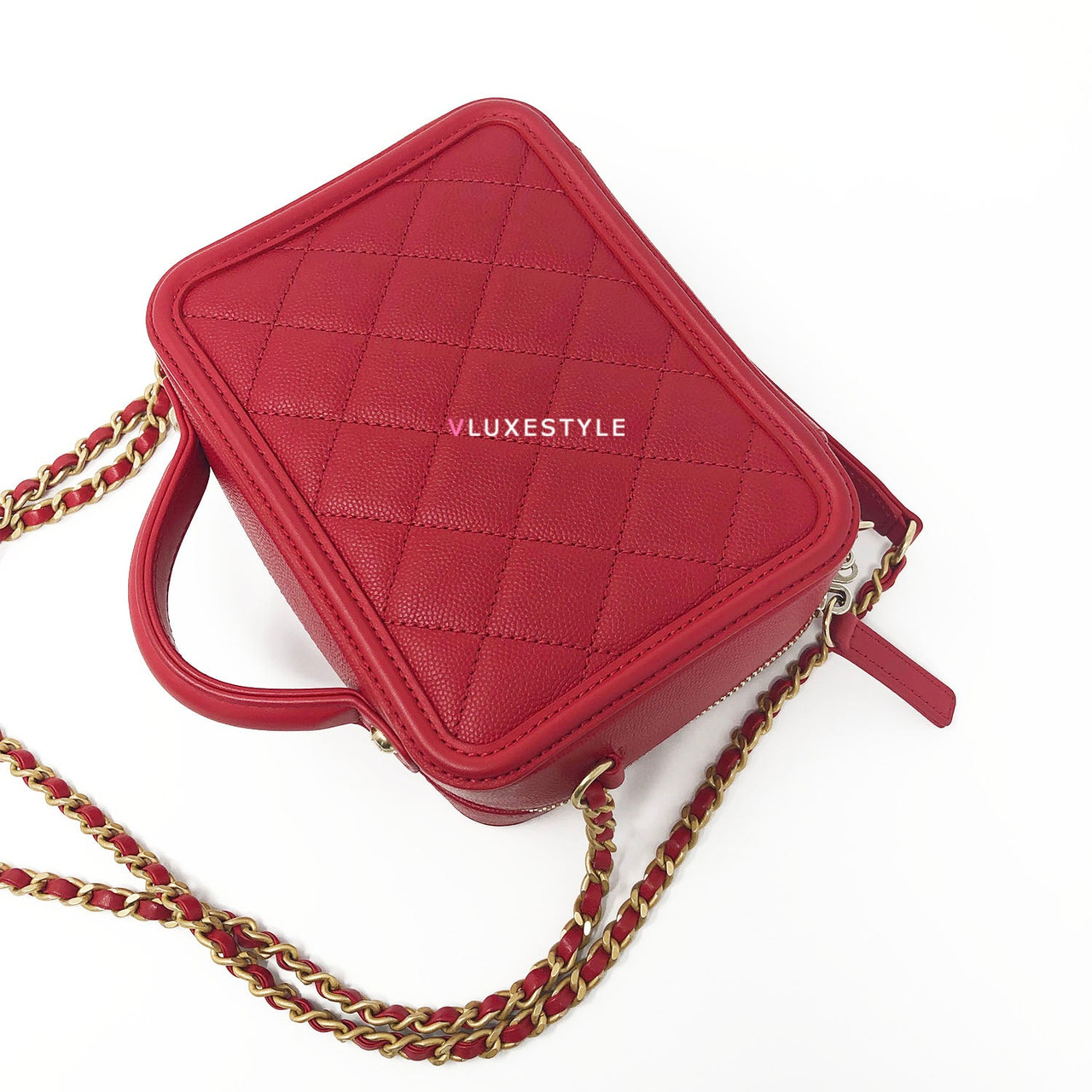 Authentic Chanel 18P Small Filigree Vanity Case Red Quilted Caviar with aged gold hardware. This stylish shoulder bag is crafted of luxurious and durable quilted caviar leather in stunning red and aged gold hardware with stitched Chanel CC logo in the center. Wear this bag handheld, cross-body or over-the-shoulder. Very chic and elegant a must-have for every Chanel lover.