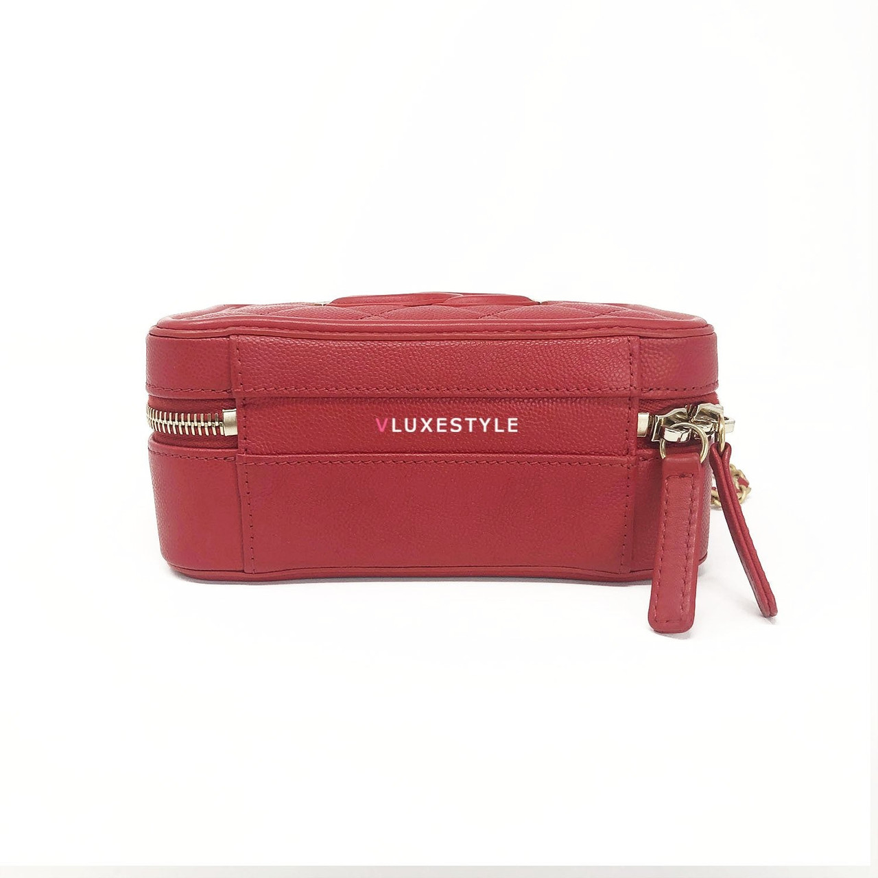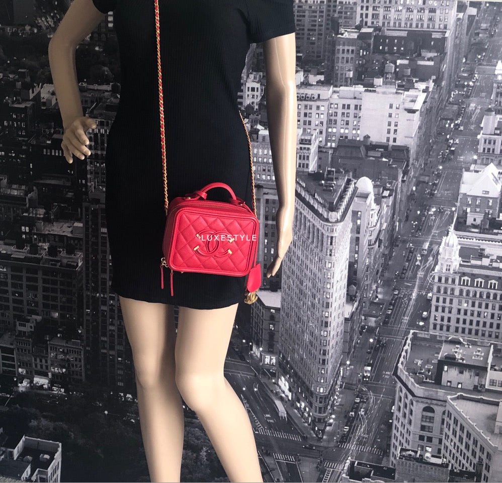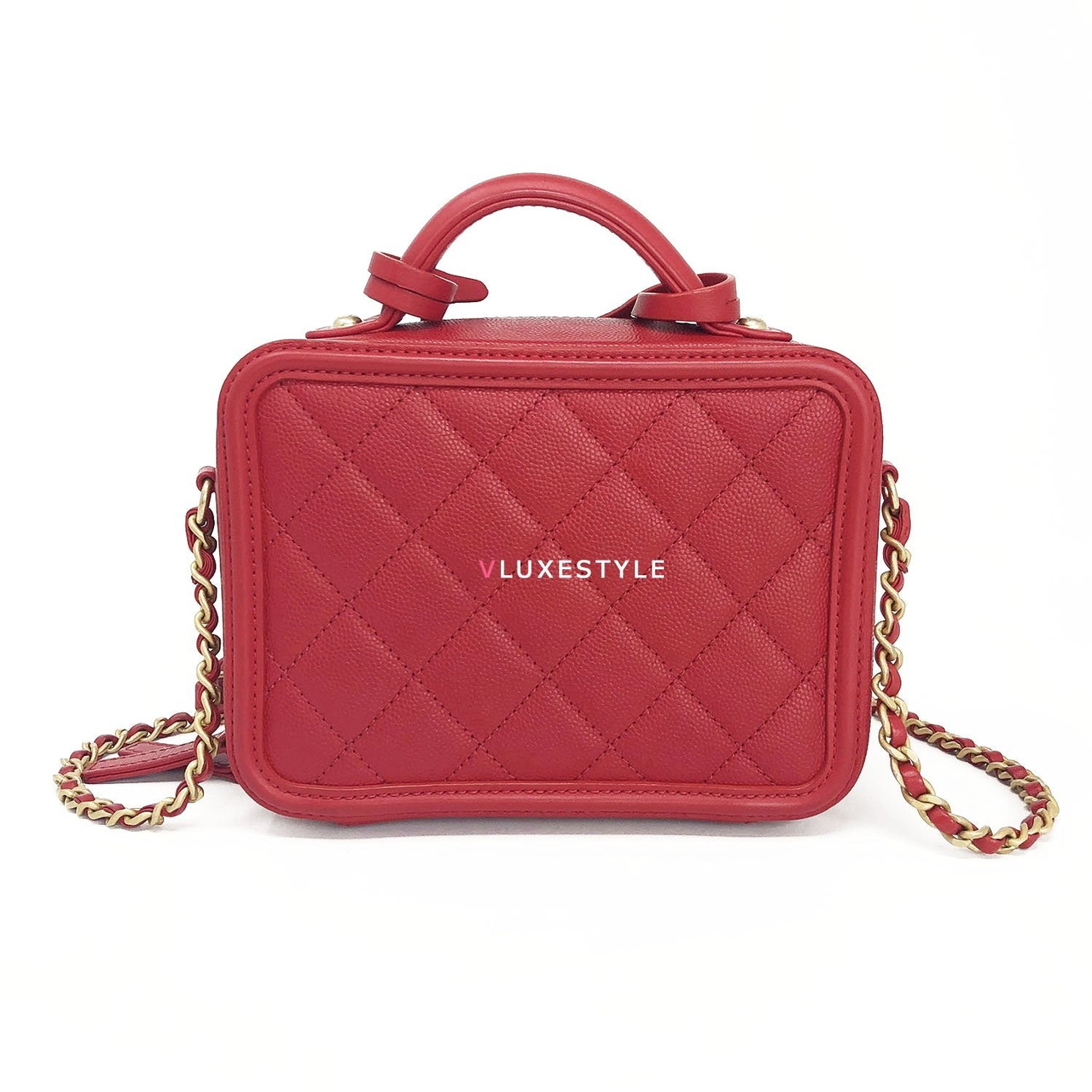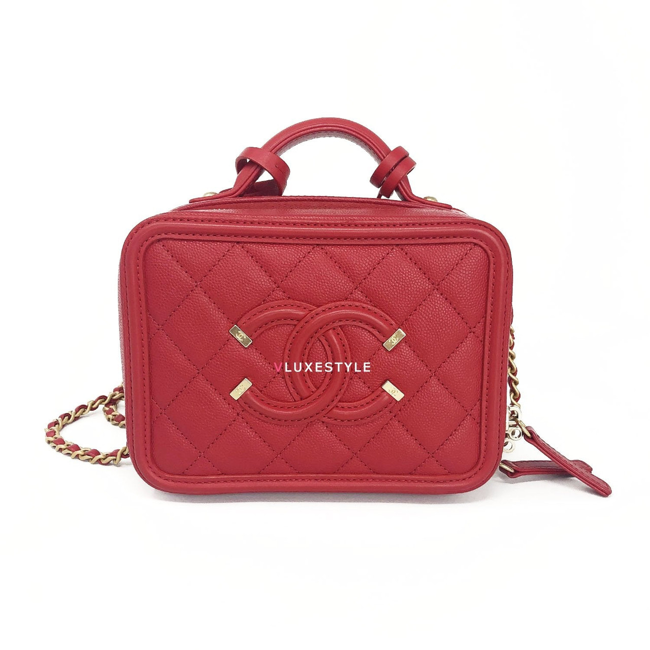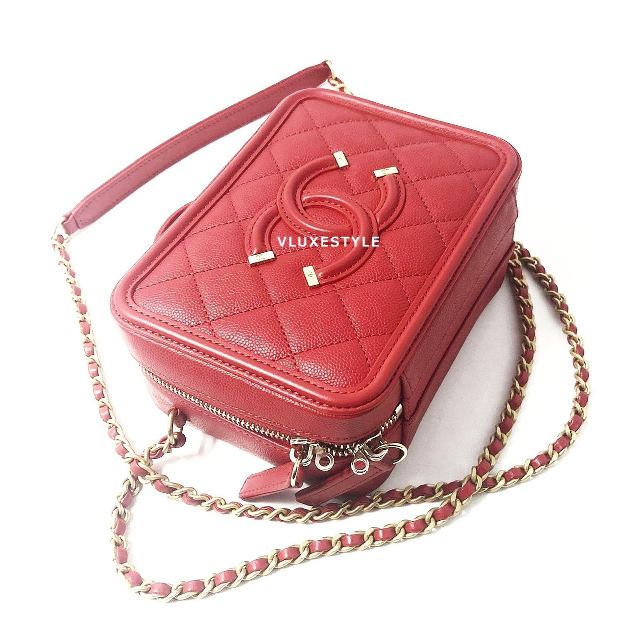 Authentic Chanel 18P Small Filigree Vanity Case Red Quilted Caviar with aged gold hardware. This stylish shoulder bag is crafted of luxurious and durable quilted caviar leather in stunning red and aged gold hardware with stitched Chanel CC logo in the center. Wear this bag handheld, cross-body or over-the-shoulder. Very chic and elegant a must-have for every Chanel lover.