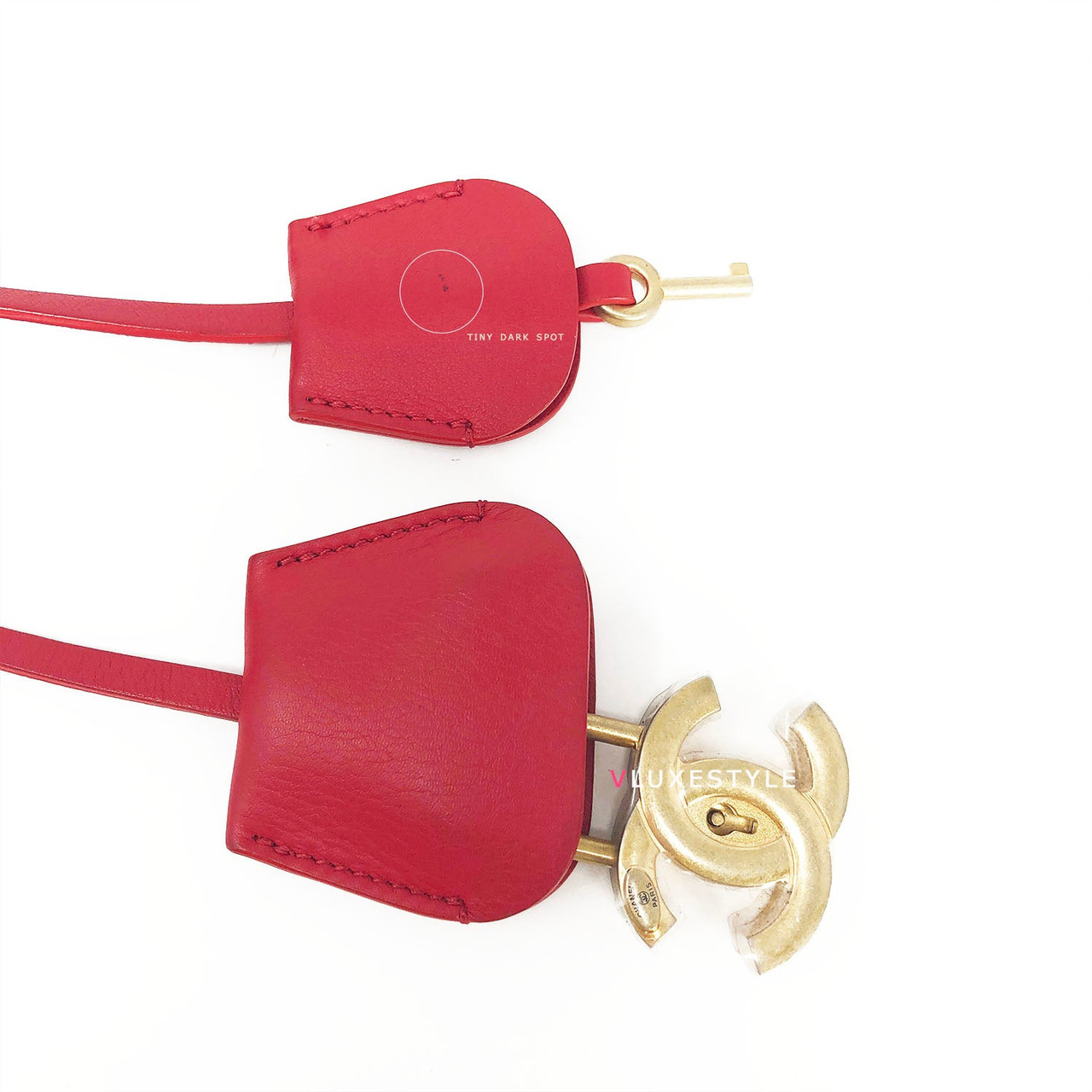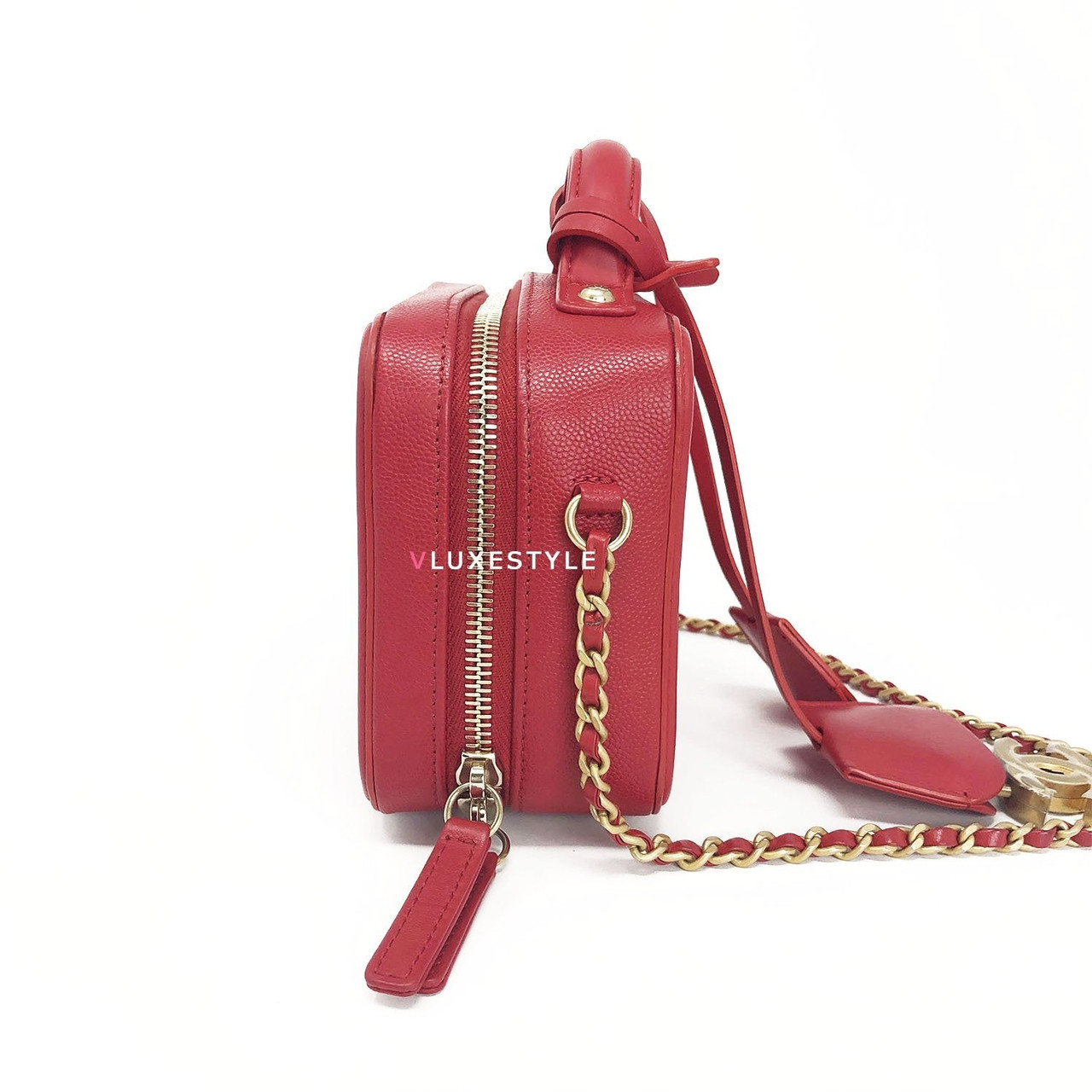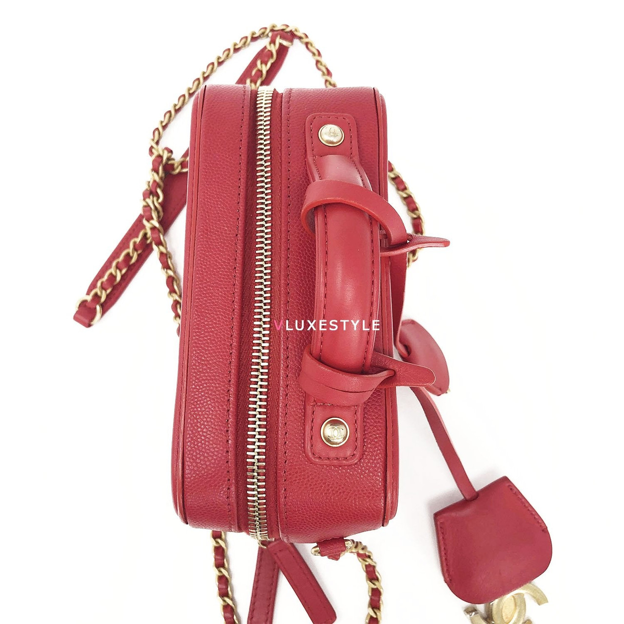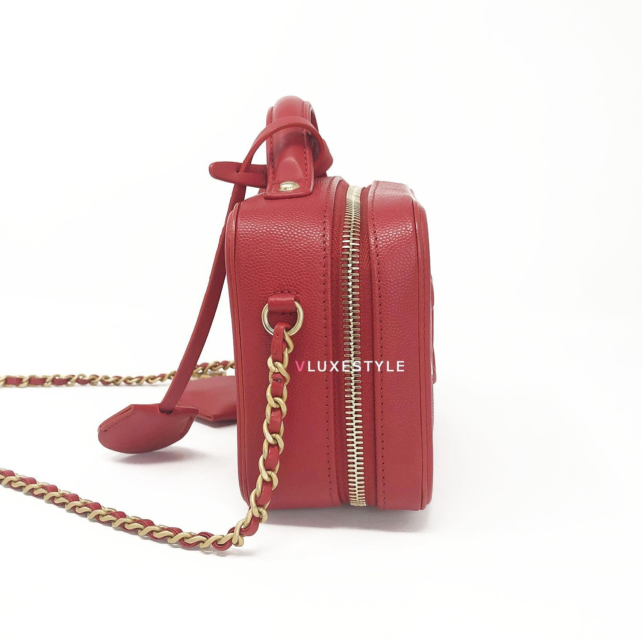 Authentic Chanel 18P Small Filigree Vanity Case Red Quilted Caviar with aged gold hardware. This stylish shoulder bag is crafted of luxurious and durable quilted caviar leather in stunning red and aged gold hardware with stitched Chanel CC logo in the center. Wear this bag handheld, cross-body or over-the-shoulder. Very chic and elegant a must-have for every Chanel lover.
