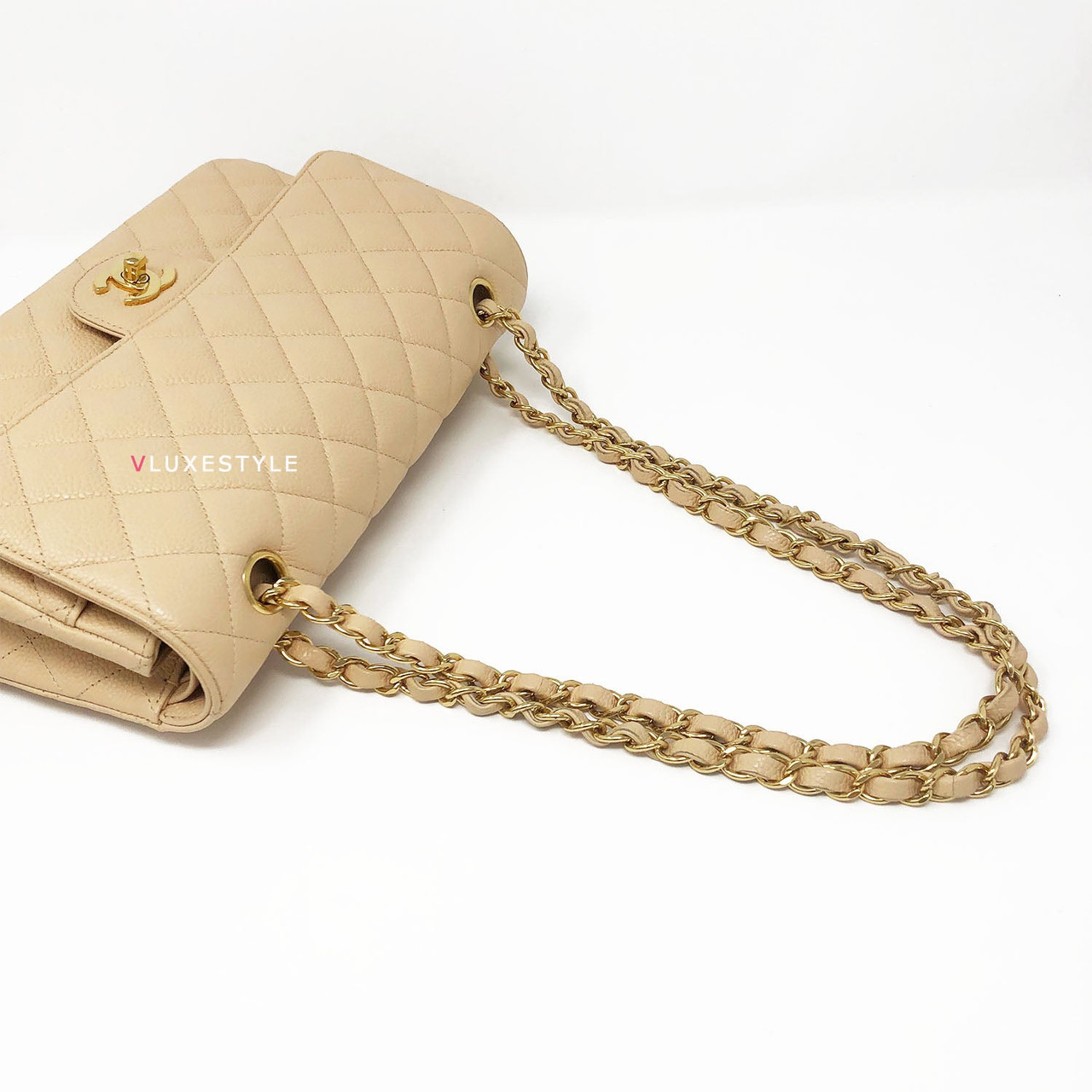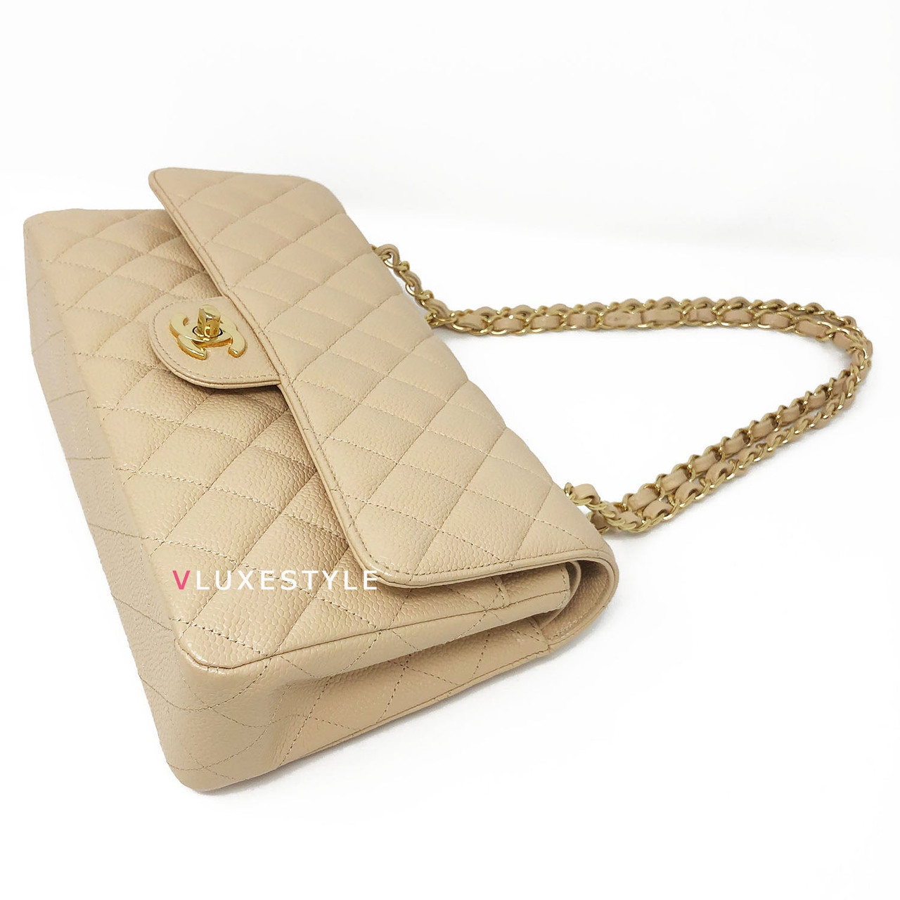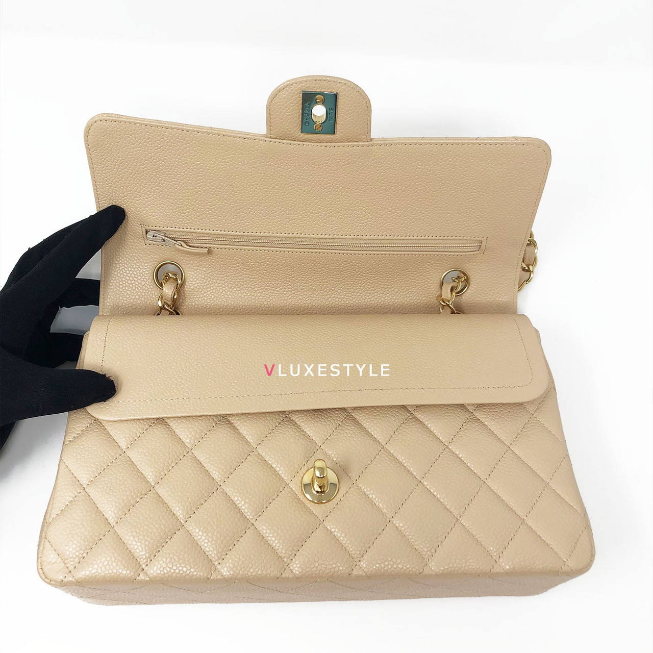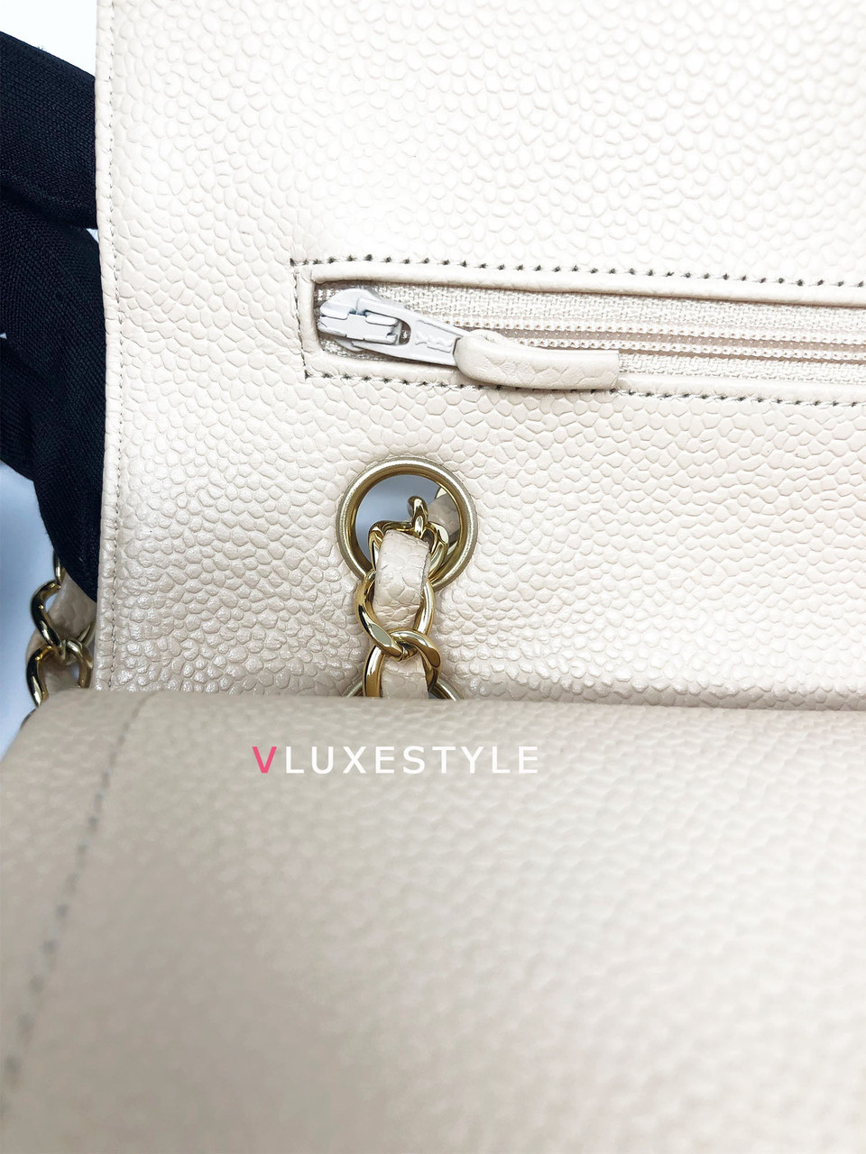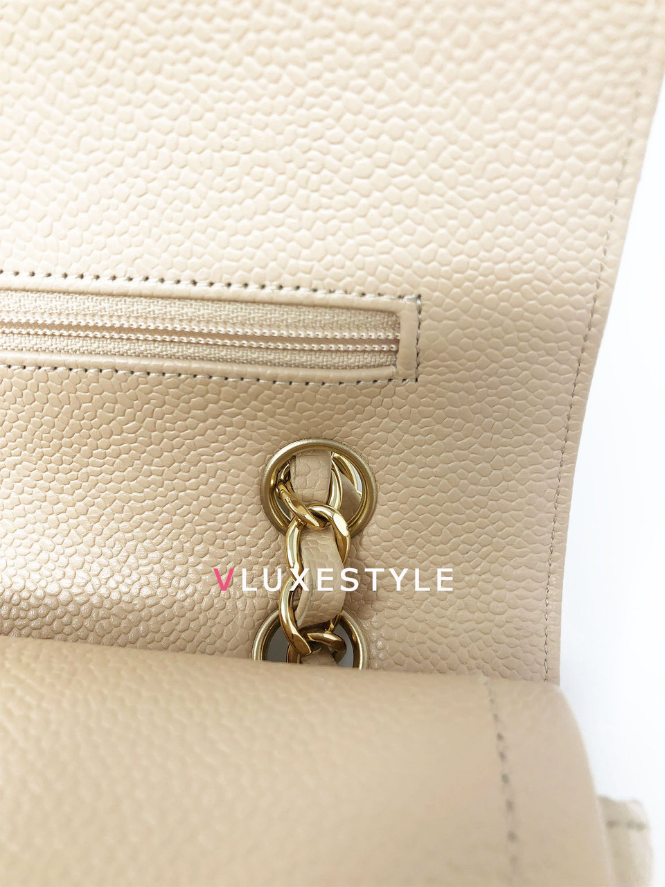 Just arrived! Classic Beige Medium Caviar with gold hardware. Made in France/23 series/2017. The bag is in excellent condition, no color transfer, no corner wear, light hairline scratches on the cc hardware, protective sticker on the inside hardware. The bag is clean inside and out.