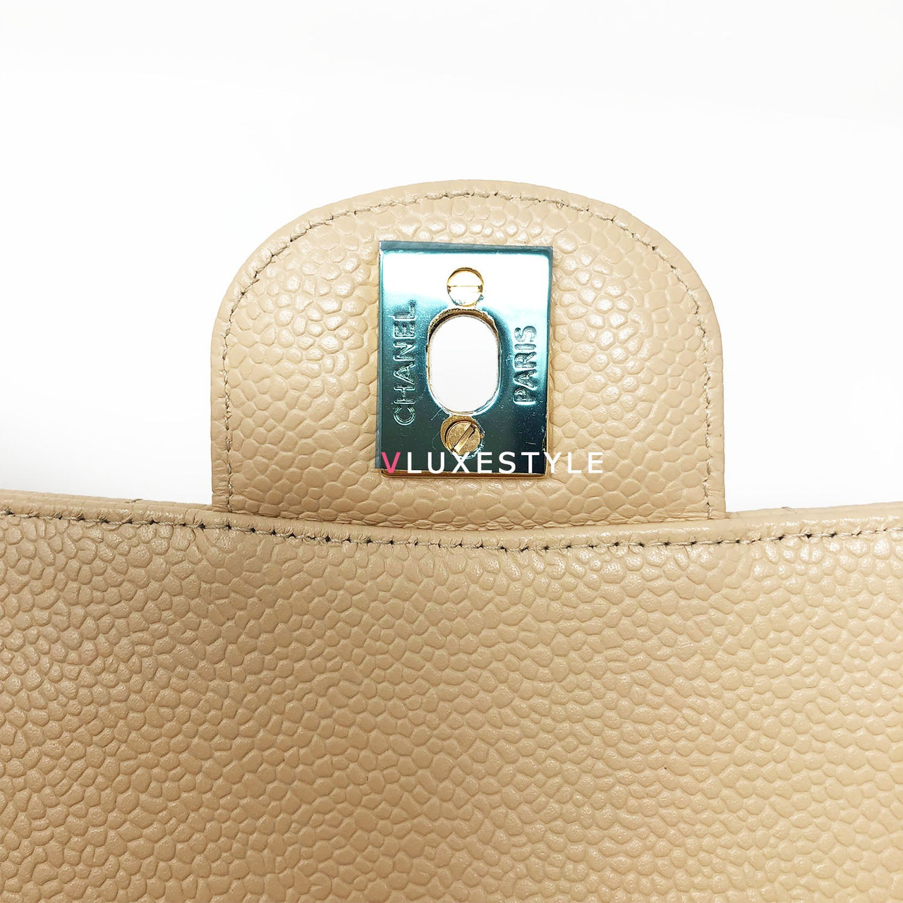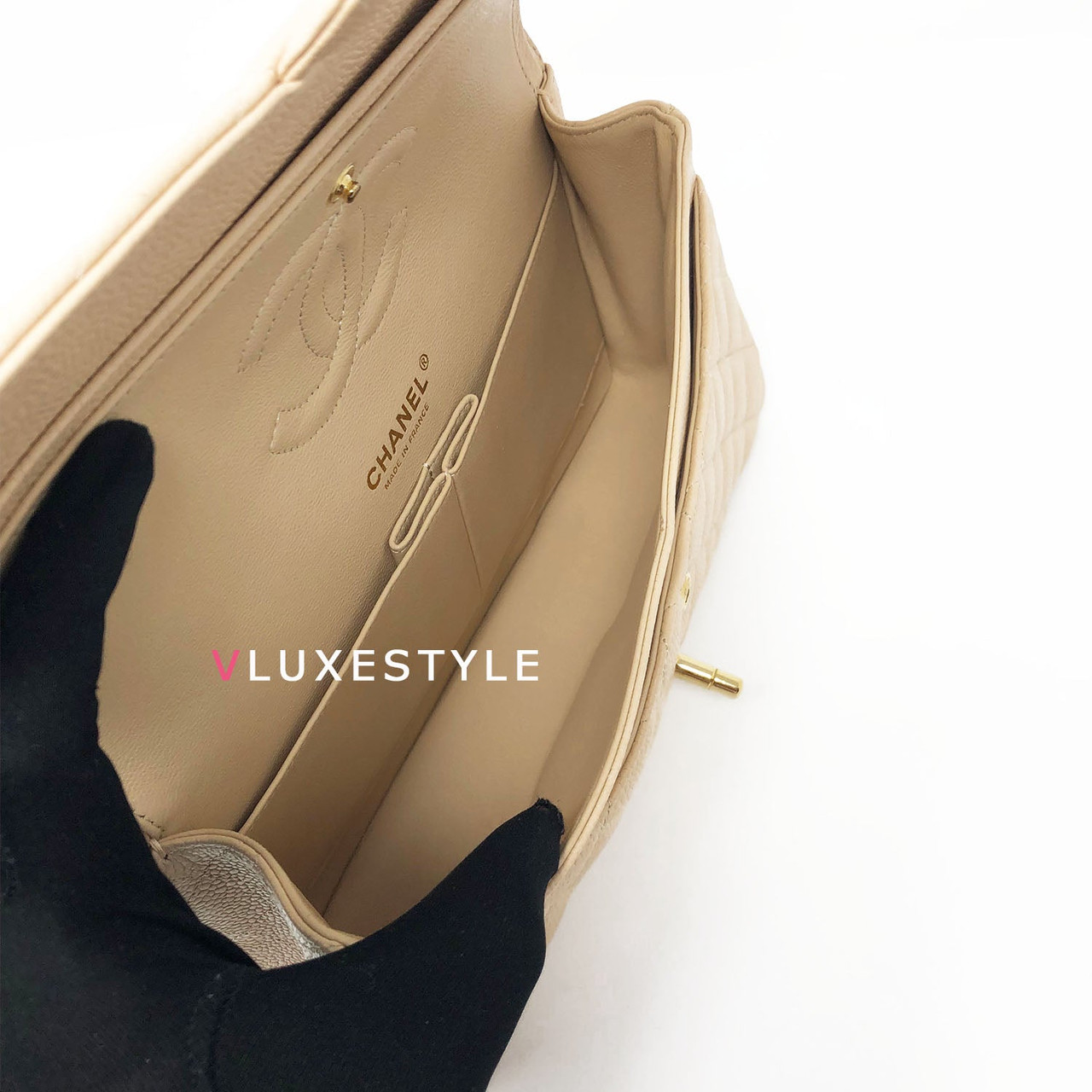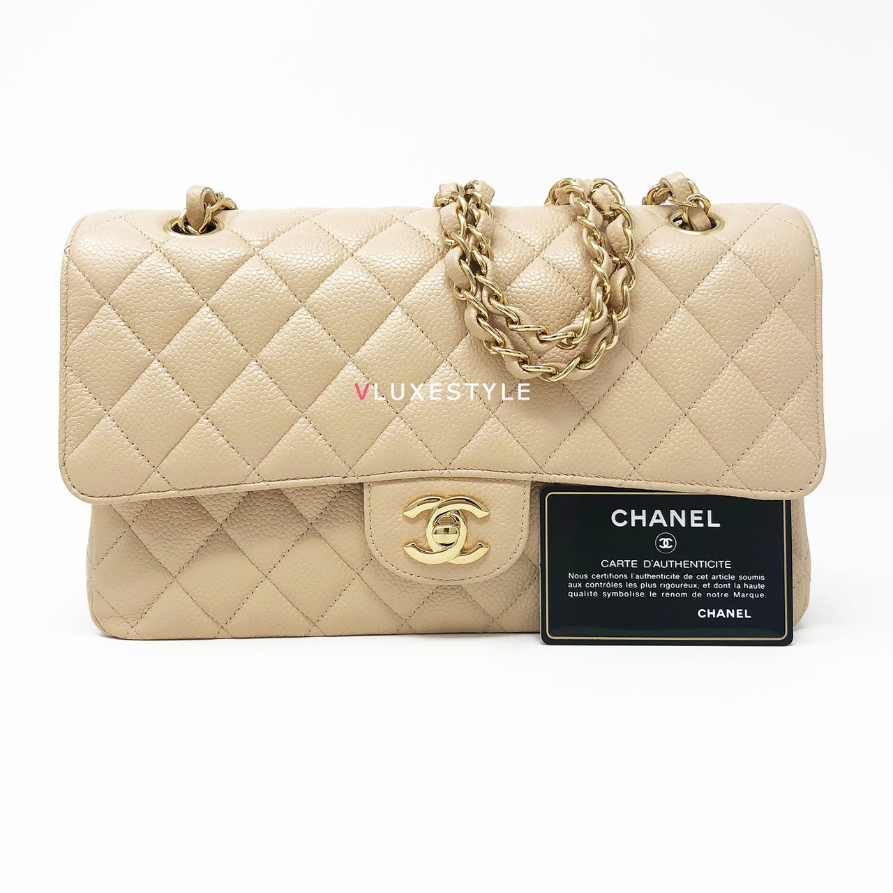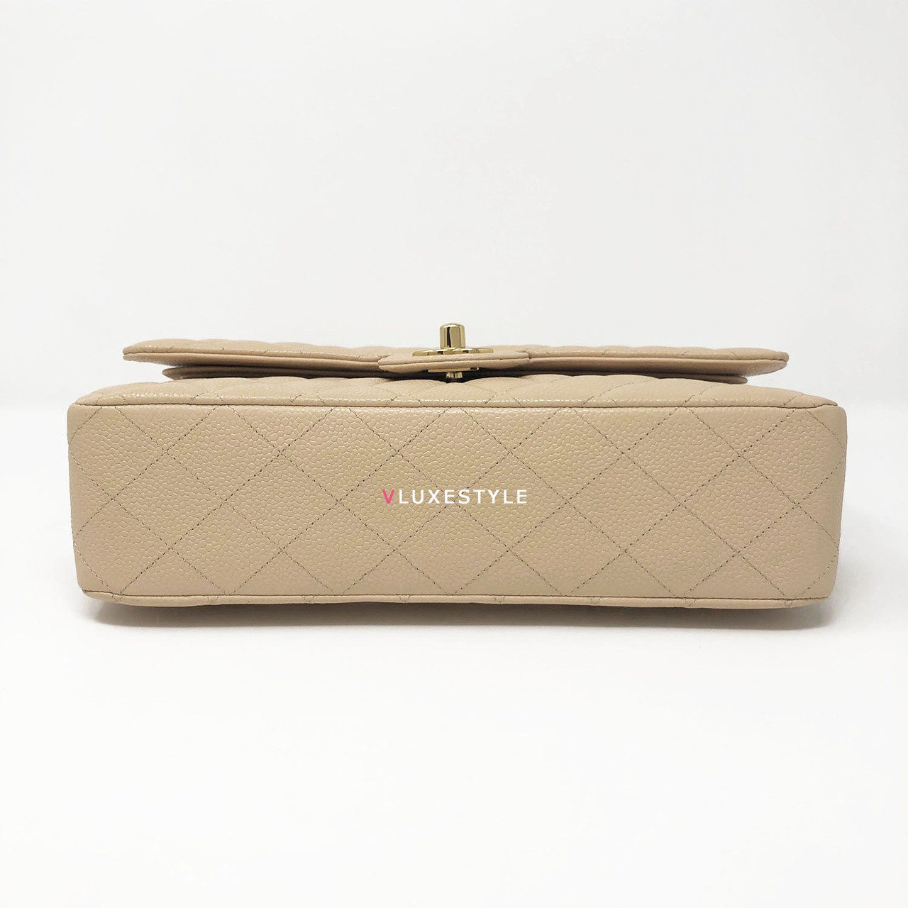 Just arrived! Classic Beige Medium Caviar with gold hardware. Made in France/23 series/2017. The bag is in excellent condition, no color transfer, no corner wear, light hairline scratches on the cc hardware, protective sticker on the inside hardware. The bag is clean inside and out.