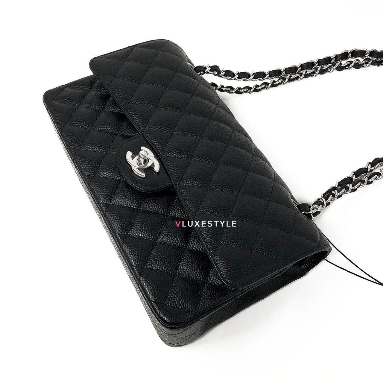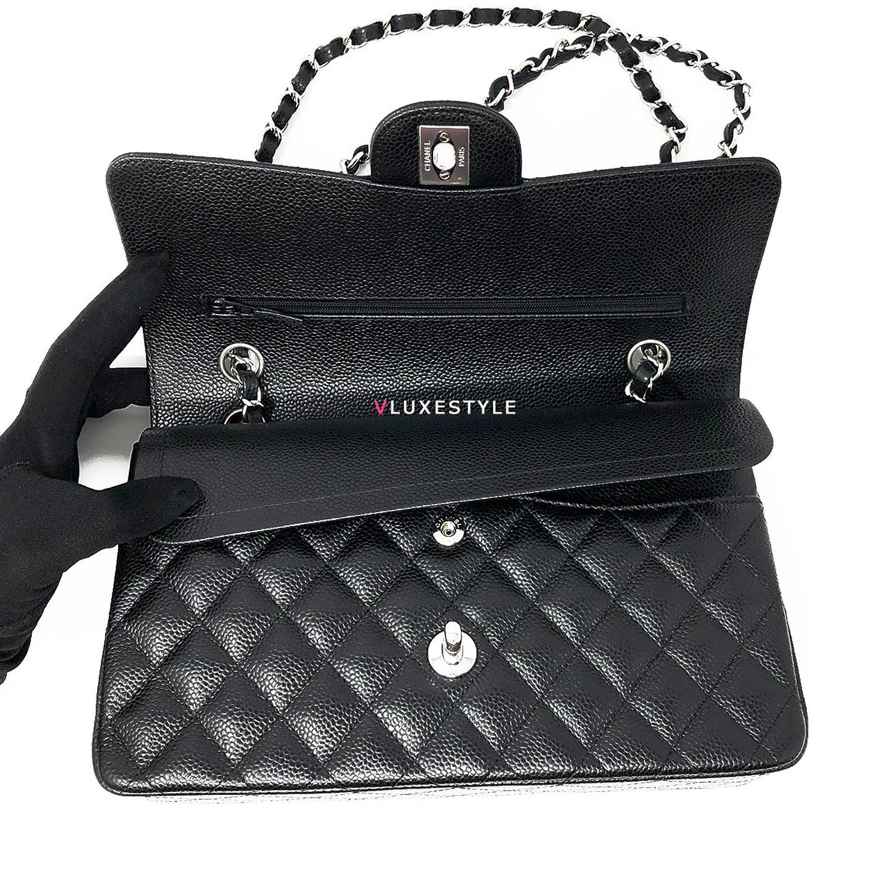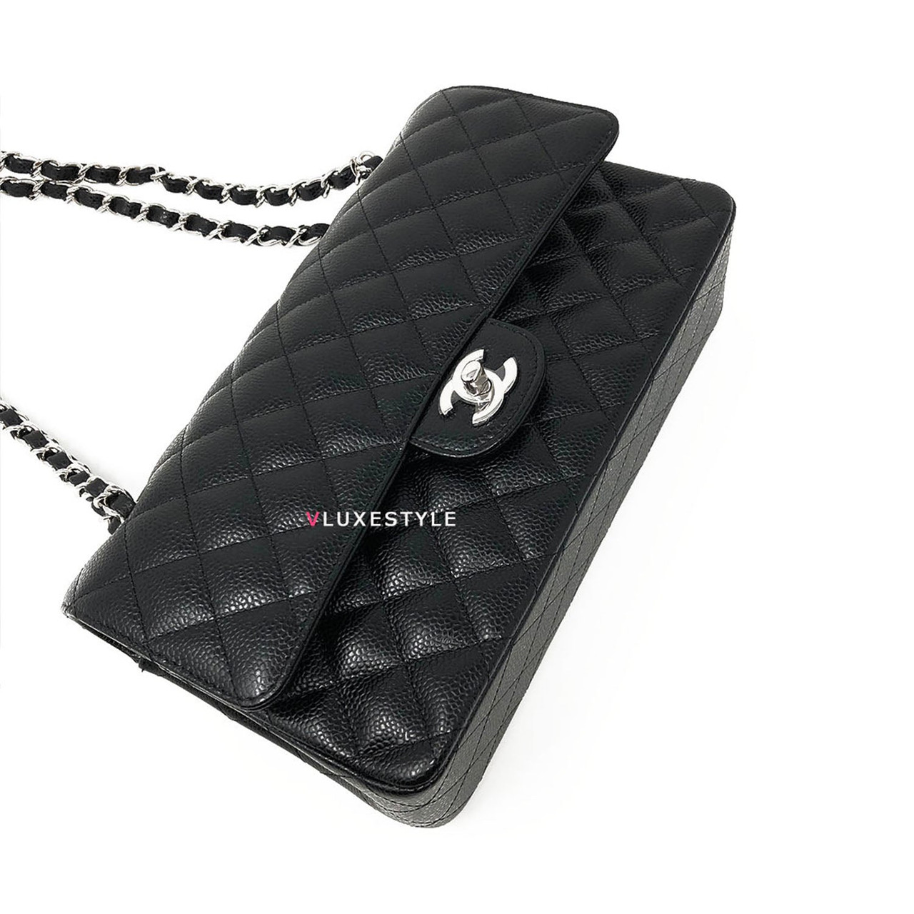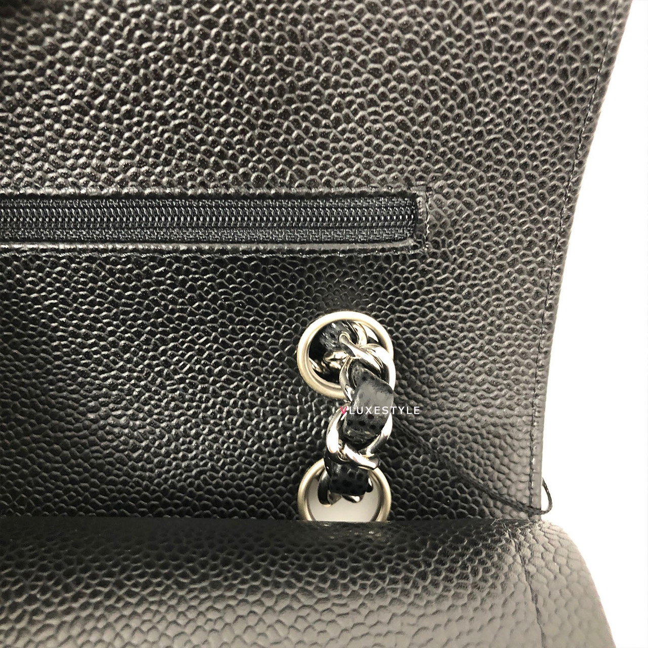 Gorgeous and Authentic Chanel Classic Medium Double Flap Black Quilted Caviar with silver hardware. This timeless and stylish shoulder bag is crafted of luxurious and durable caviar leather in black and silver hardware. The bag can be worn long and short over-the-shoulder. It is essentially a timeless piece that exudes elegance, its the perfect bag for every occasion.