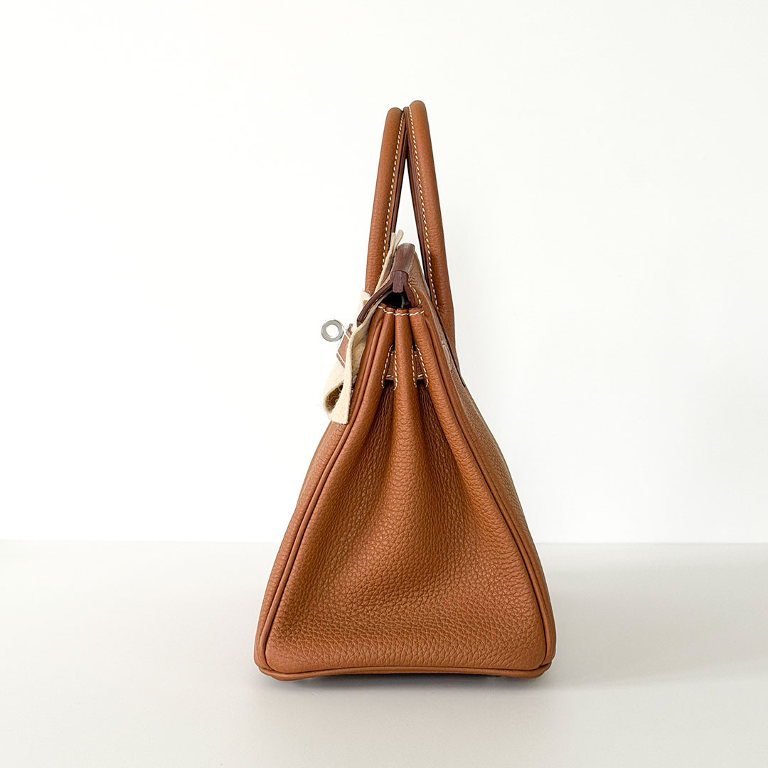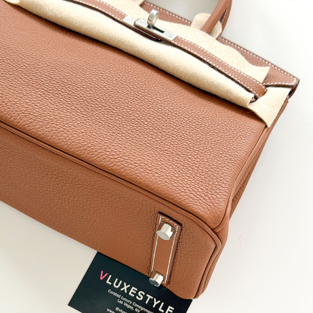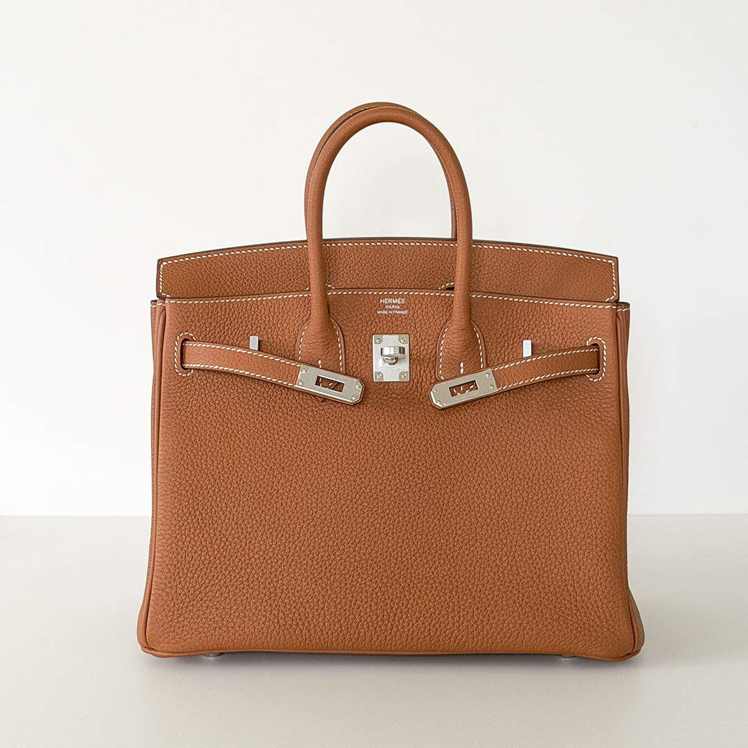 The Hermés Birkin 25cm Gold Togo is a luxurious and timeless handbag. Crafted from grained calfskin leather, known for its durability and scratch resistance, this luxurious piece is designed to stand the test of time. The exquisite palladium hardware beautifully complements the caramel buttery tan leather,  adding a touch of modern elegance. Perfectly sized at 25cm, this Birkin bag is spacious enough to hold all your essentials.