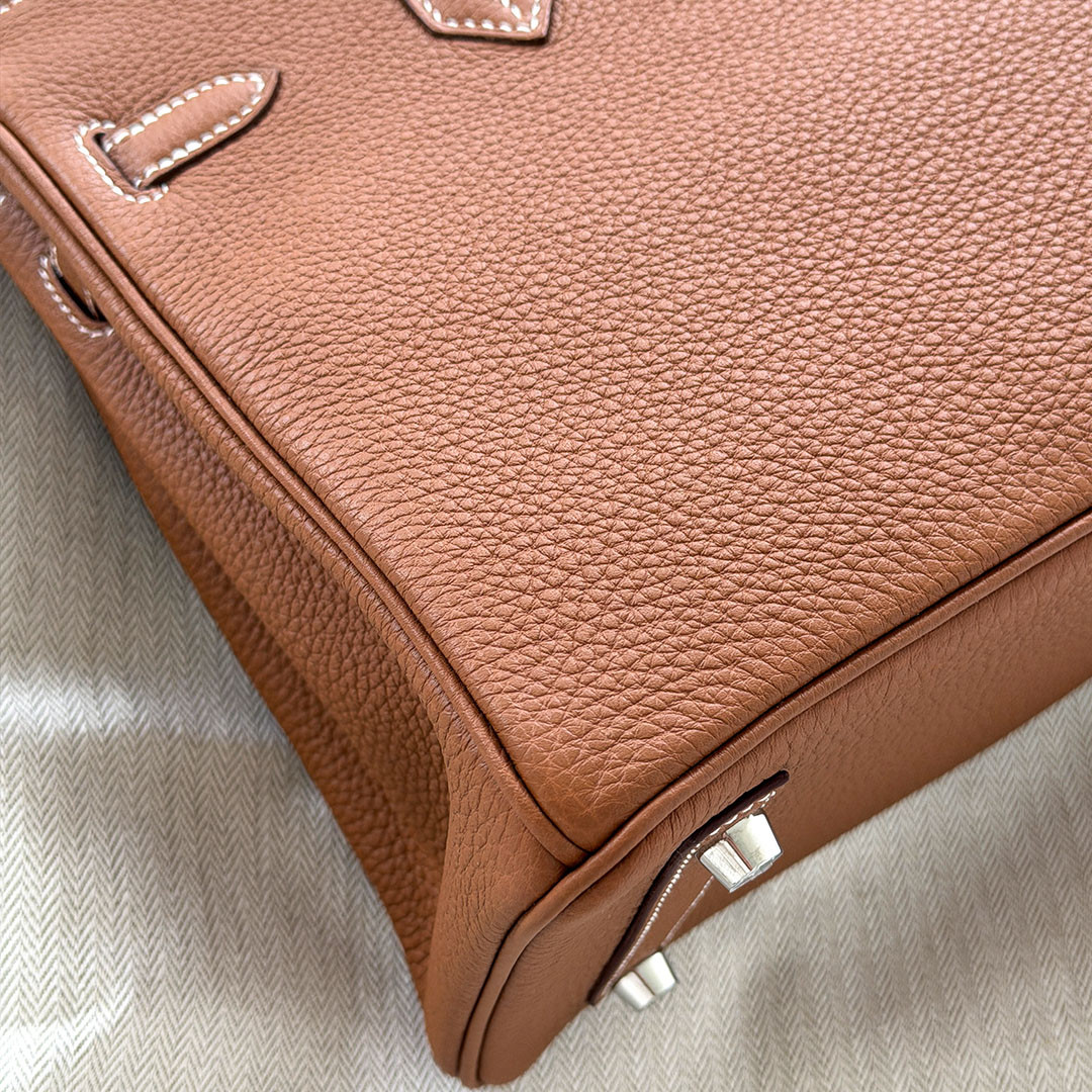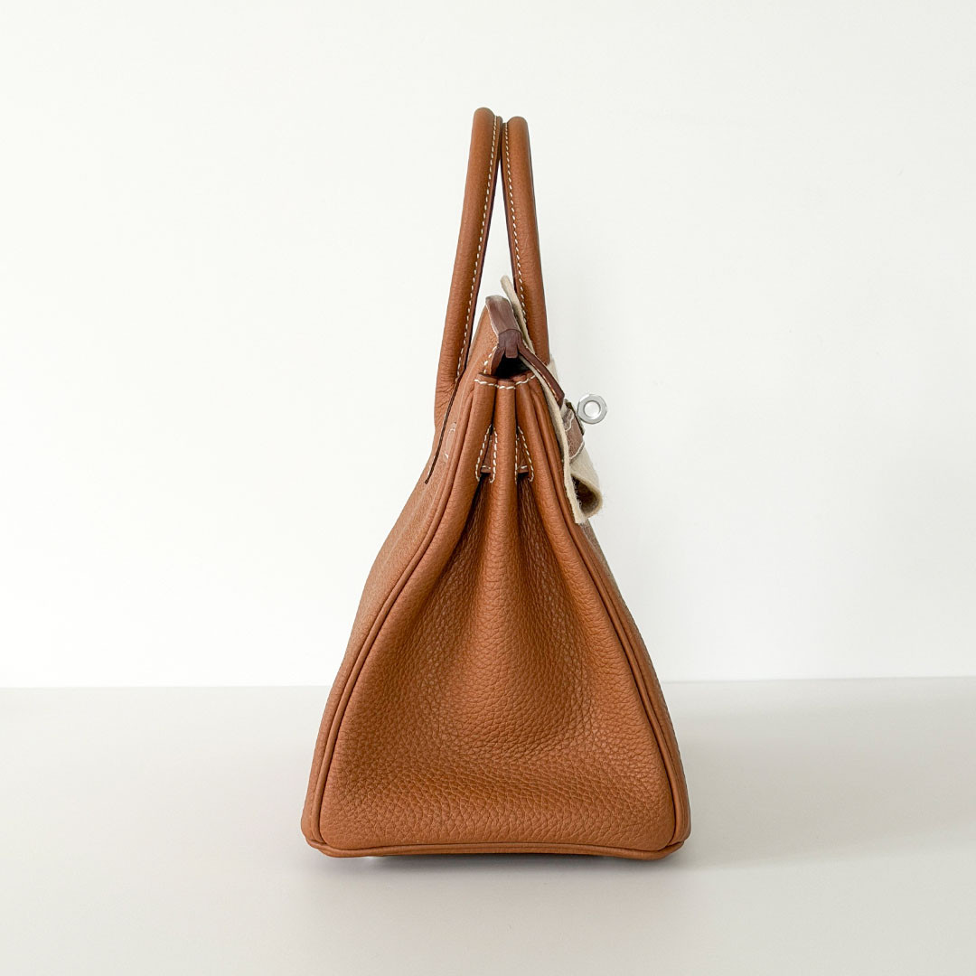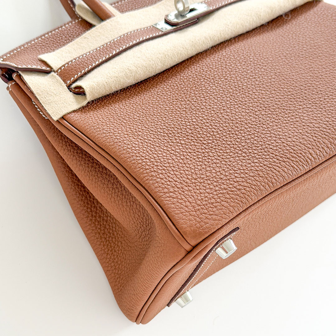 The Hermés Birkin 25cm Gold Togo is a luxurious and timeless handbag. Crafted from grained calfskin leather, known for its durability and scratch resistance, this luxurious piece is designed to stand the test of time. The exquisite palladium hardware beautifully complements the caramel buttery tan leather,  adding a touch of modern elegance. Perfectly sized at 25cm, this Birkin bag is spacious enough to hold all your essentials.