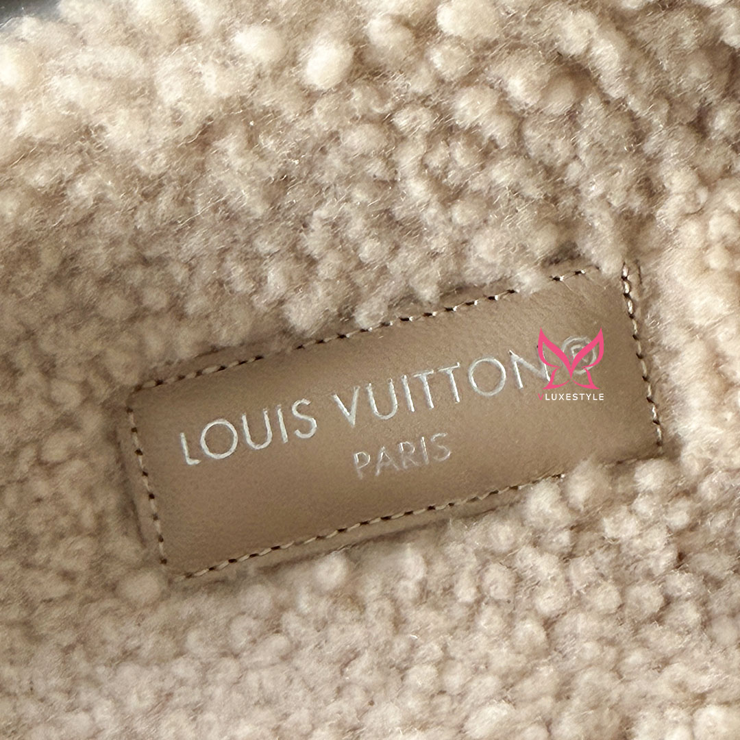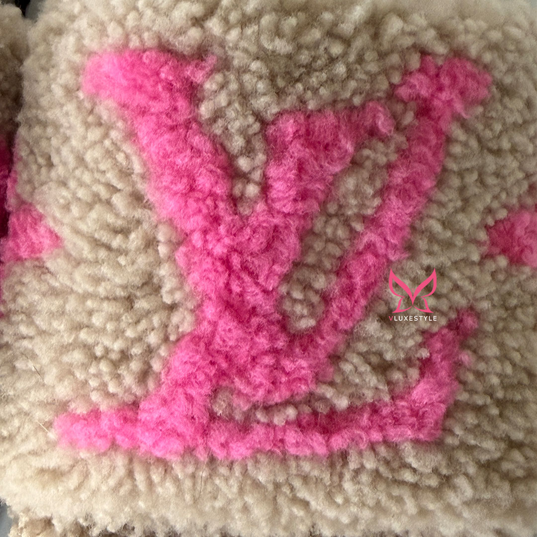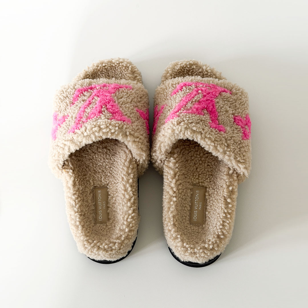 The Shearling Paseo Flat Comfort Mule in Beige Pink Monogram is an exquisite blend of luxurious comfort and iconic style from LOUIS VUITTON. Designed with beige shearling exterior, these chic mules feature a bold pink LV logo that adds a touch of luxury.