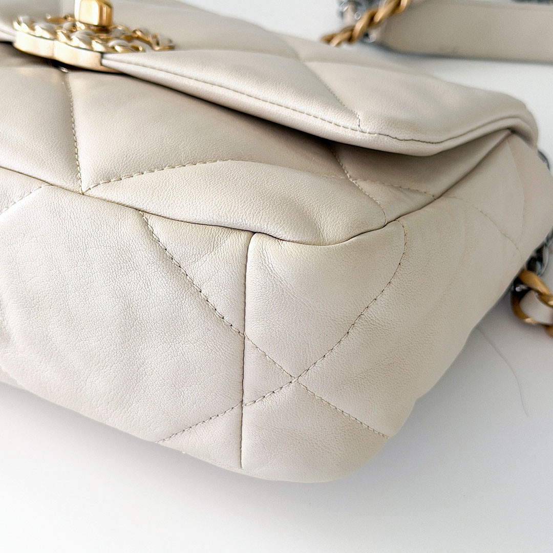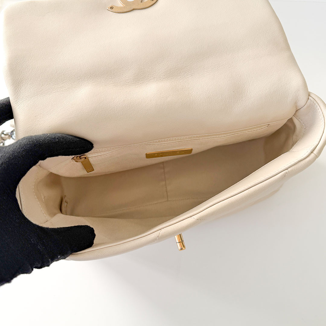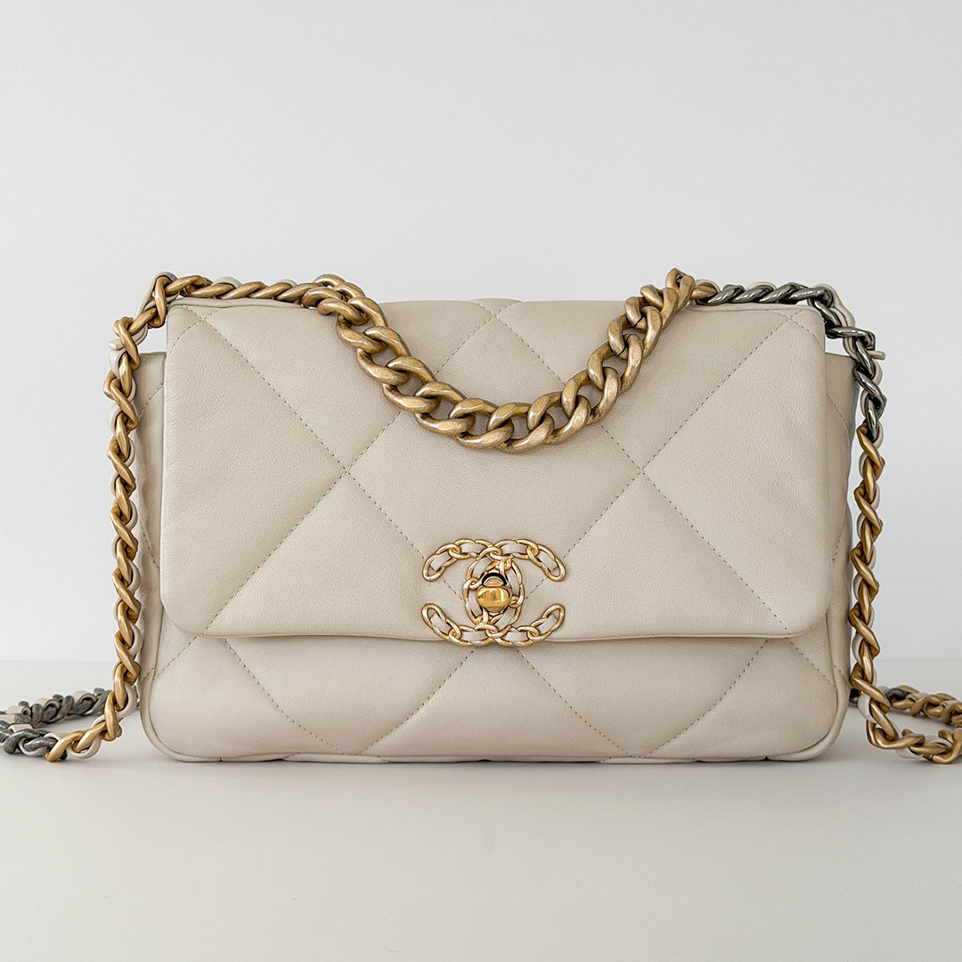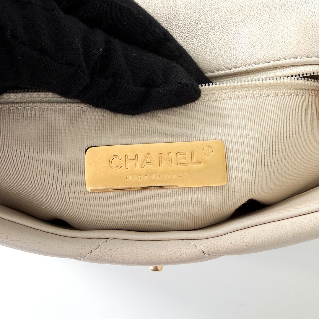 The CHANEL Small/Medium 19 Flap Beige Lambskin is a luxurious and versatile shoulder bag crafted from high-quality lambskin leather in a timeless beige. This handbag features a unique diamond quilting pattern and multi-tone hardware in silver, light gold, and brushed gold, giving it a modern and chic look.