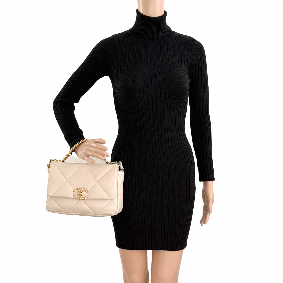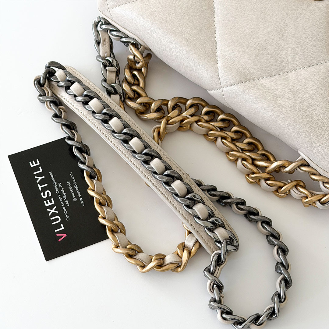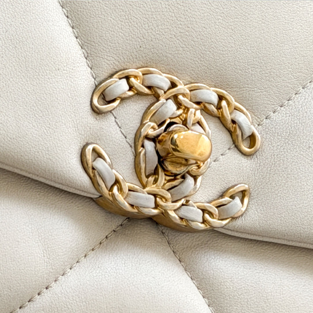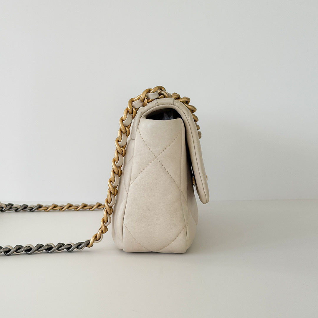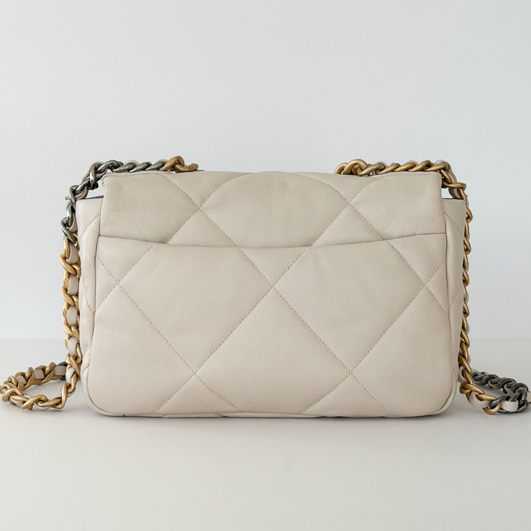 The CHANEL Small/Medium 19 Flap Beige Lambskin is a luxurious and versatile shoulder bag crafted from high-quality lambskin leather in a timeless beige. This handbag features a unique diamond quilting pattern and multi-tone hardware in silver, light gold, and brushed gold, giving it a modern and chic look.