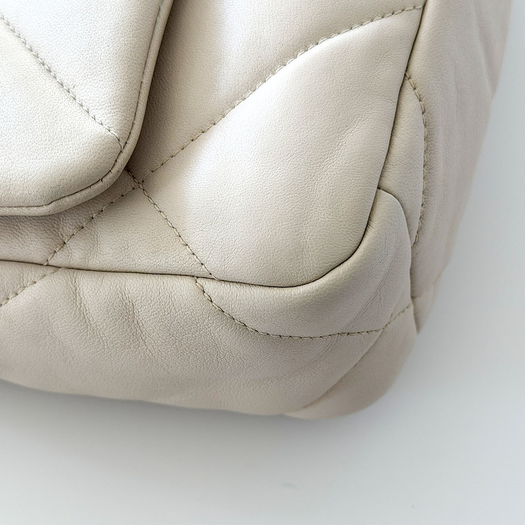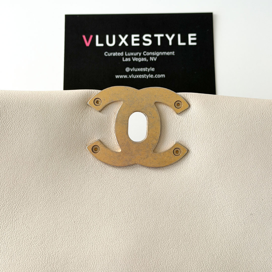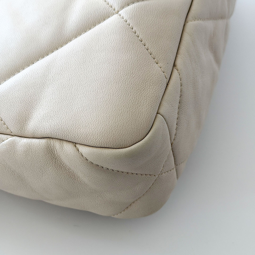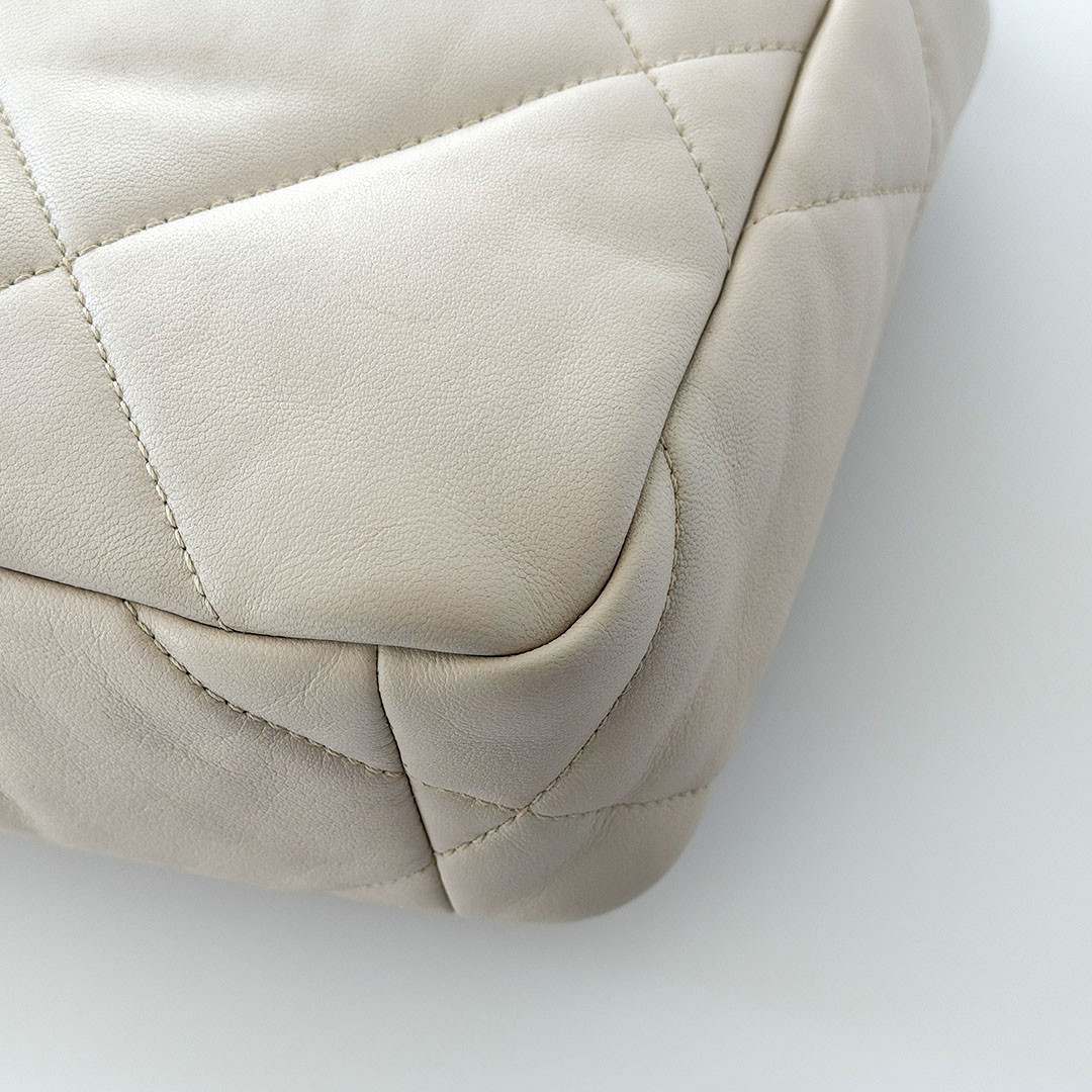 The CHANEL Small/Medium 19 Flap Beige Lambskin is a luxurious and versatile shoulder bag crafted from high-quality lambskin leather in a timeless beige. This handbag features a unique diamond quilting pattern and multi-tone hardware in silver, light gold, and brushed gold, giving it a modern and chic look.