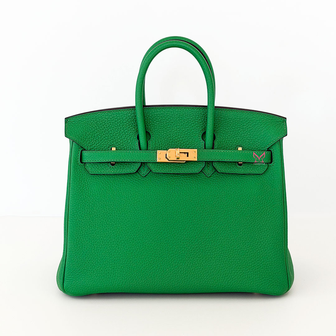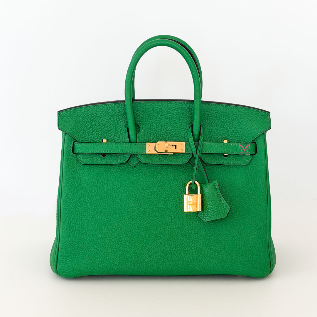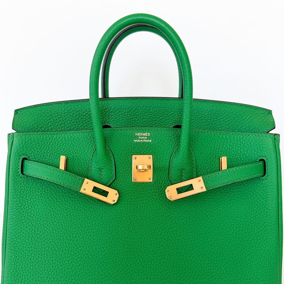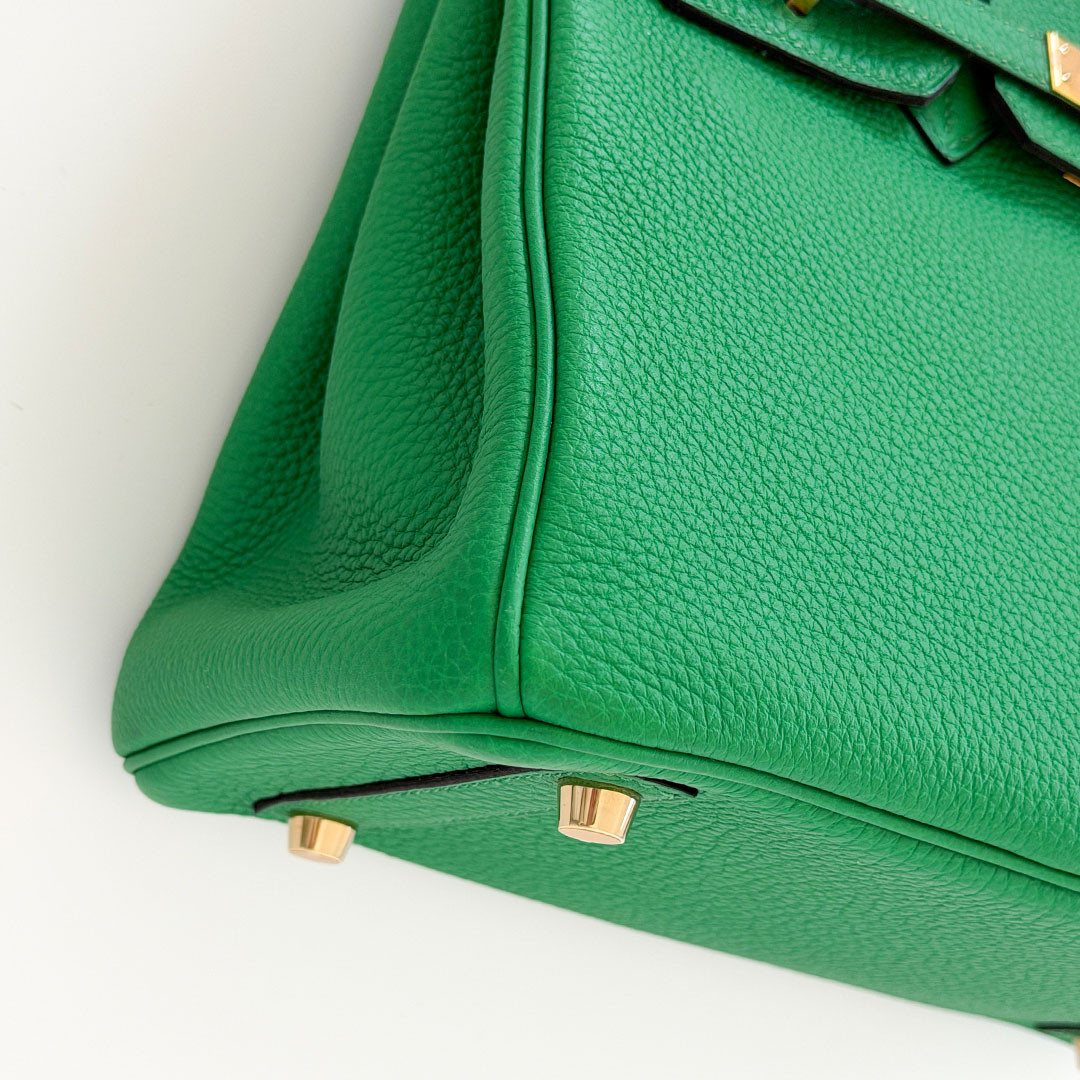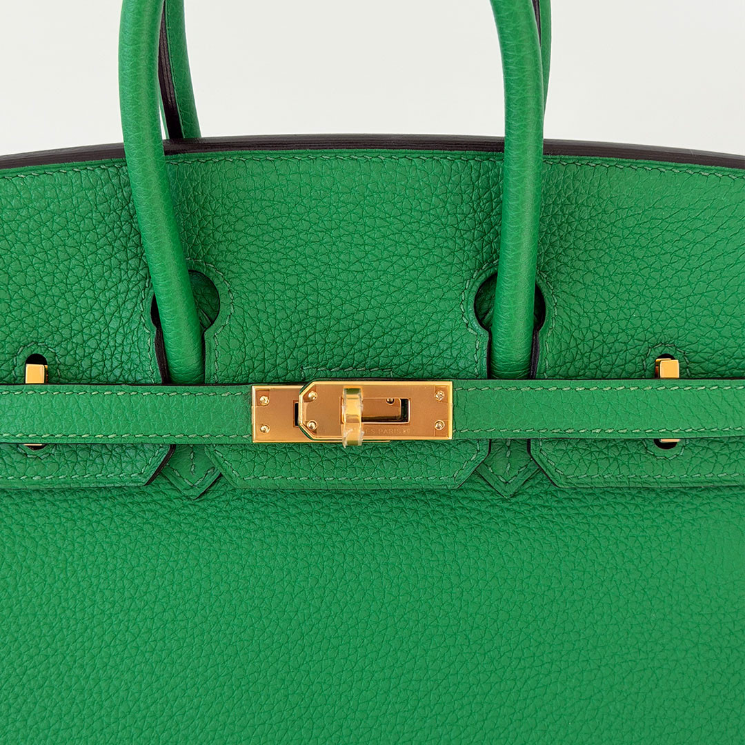 The Hermés Birkin 25cm Bambou Togo is a luxurious and timeless handbag. This rare and sought-after piece is crafted from grained calfskin leather, known for its durability and scratch resistance. This luxurious piece is designed to stand the test of time. The exquisite gold hardware beautifully complements the rich, saturated green leather. Perfectly sized at 25cm, this Birkin bag is spacious enough to hold all your essentials.