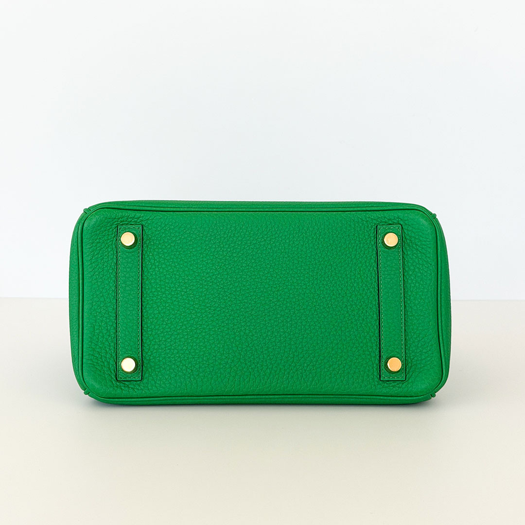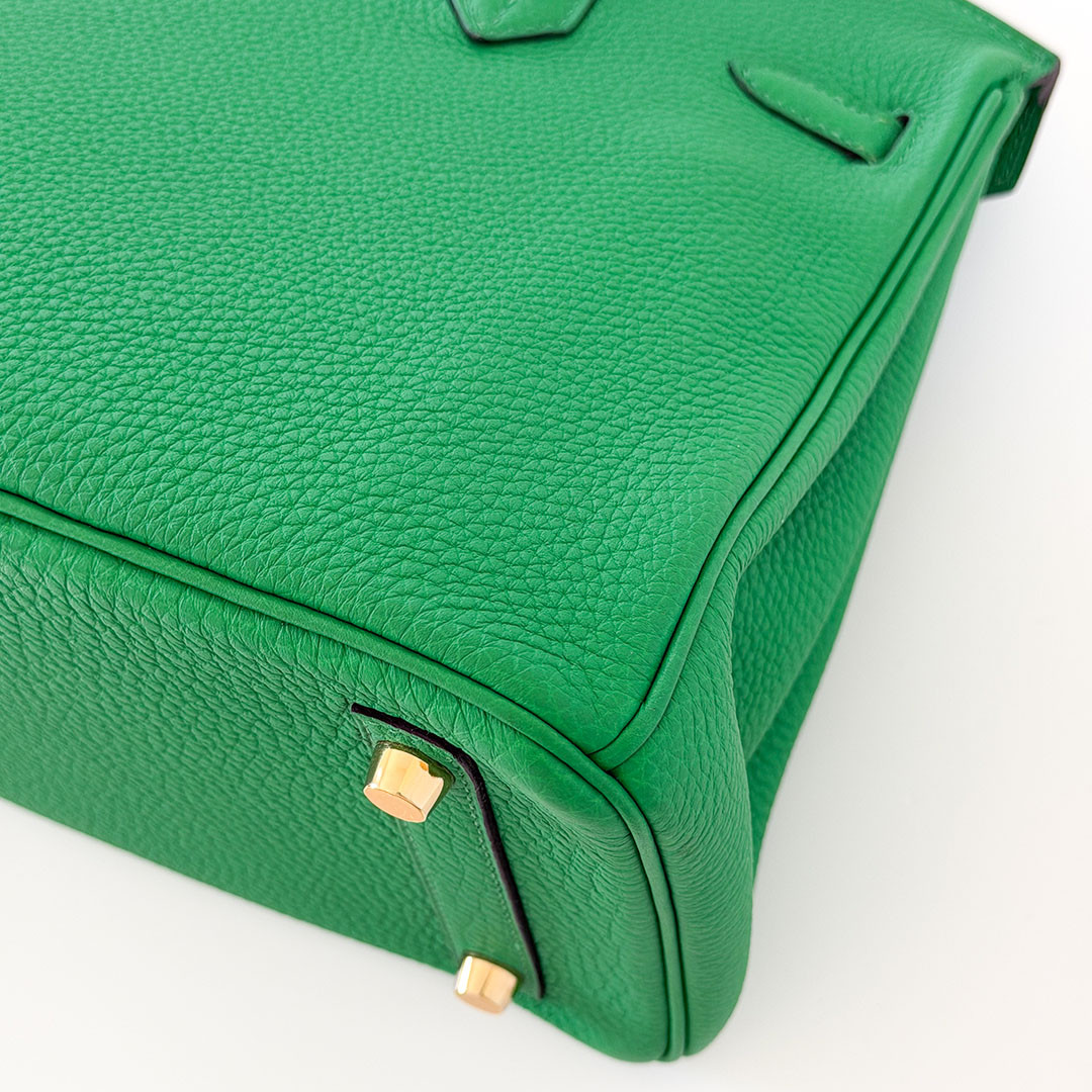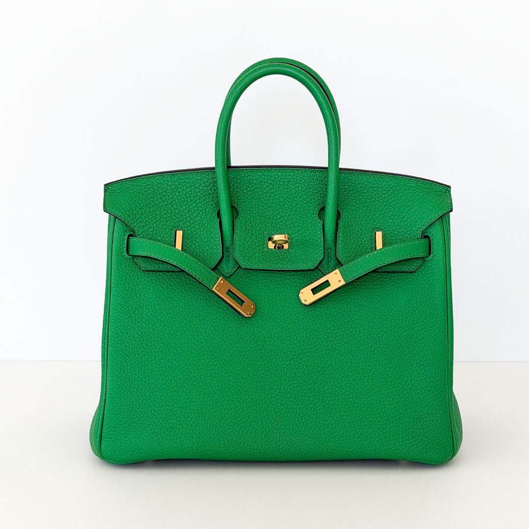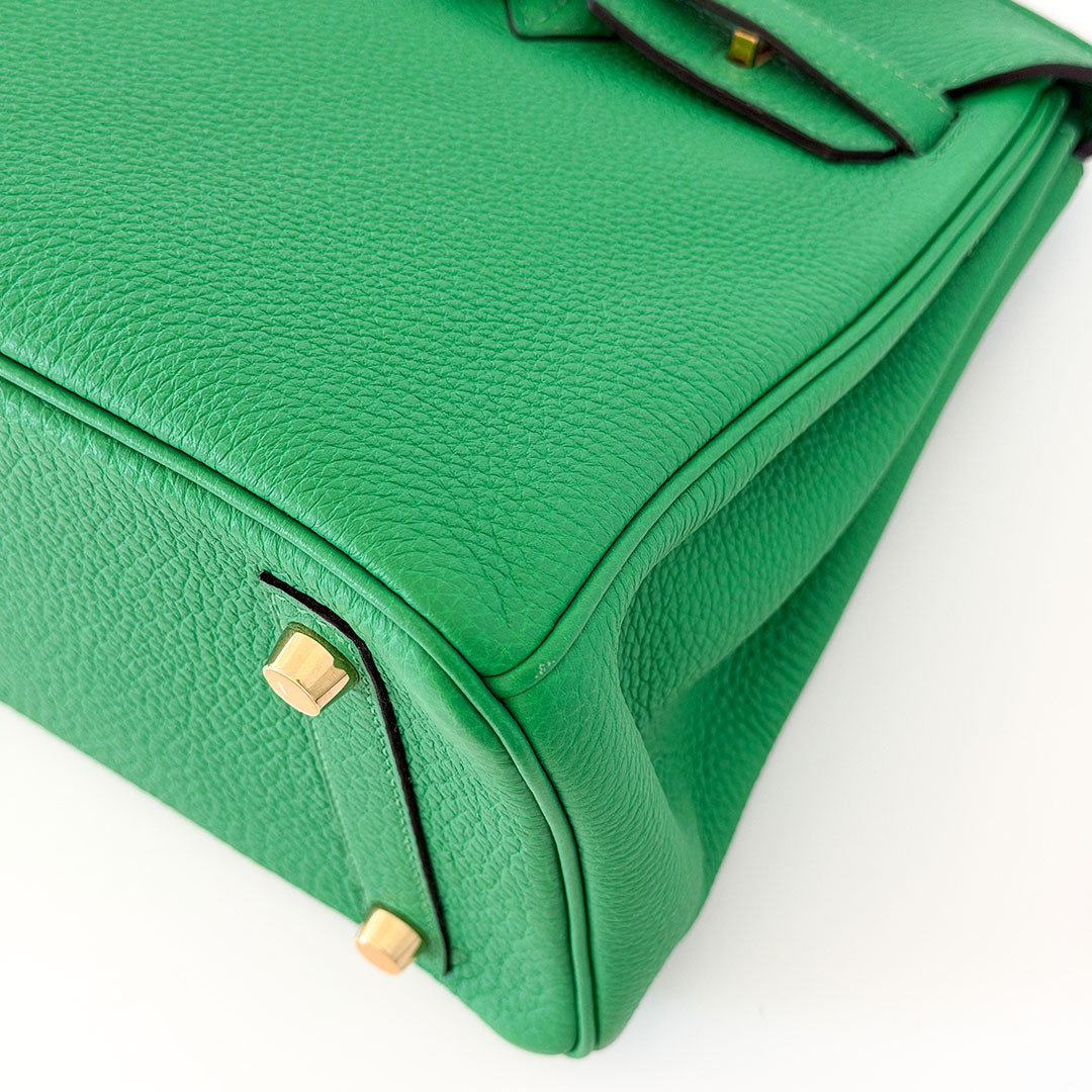 The Hermés Birkin 25cm Bambou Togo is a luxurious and timeless handbag. This rare and sought-after piece is crafted from grained calfskin leather, known for its durability and scratch resistance. This luxurious piece is designed to stand the test of time. The exquisite gold hardware beautifully complements the rich, saturated green leather. Perfectly sized at 25cm, this Birkin bag is spacious enough to hold all your essentials.