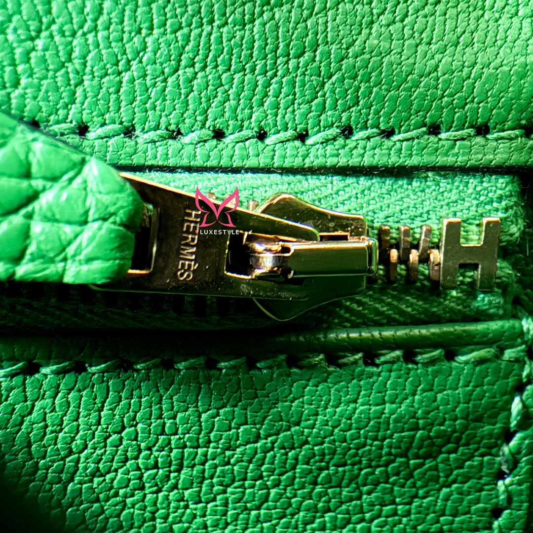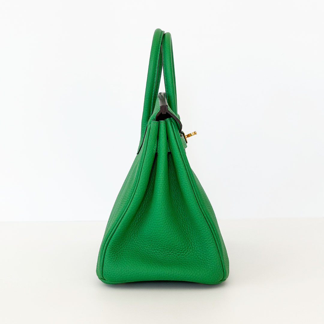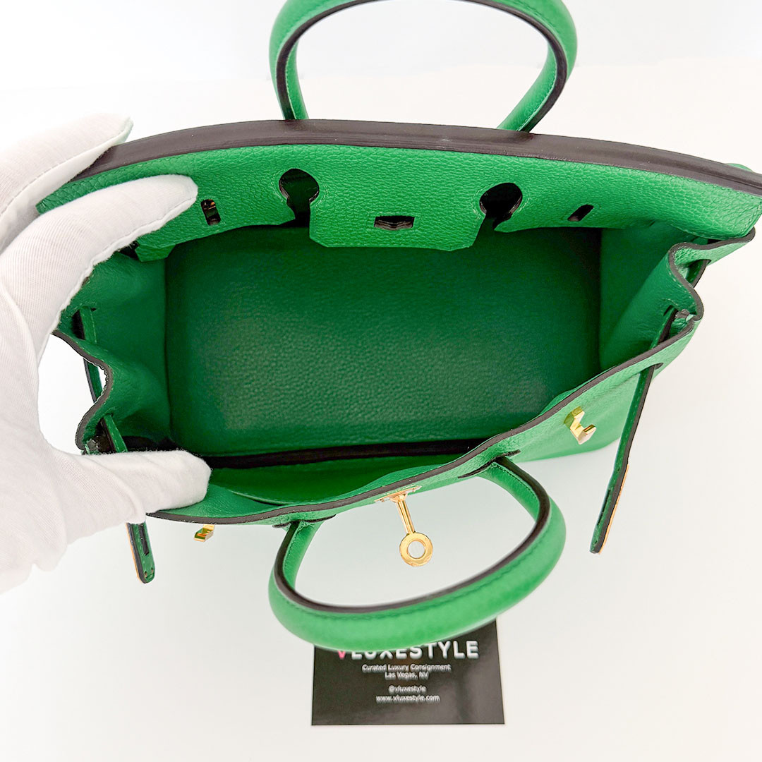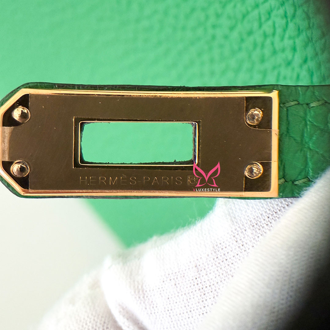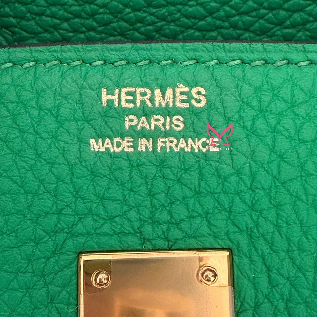 The Hermés Birkin 25cm Bambou Togo is a luxurious and timeless handbag. This rare and sought-after piece is crafted from grained calfskin leather, known for its durability and scratch resistance. This luxurious piece is designed to stand the test of time. The exquisite gold hardware beautifully complements the rich, saturated green leather. Perfectly sized at 25cm, this Birkin bag is spacious enough to hold all your essentials.