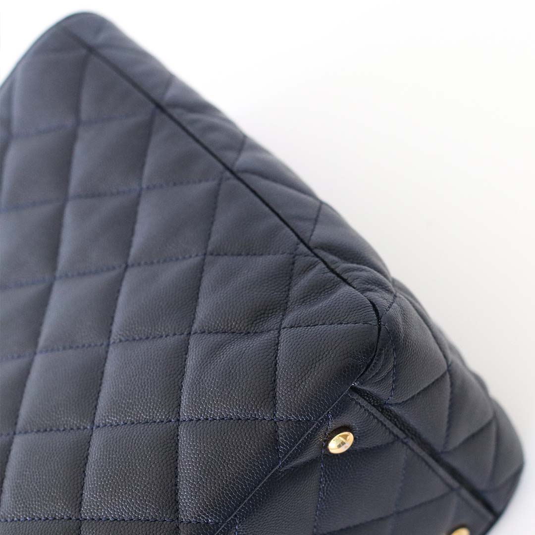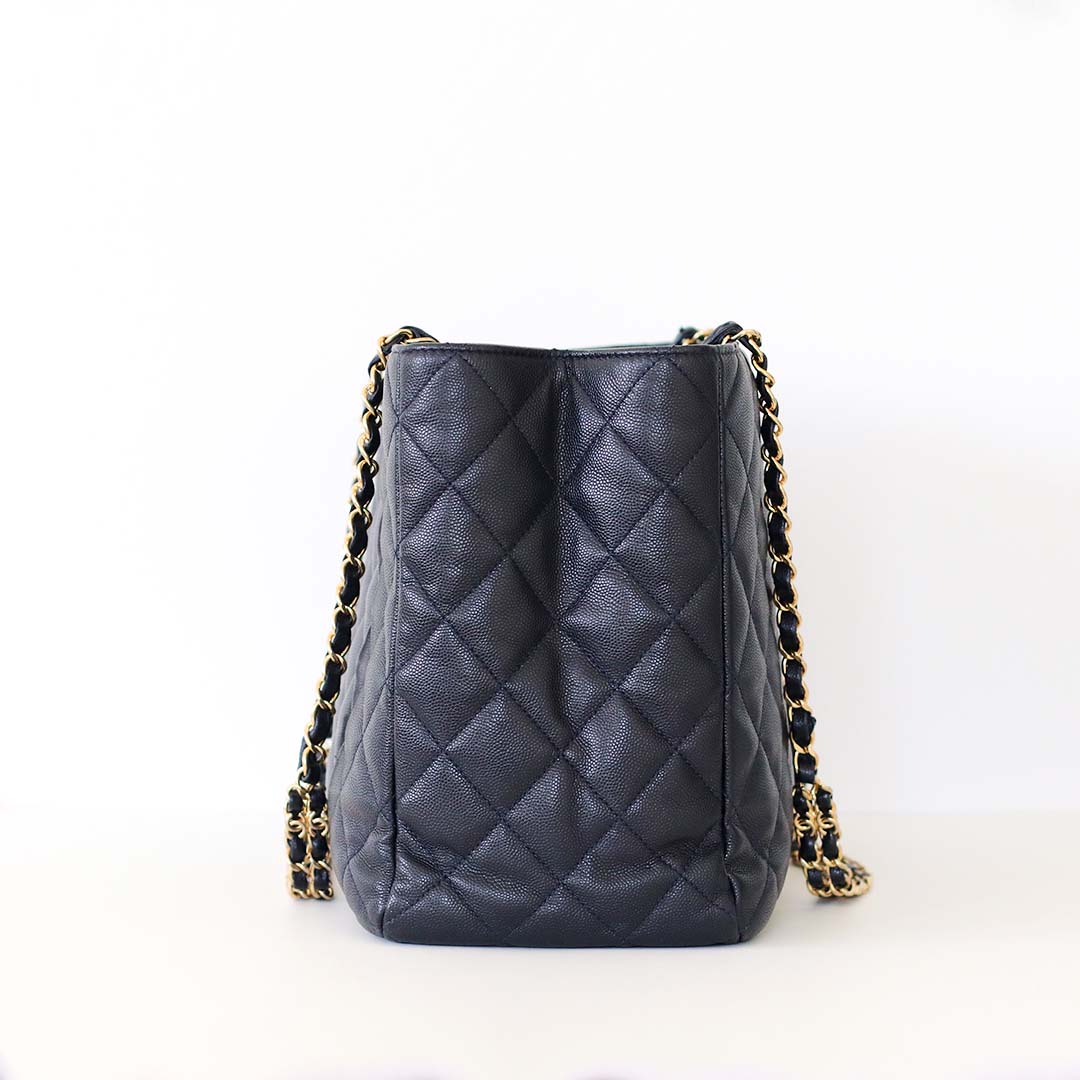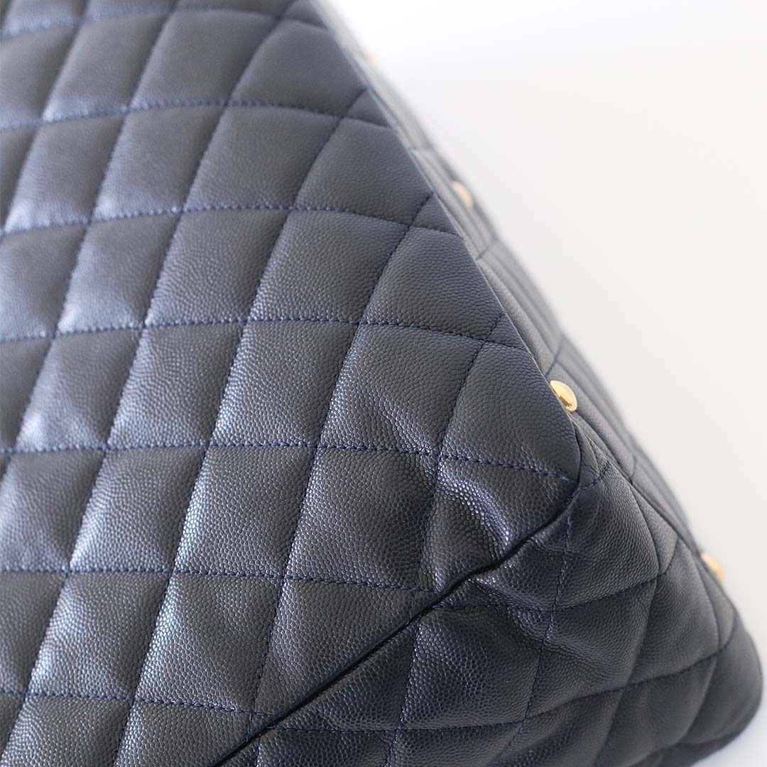 The Timeless Tote 22K in Navy Quilted Caviar is an exquisite piece from Chanel that seamlessly combines elegance and functionality—crafted from diamond-quilted calfskin caviar leather in an elegant navy color, complemented by luxurious brushed gold hardware. The tote features a unique leather-threaded, brushed gold chain-link strap with chic chain details. It features the iconic Chanel CC logo on the front. This tote is not only a statement piece but also a versatile accessory for your daily essentials.