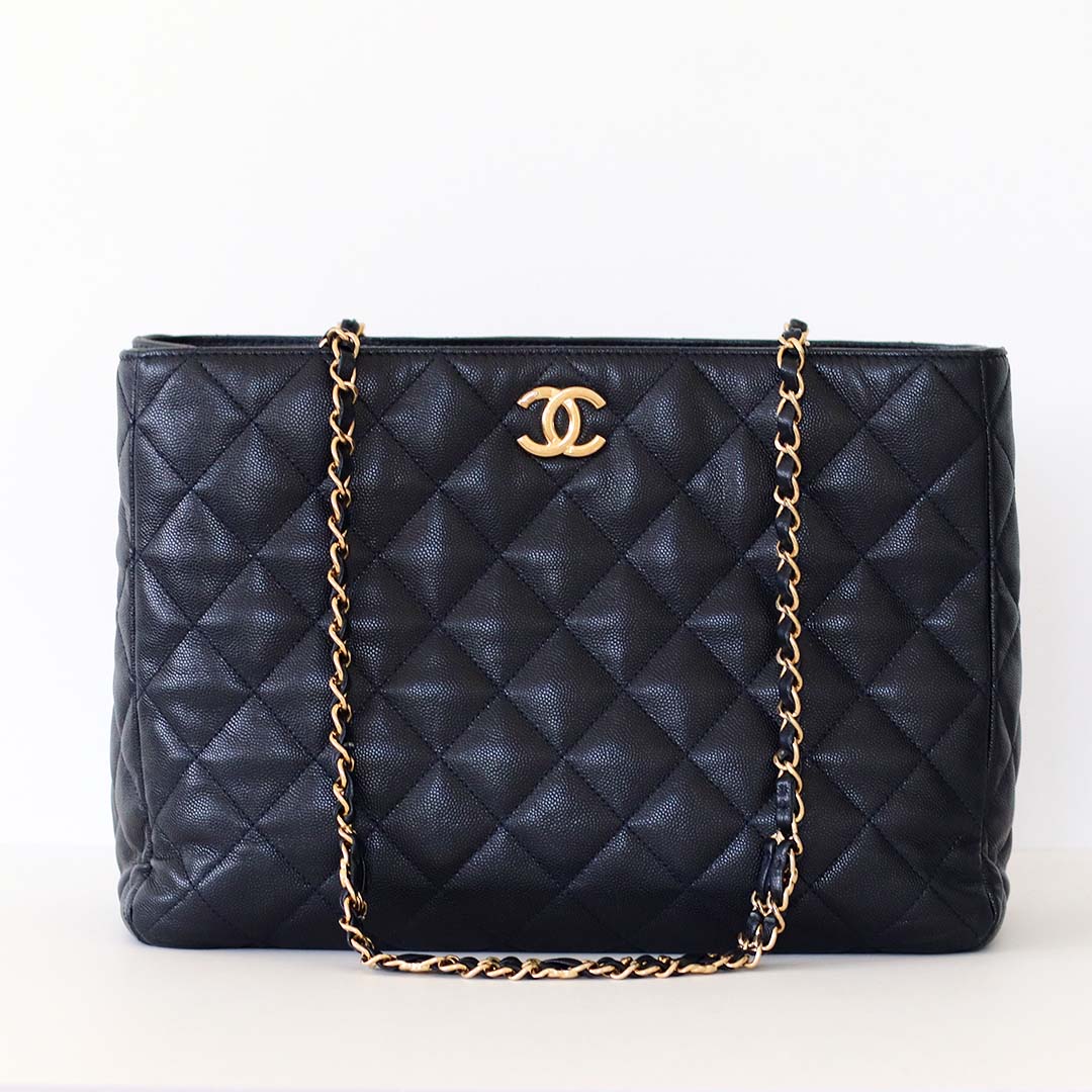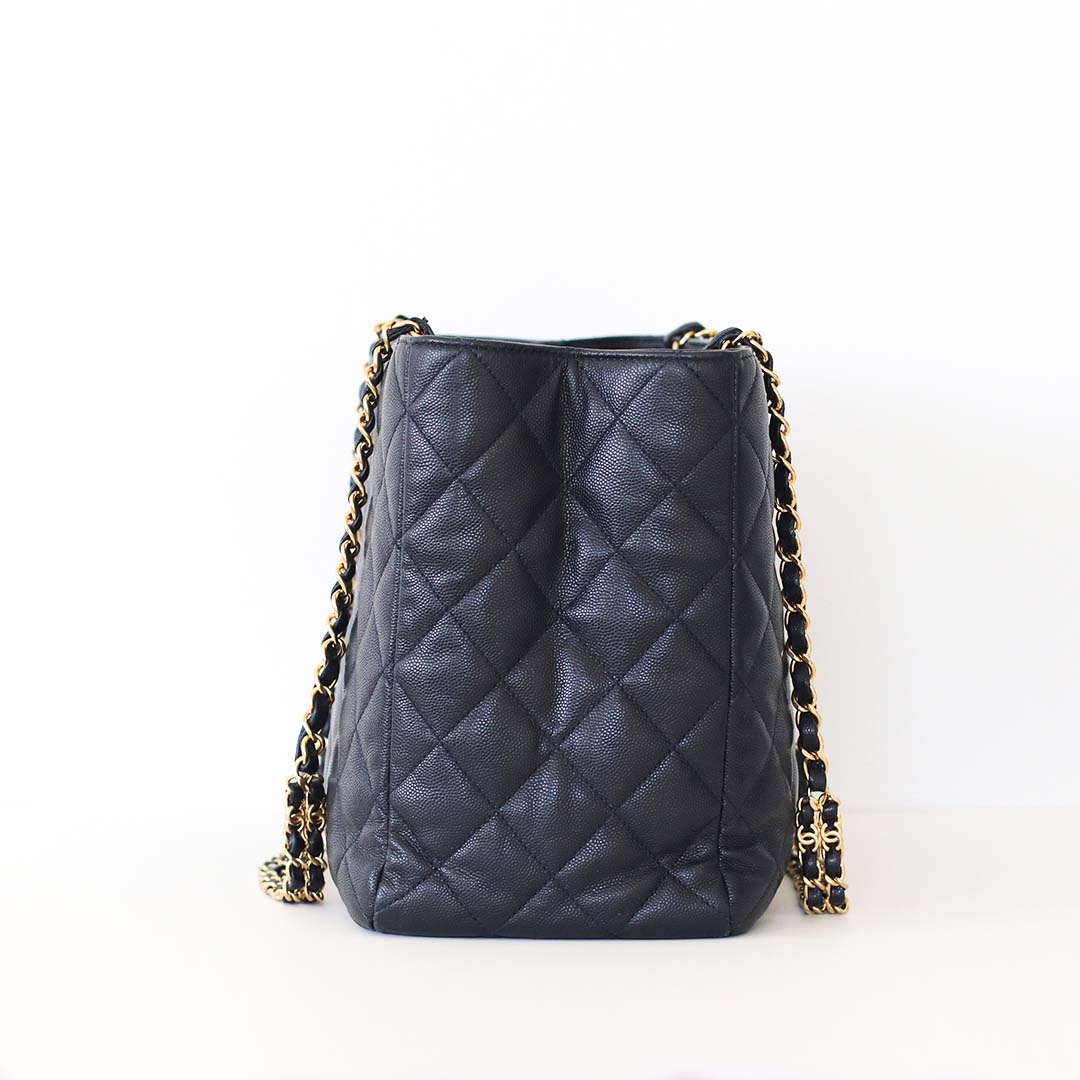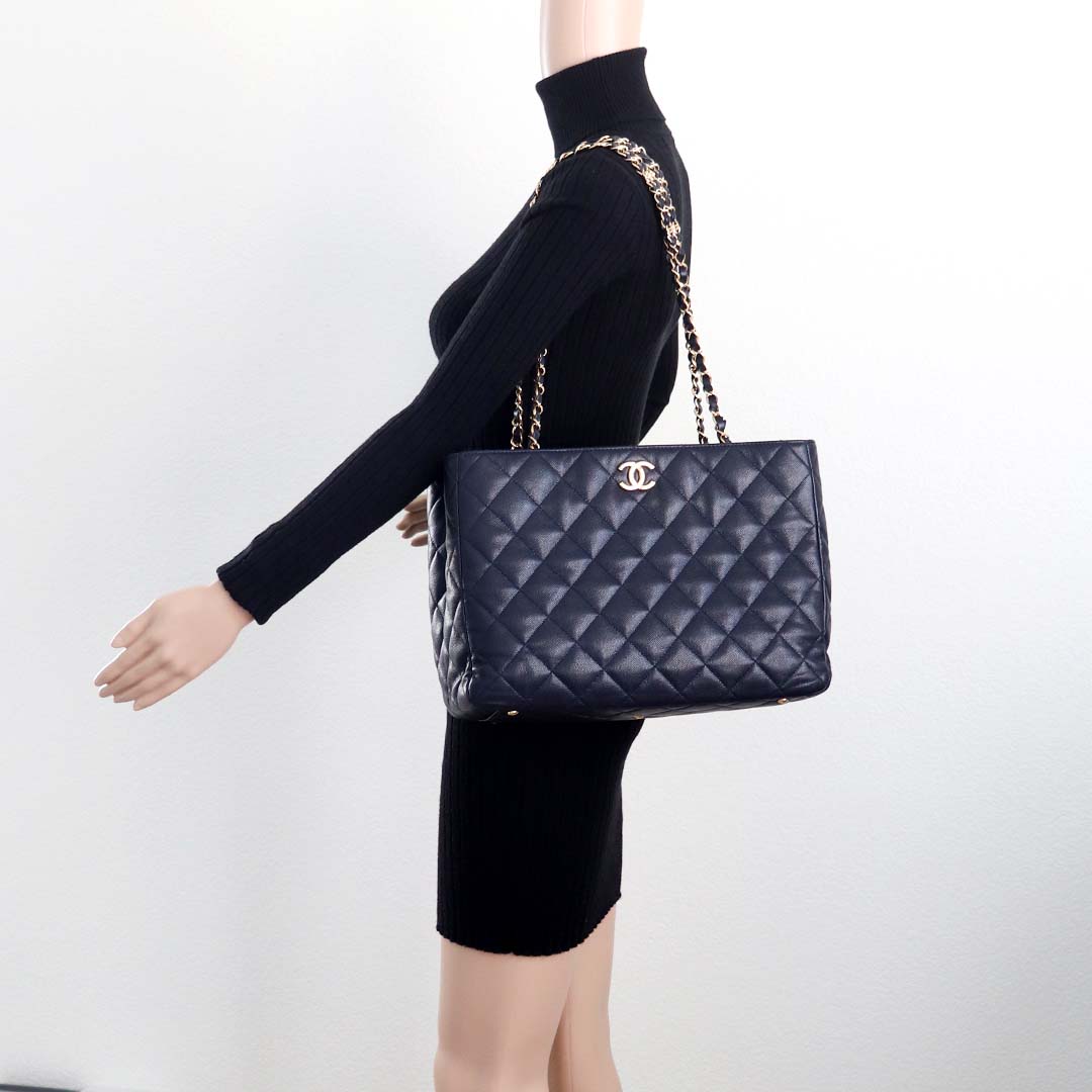 The Timeless Tote 22K in Navy Quilted Caviar is an exquisite piece from Chanel that seamlessly combines elegance and functionality—crafted from diamond-quilted calfskin caviar leather in an elegant navy color, complemented by luxurious brushed gold hardware. The tote features a unique leather-threaded, brushed gold chain-link strap with chic chain details. It features the iconic Chanel CC logo on the front. This tote is not only a statement piece but also a versatile accessory for your daily essentials.