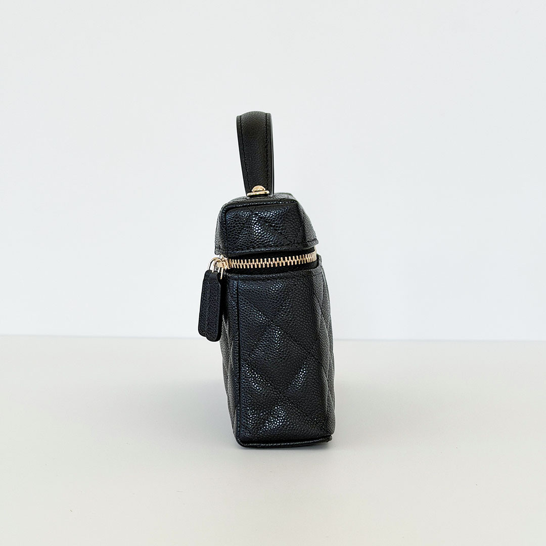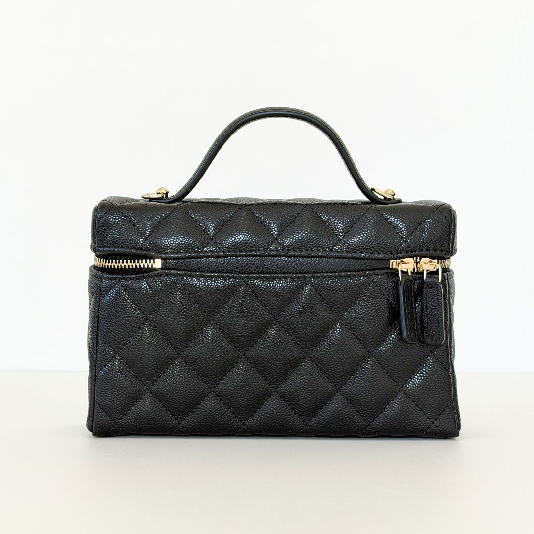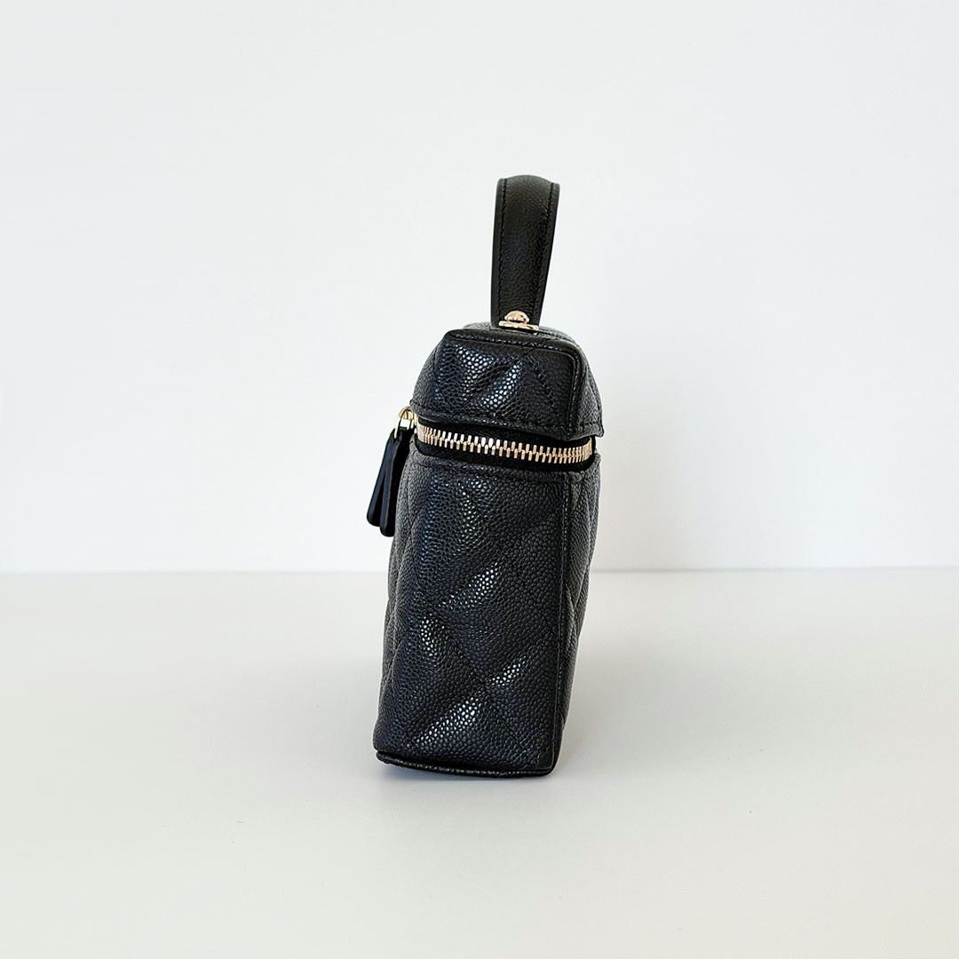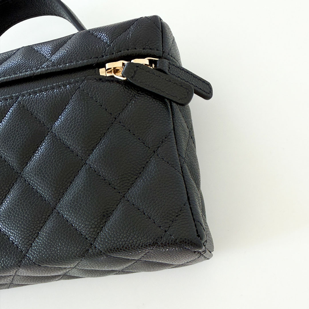 The CHANEL Vanity Top Handle Bag with Chain 26C Black Quilted Caviar. Crafted from luxurious black leather, it features a chain-threaded leather strap that offers versatility in styling, so you can wear it over your shoulder, cross-body, or carry it elegantly by the top handle. The light gold hardware and the classic CHANEL quilting add a timeless touch to the contemporary design.